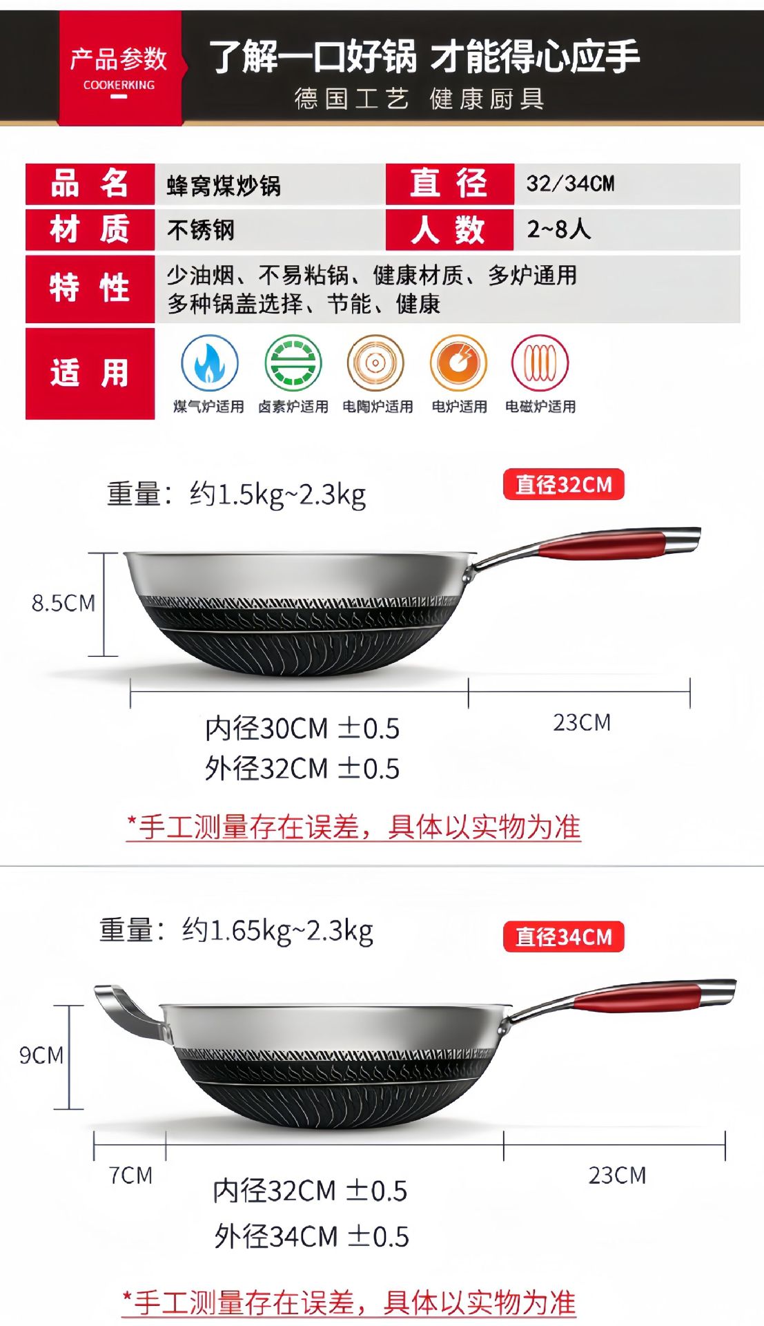 | 規格 | 36cm【帶蓋】蜂窩炒鍋 帶側耳 |