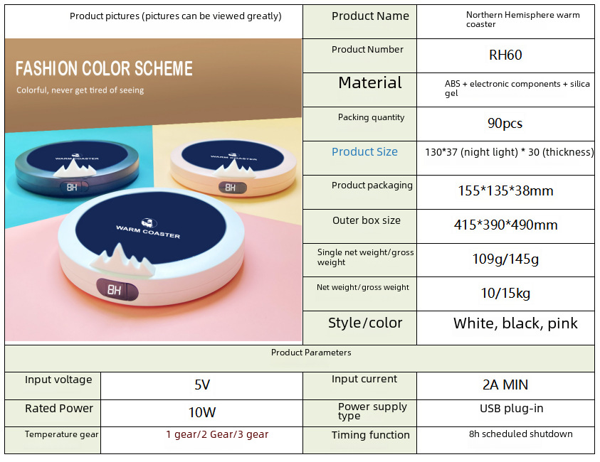 恕不受理因電壓不適用的退貨申請。 - Three-Step Temperature Control:This smart thermostat cup pad features a three-step temperature control, allowing you to adjust the heat level according to your preference.