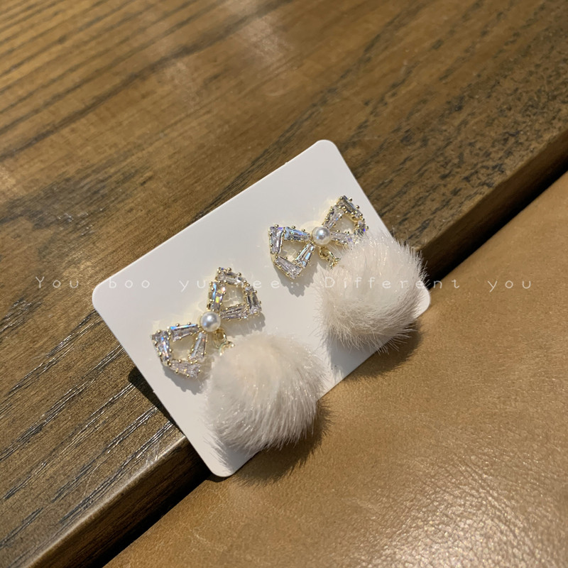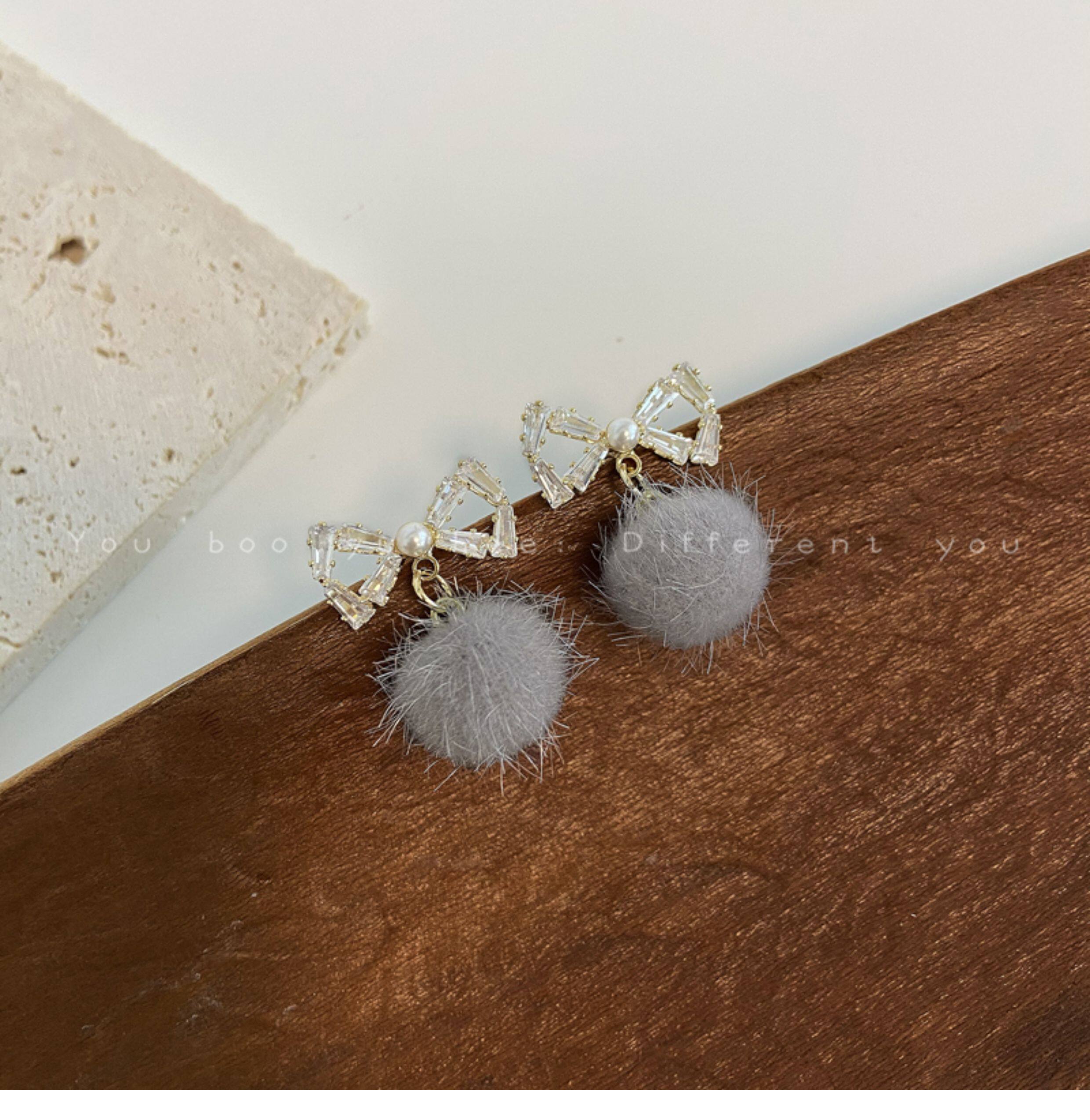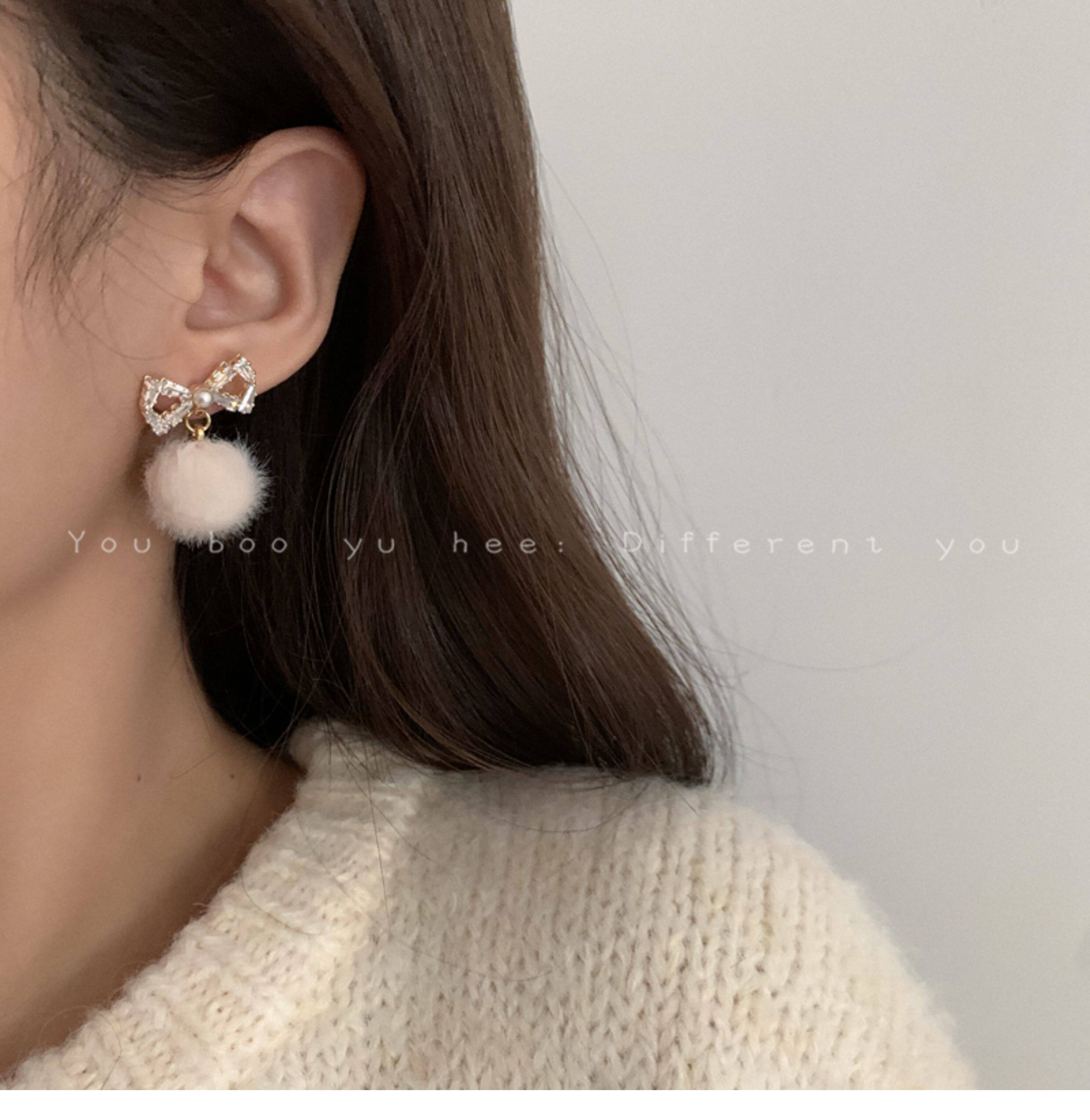 2026新款蝴蝶結毛絨毛球耳釘女小衆高級感可愛耳環甜美獨特耳飾品