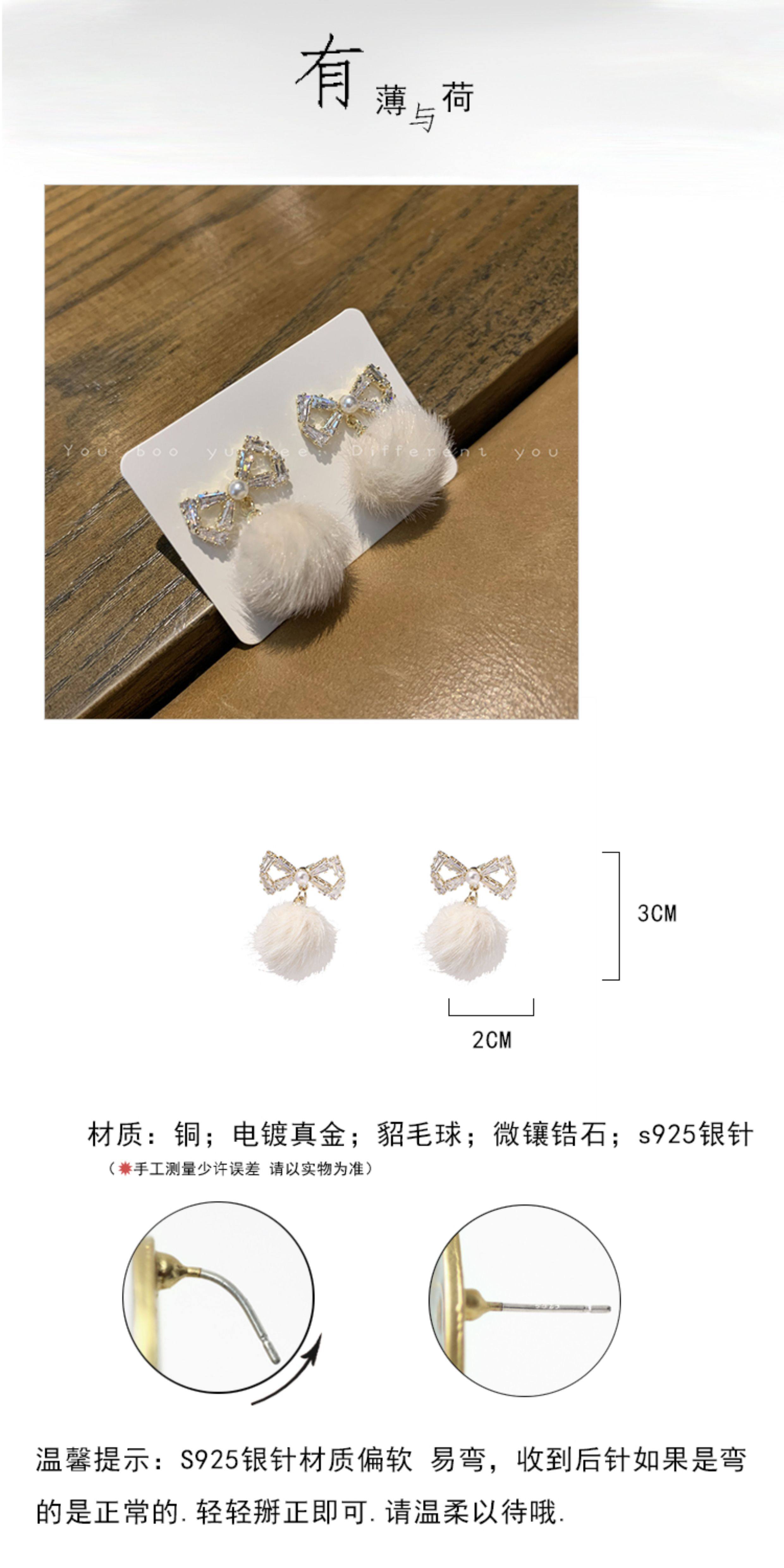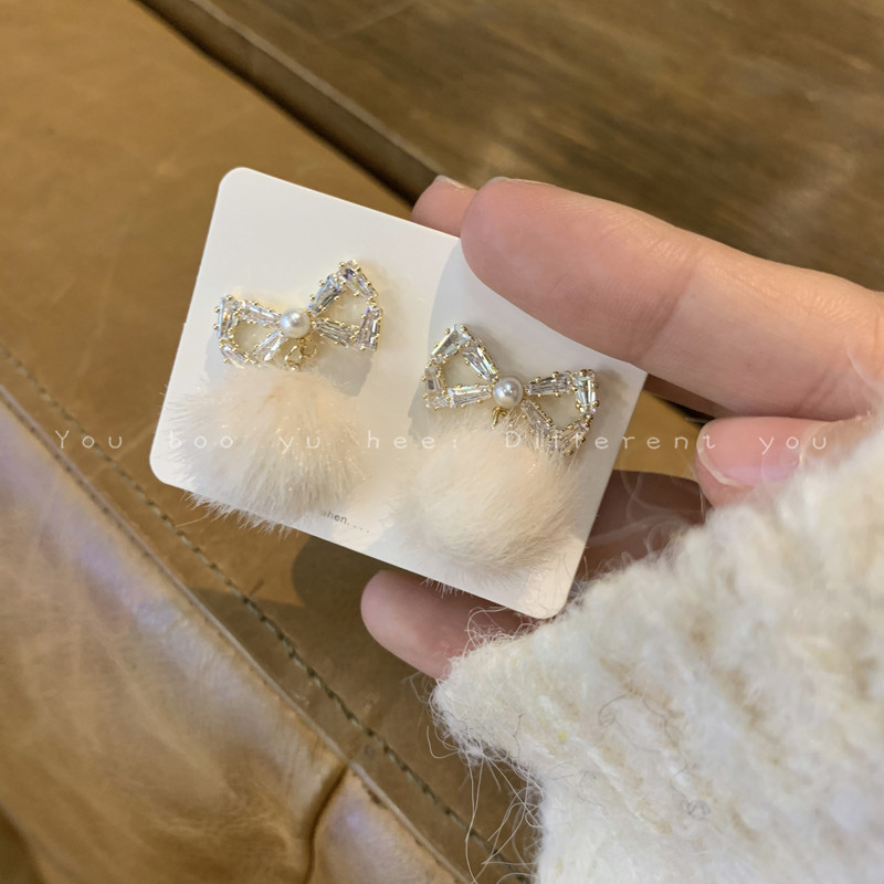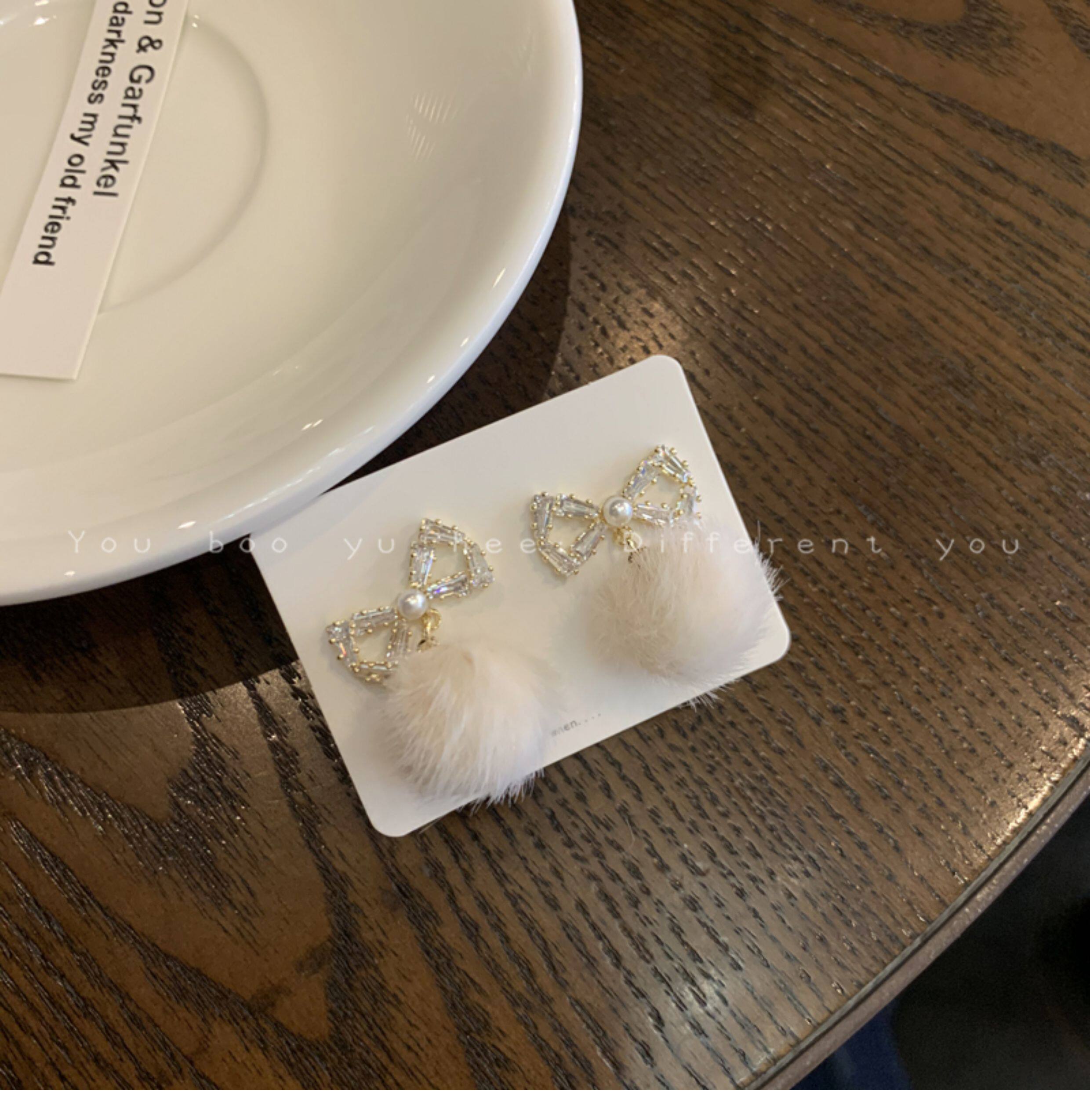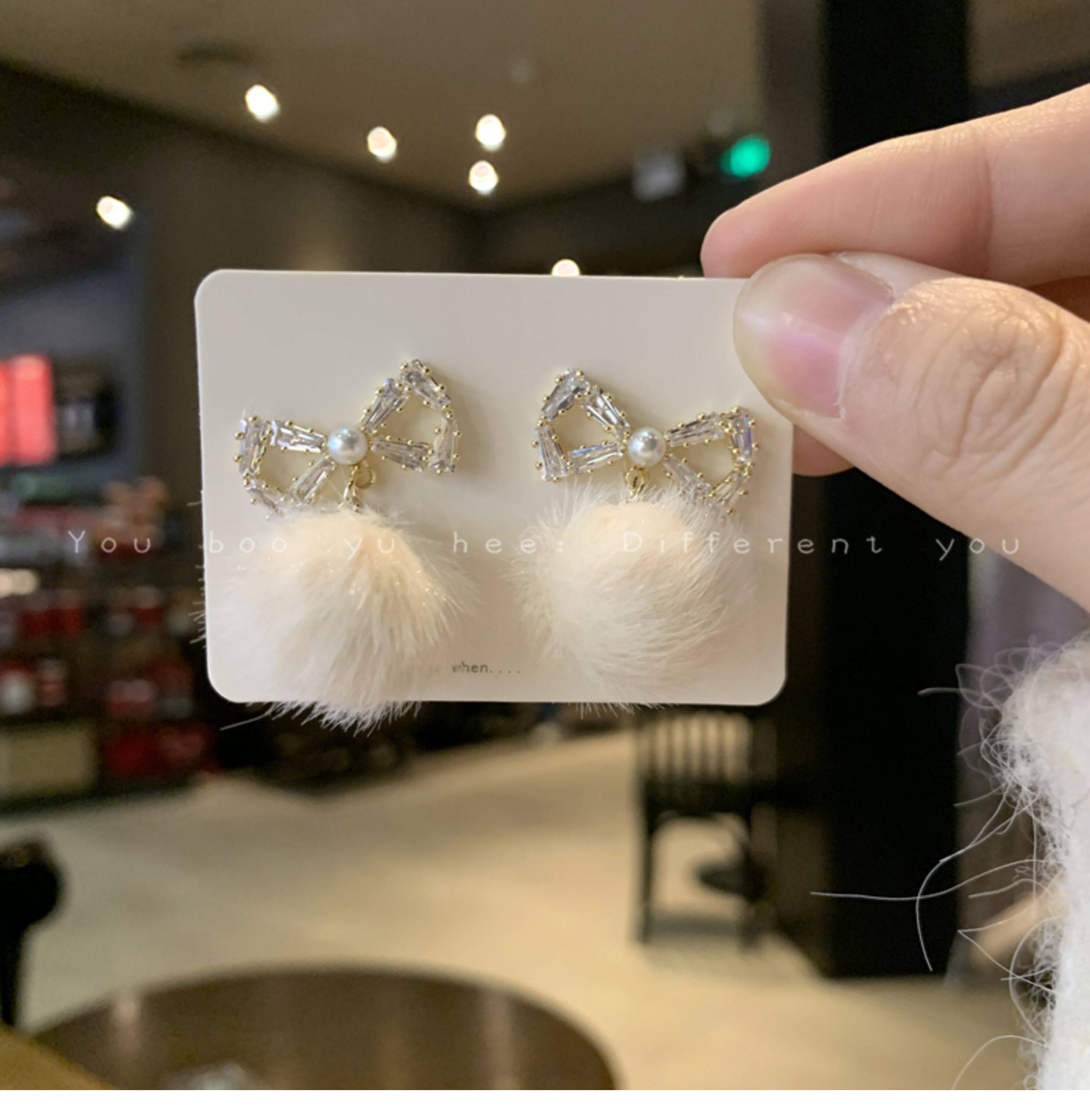 2026新款蝴蝶結毛絨毛球耳釘女小衆高級感可愛耳環甜美獨特耳飾品
