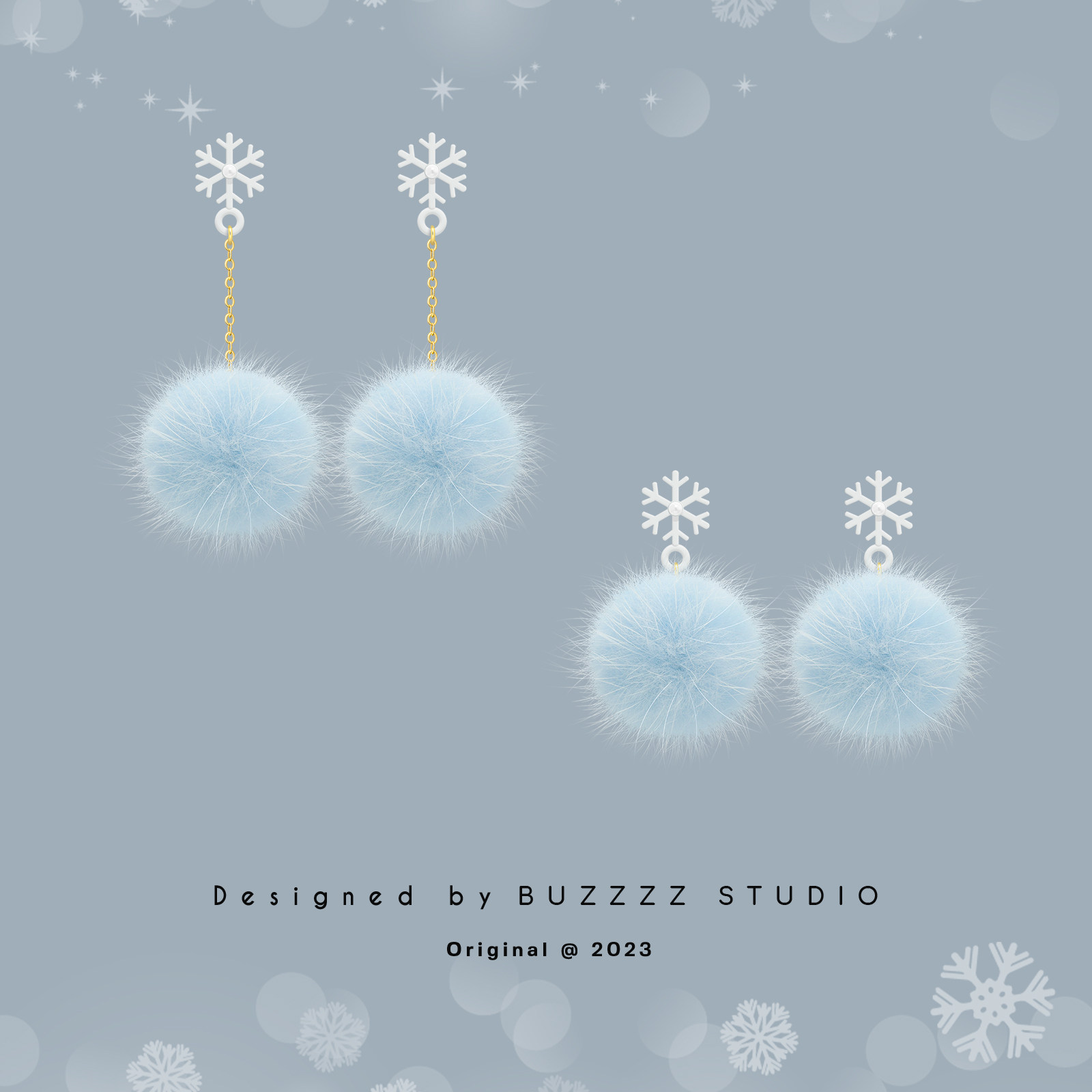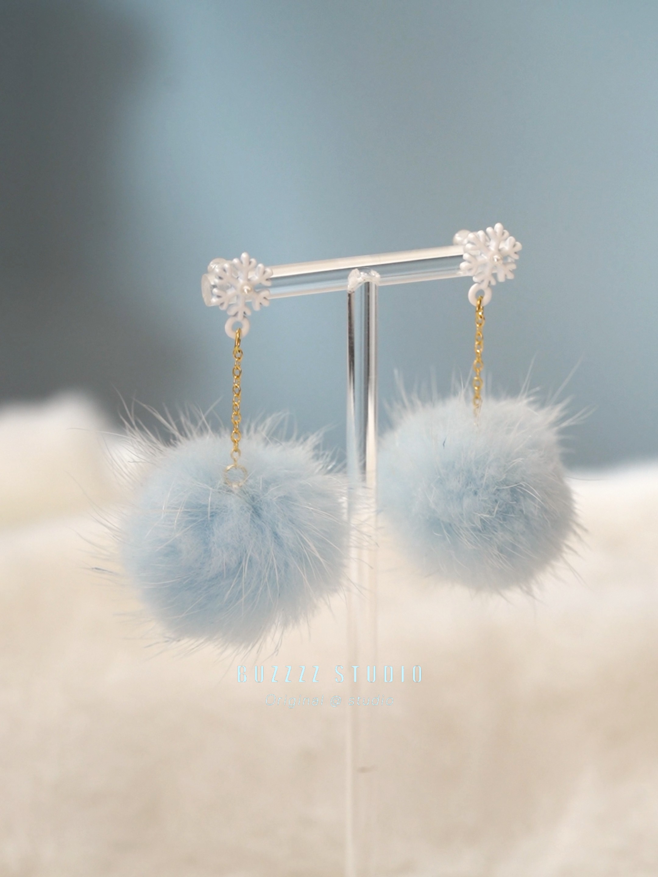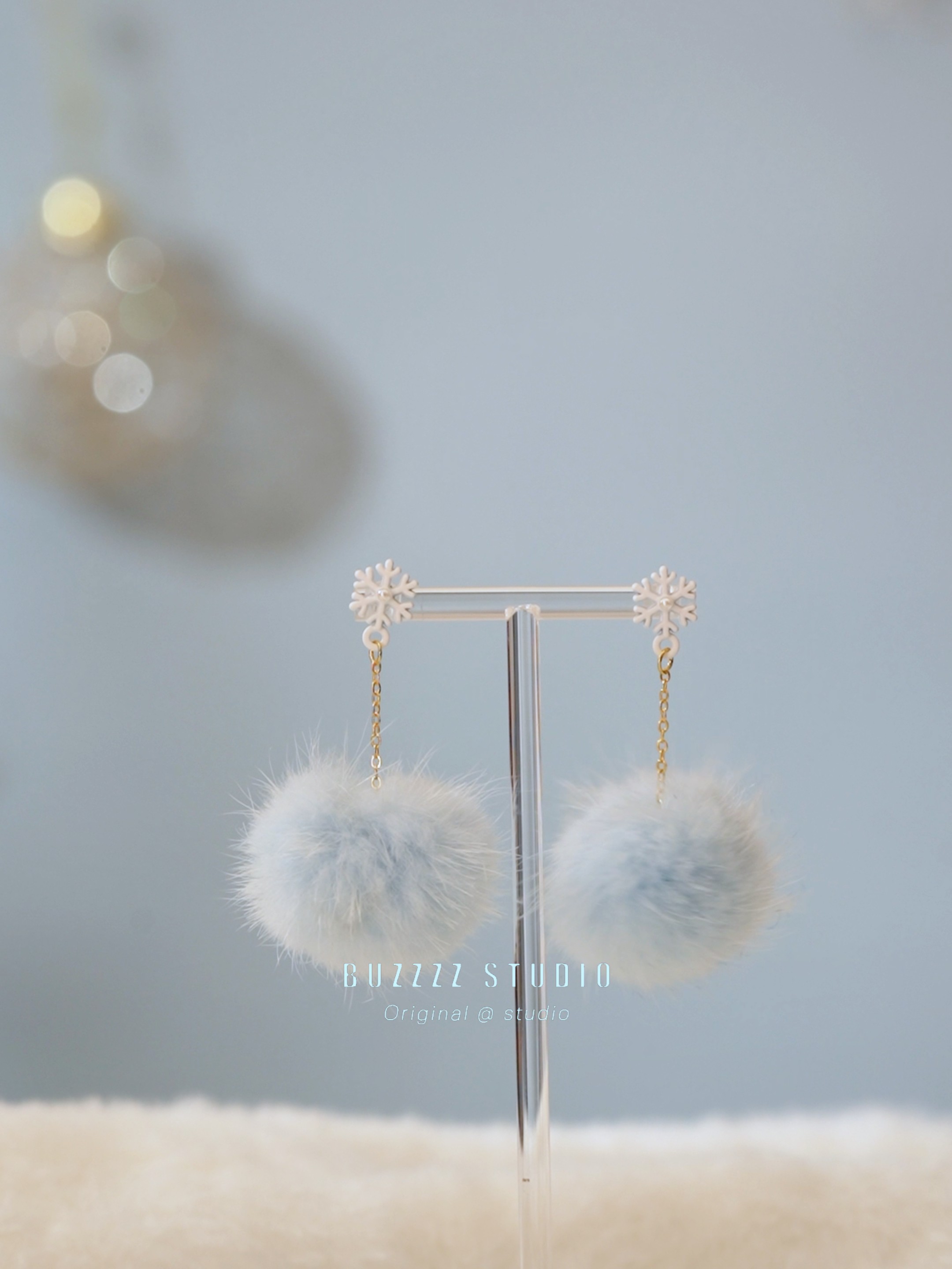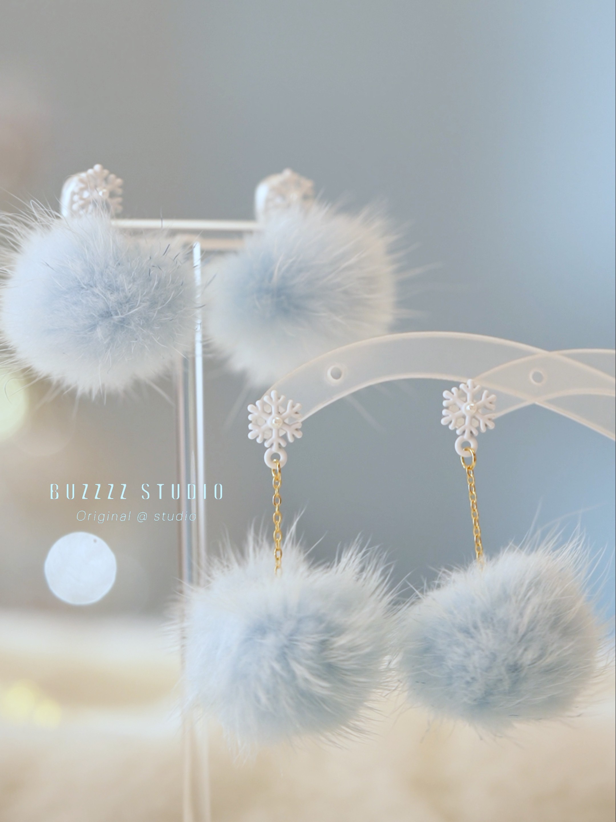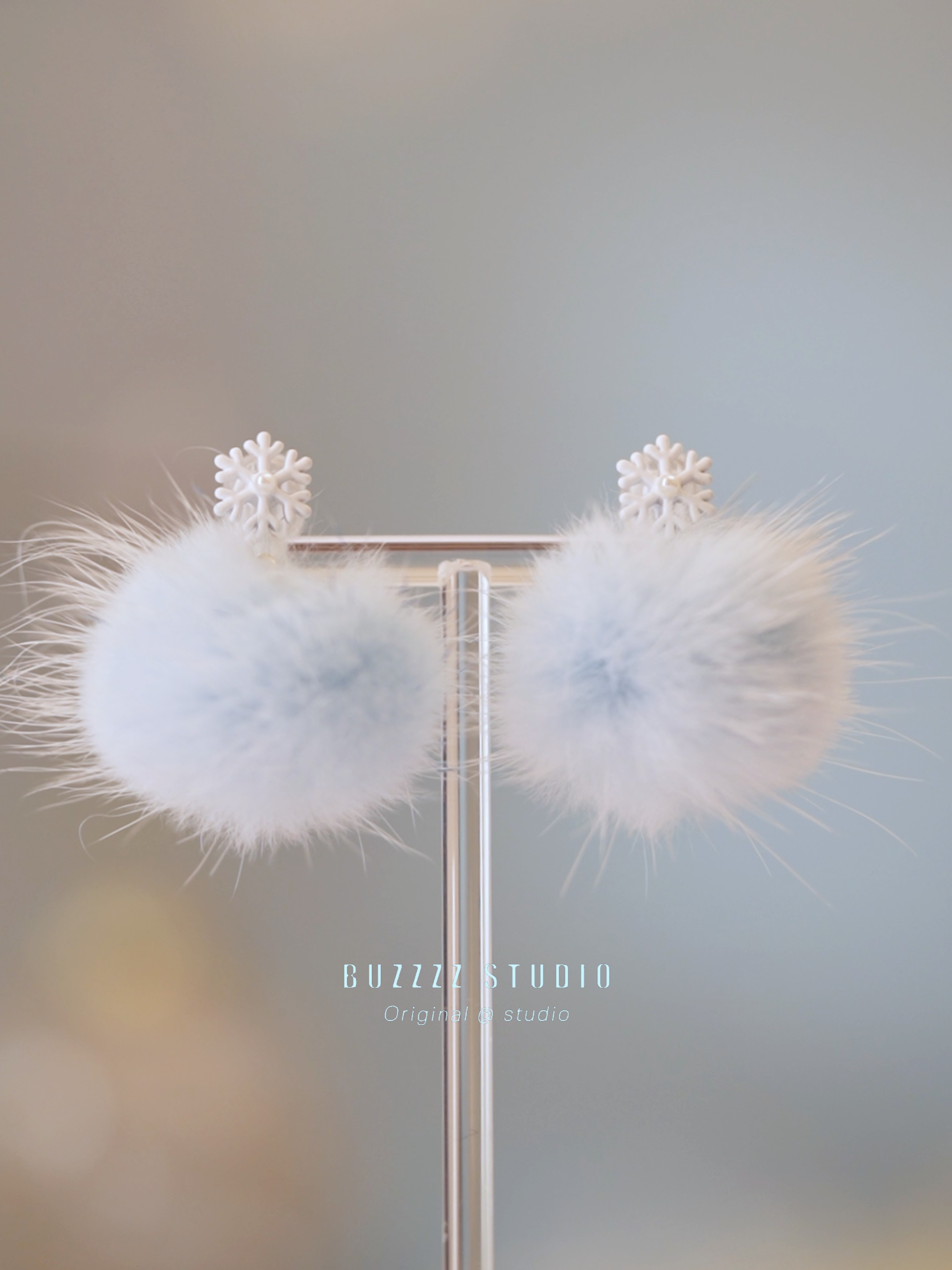 原創白色雪花毛絨毛球耳釘冬季氣質銀針長款耳環無耳洞耳夾耳飾