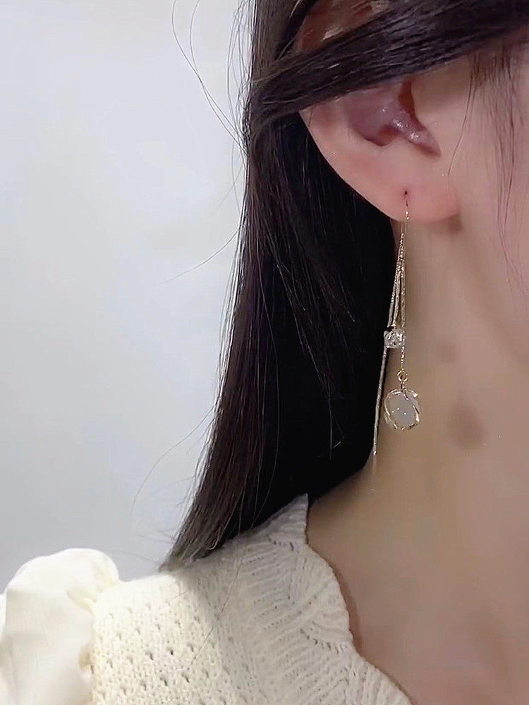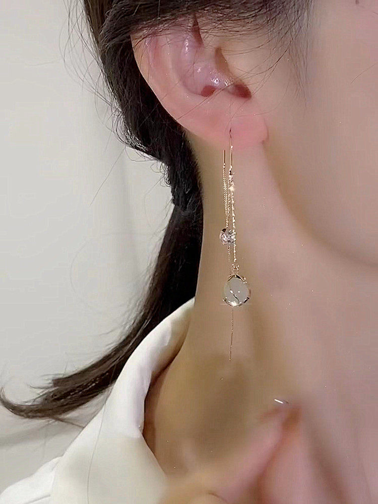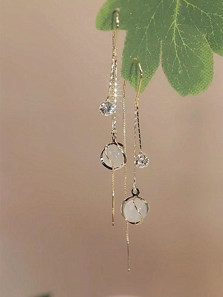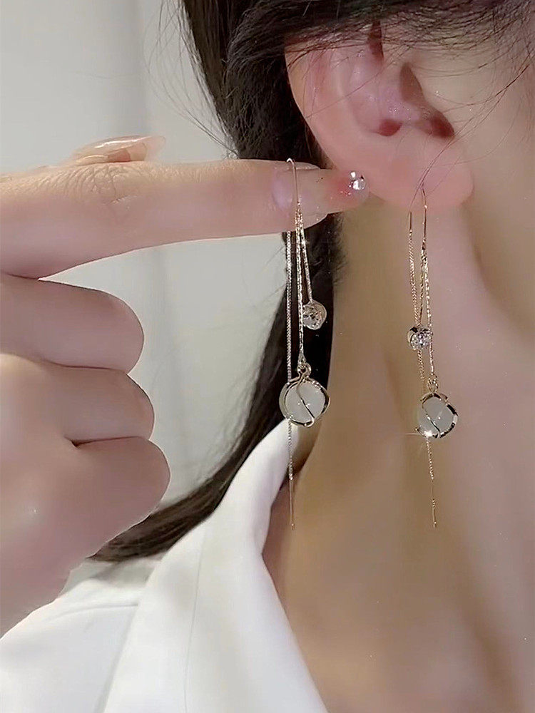 時尚貓眼石流蘇耳線超仙長款圓臉耳環2025年新款氣質輕奢小衆耳飾