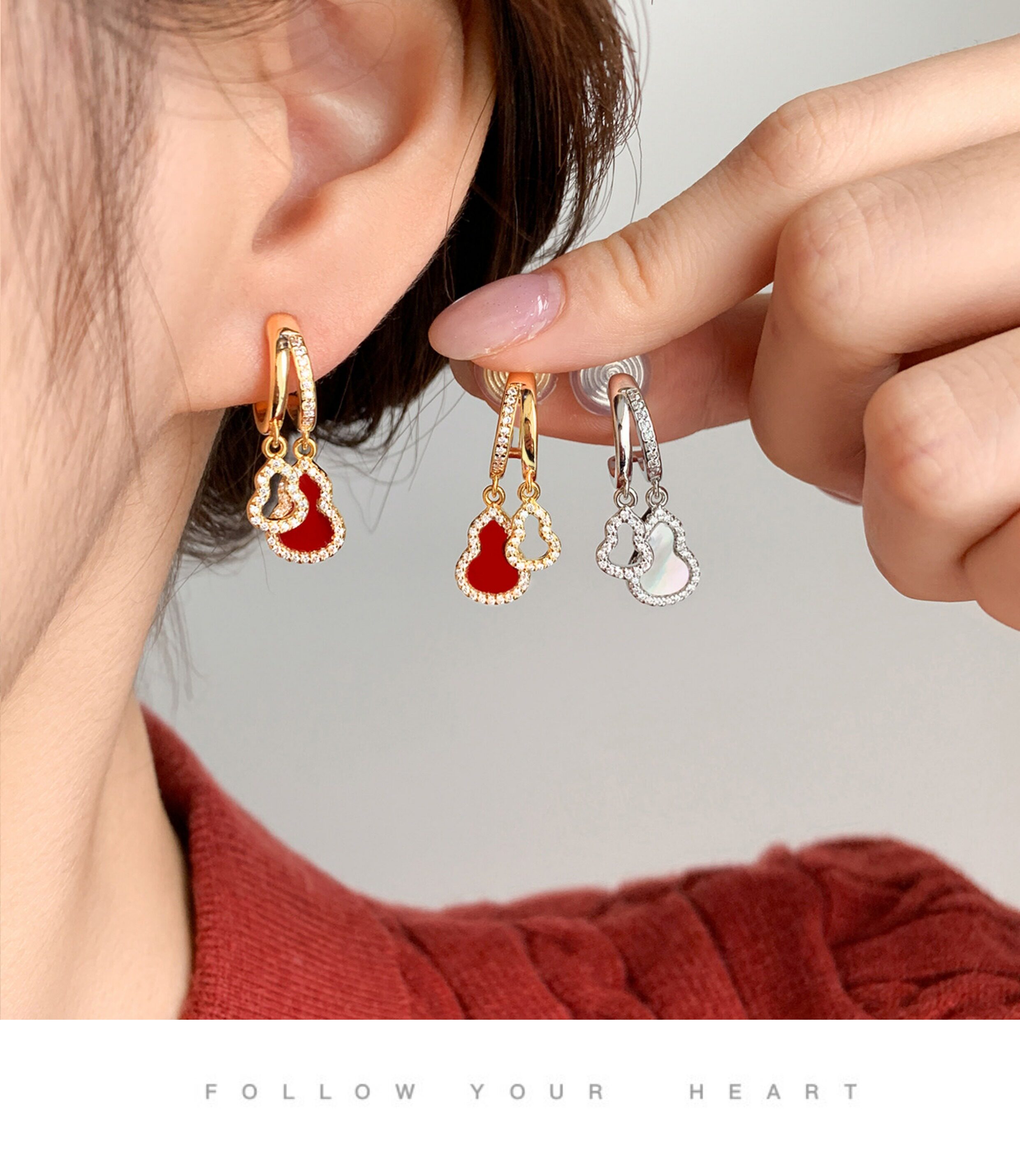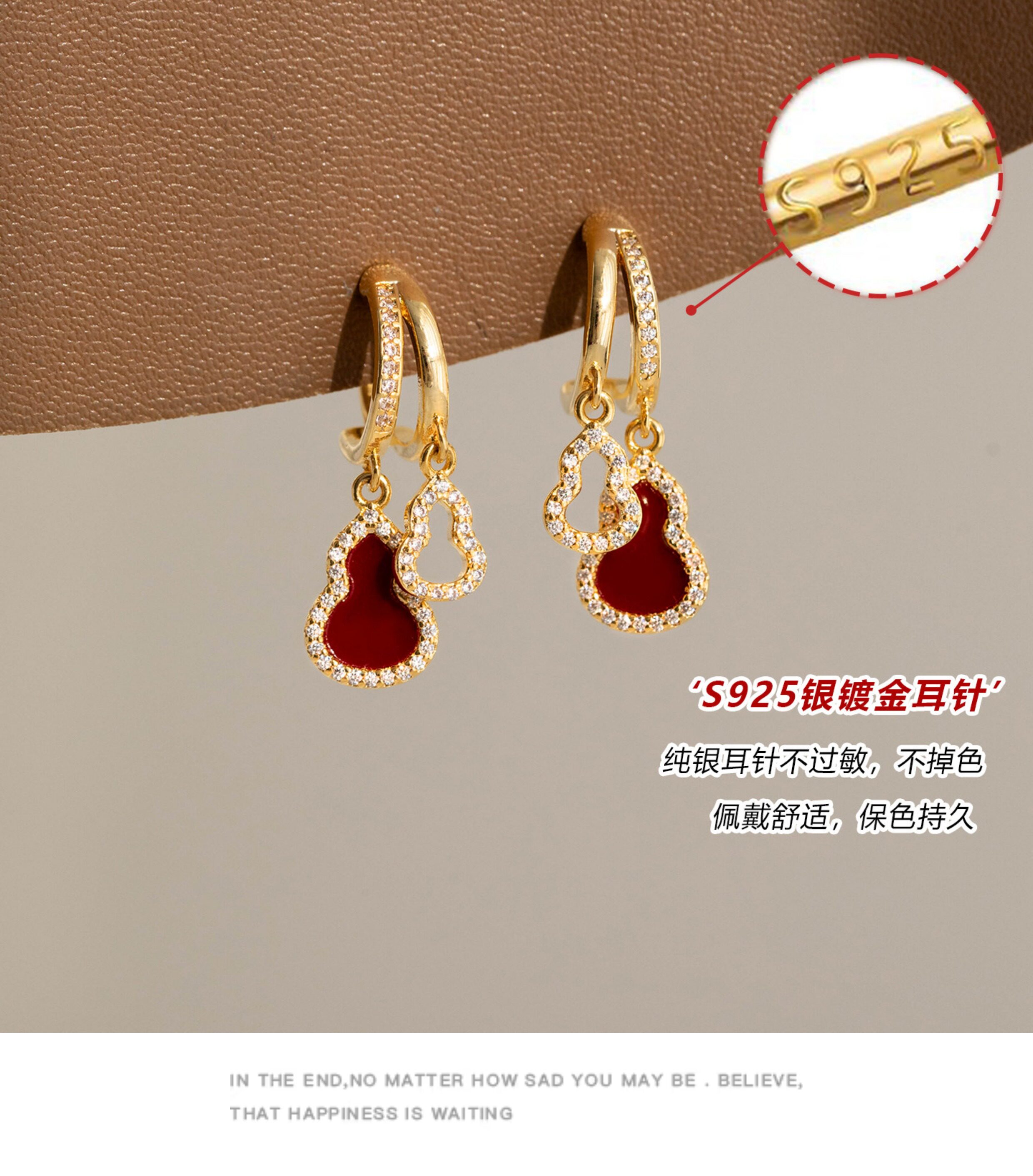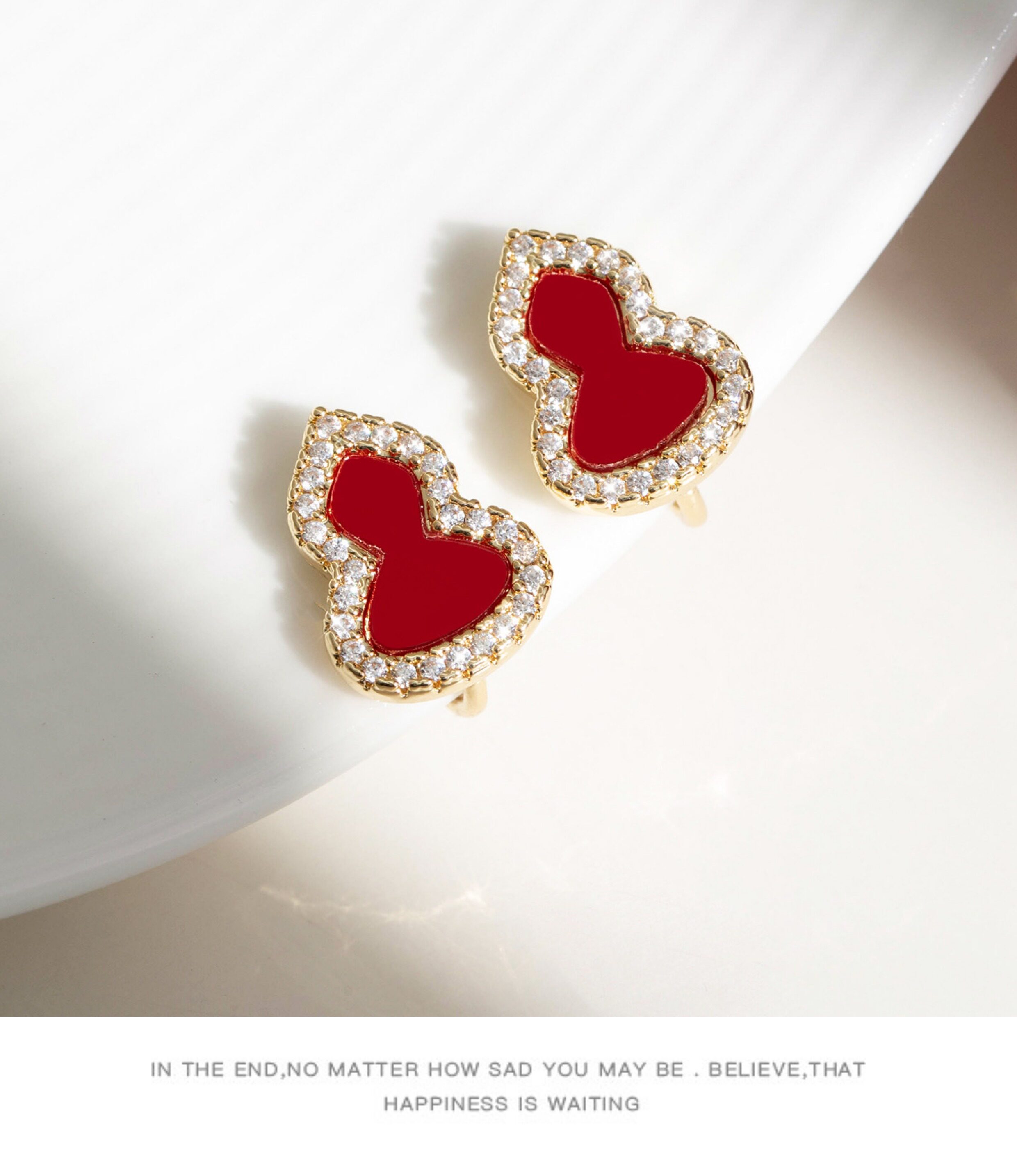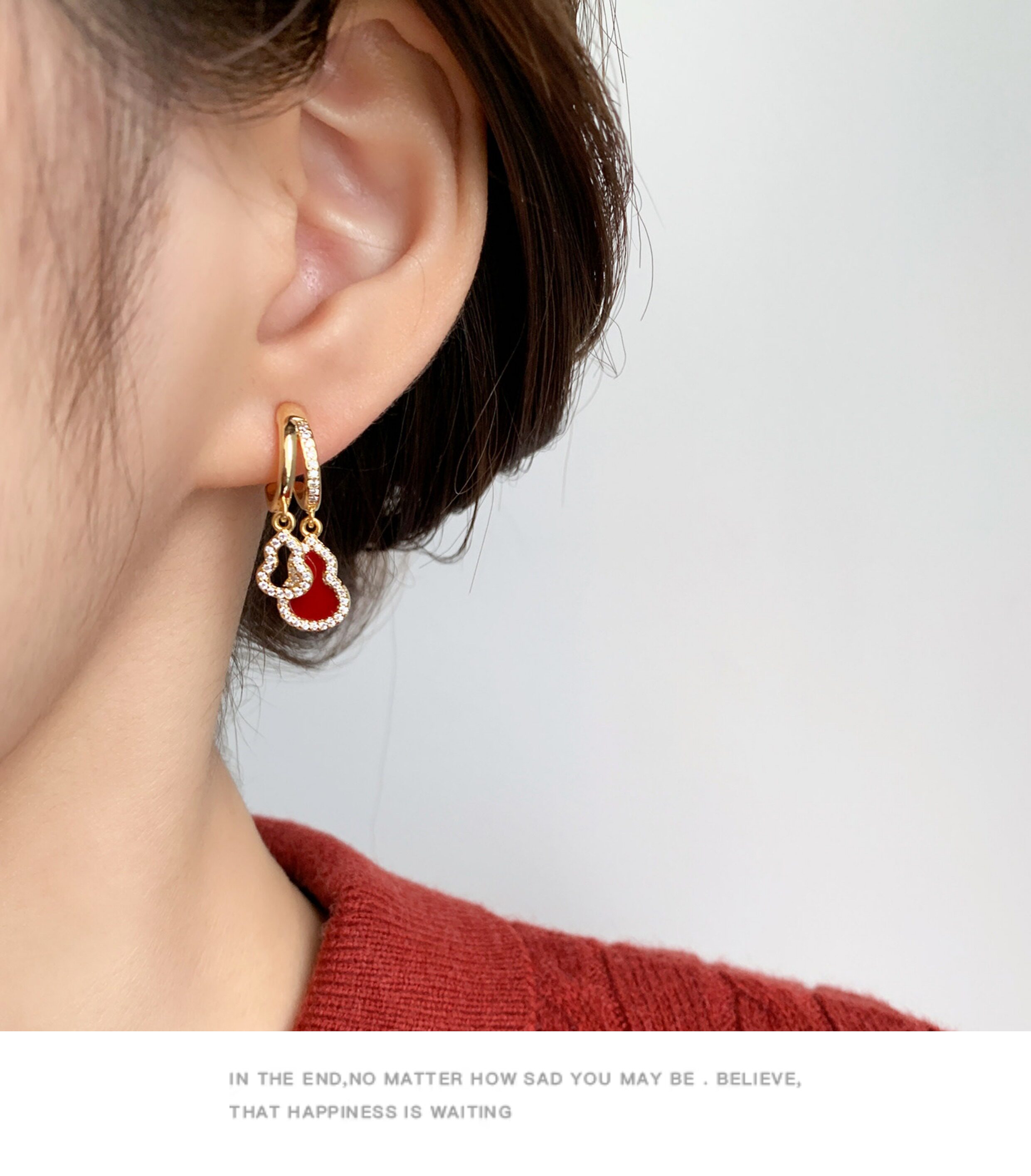 「青芥」新中式天然貝母葫蘆耳環國風輕奢紅色旺財耳飾無耳洞耳夾