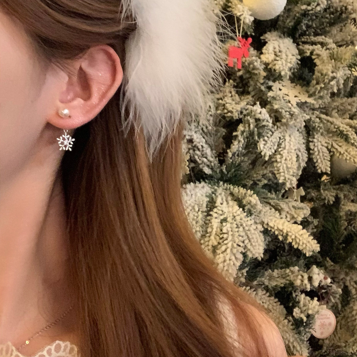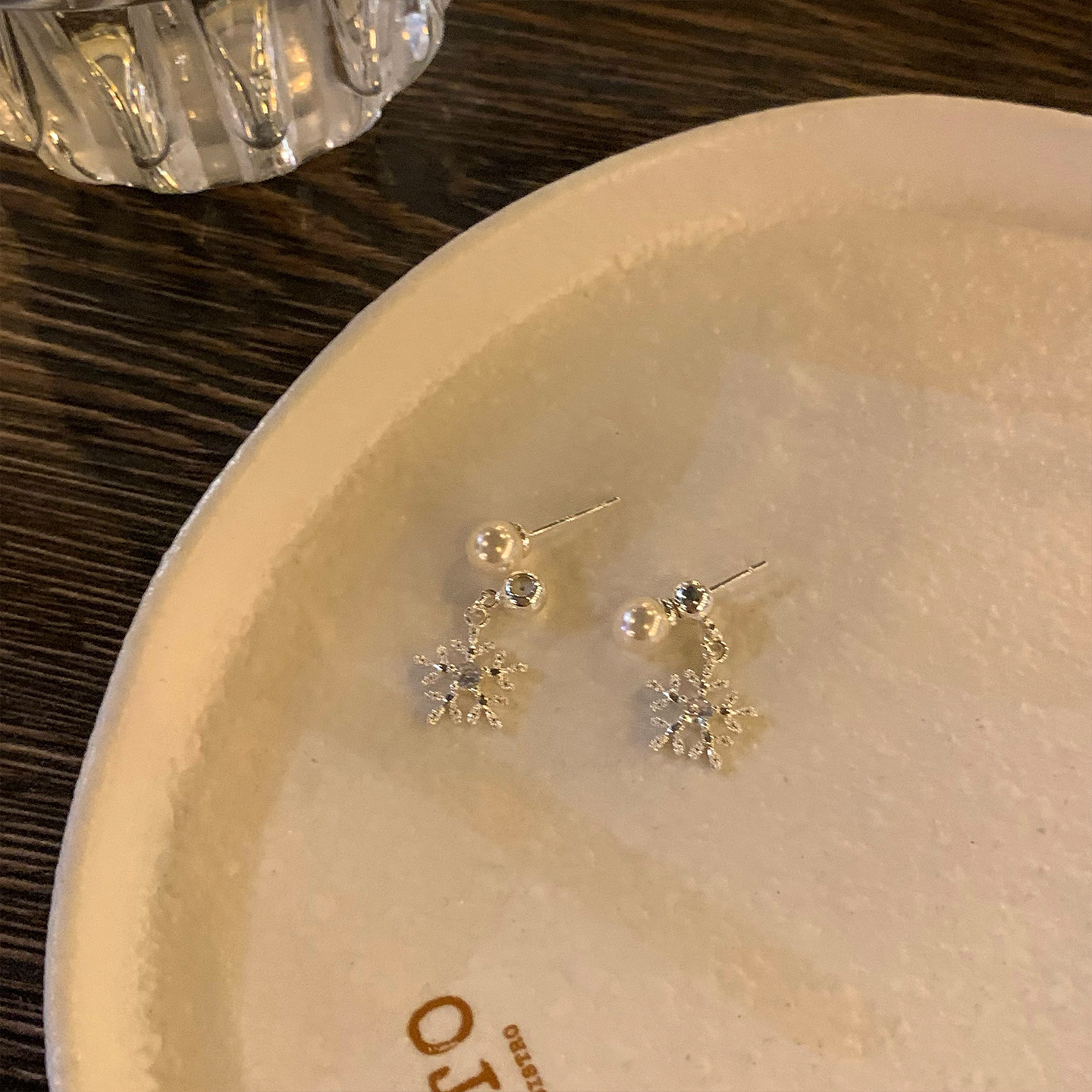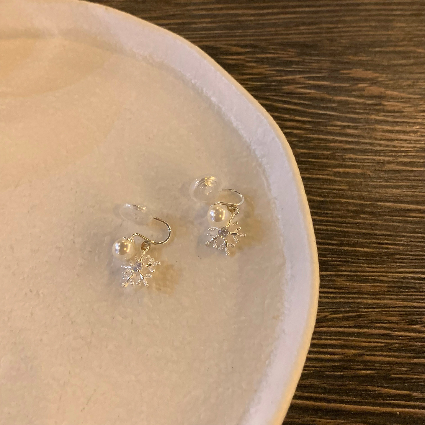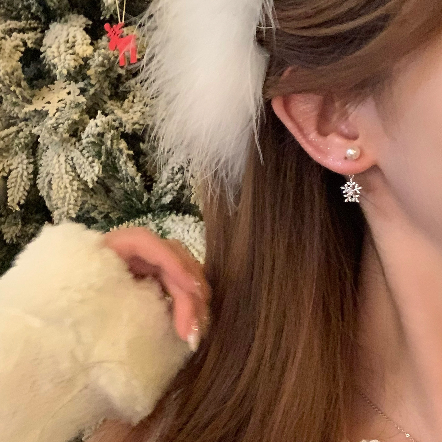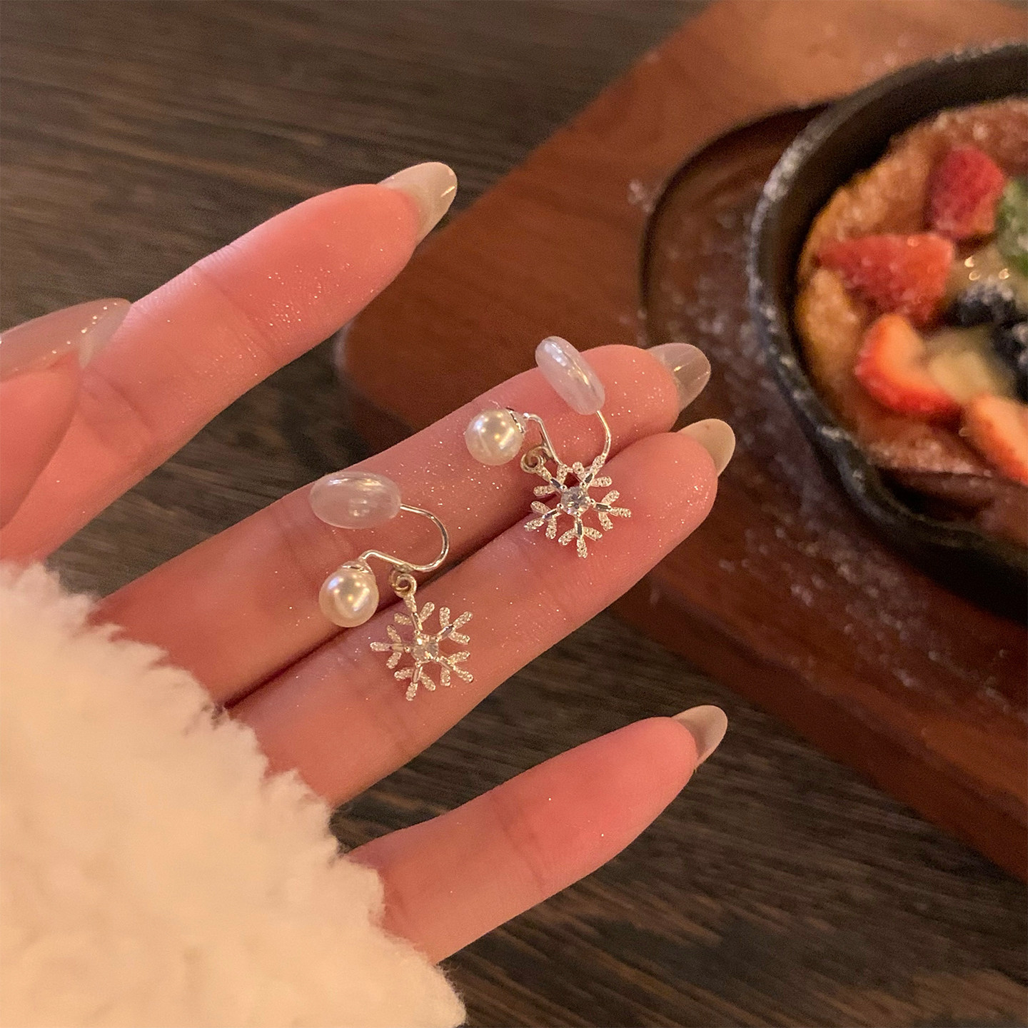 精緻閃鋯雪花珍珠吊墜後掛式耳釘女輕奢高級感耳環無耳洞耳夾耳飾