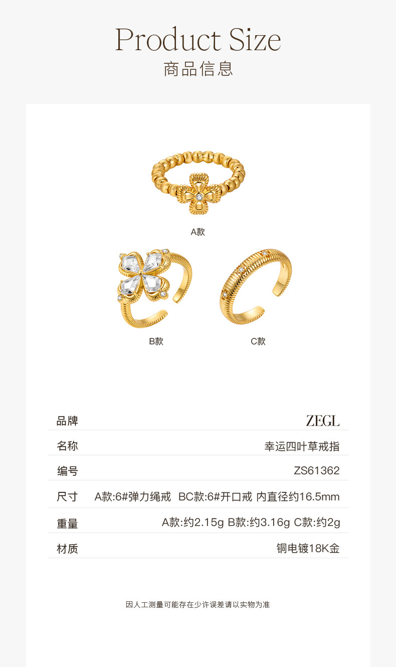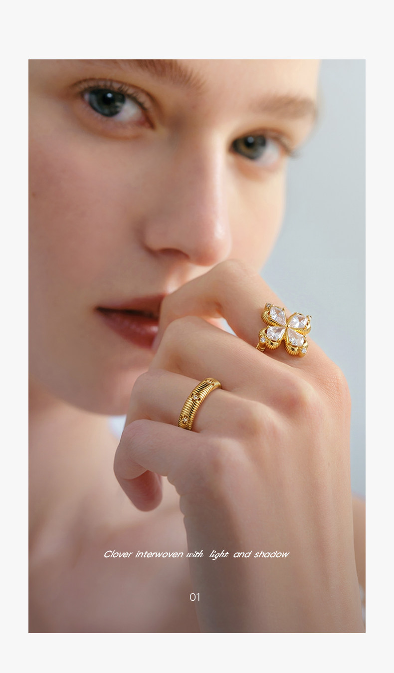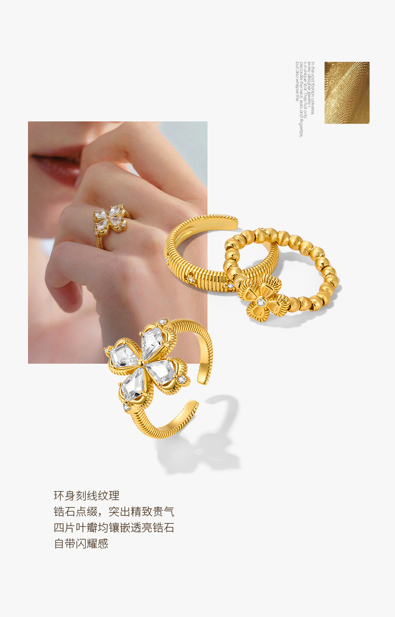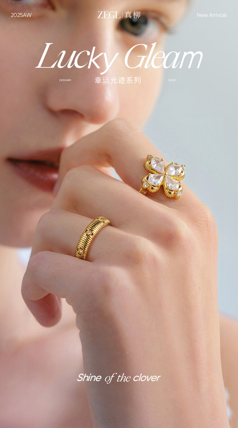 ZEGL幸運光跡系列金色四葉草戒指輕奢高級感復古指環秋冬曡戴套戒