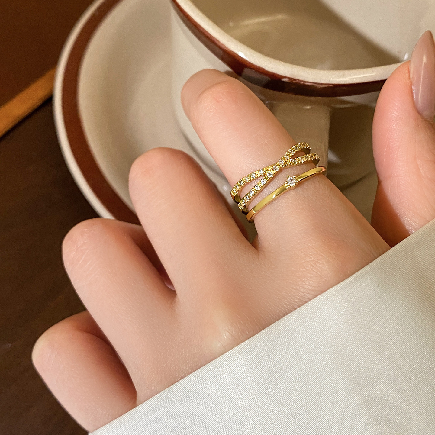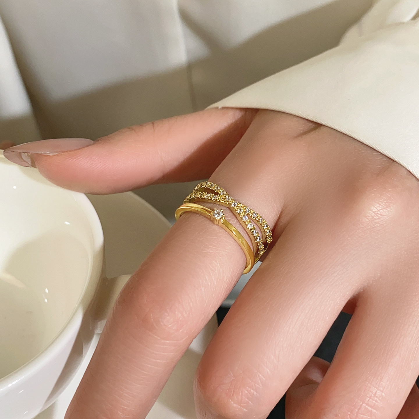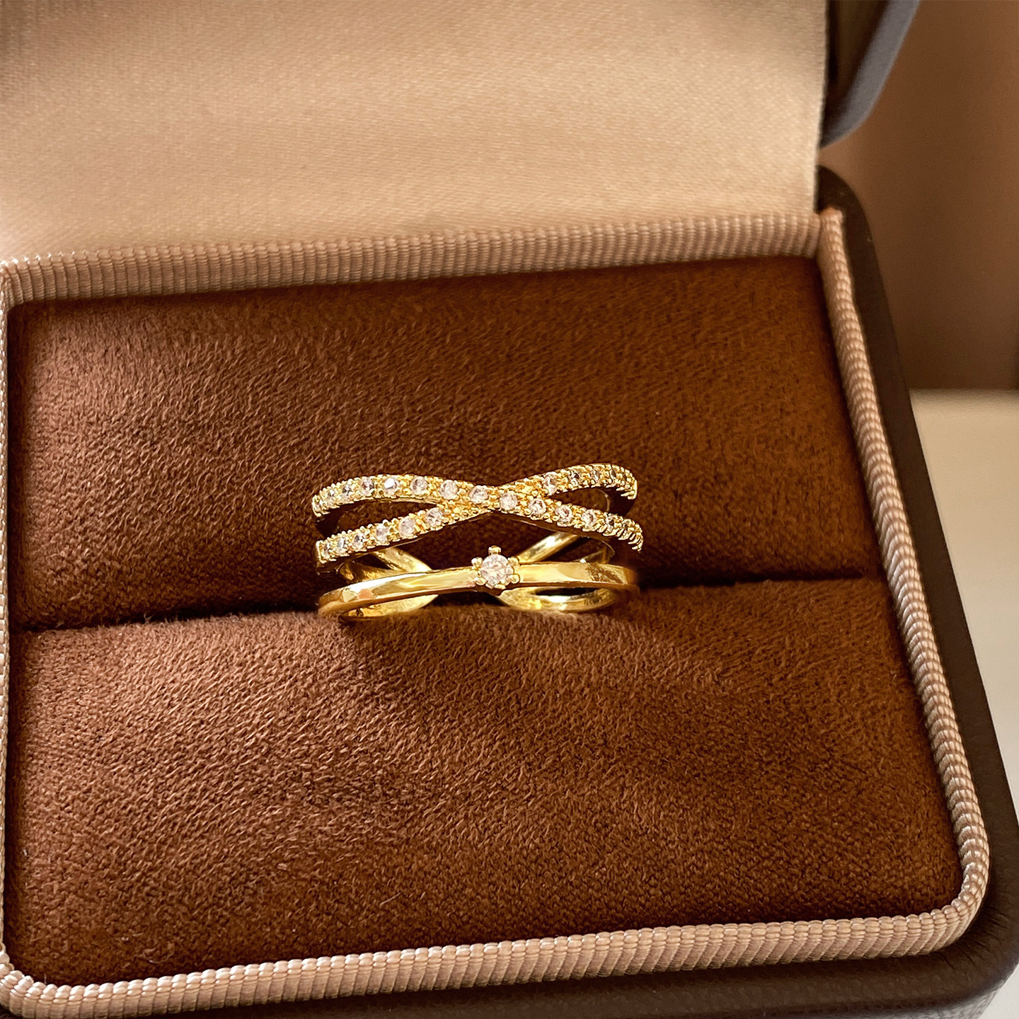 金色滿鑽多層交叉開口戒指女輕奢高級感2026新款爆款小衆設計指環