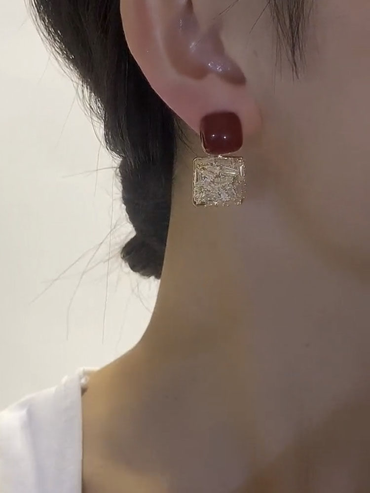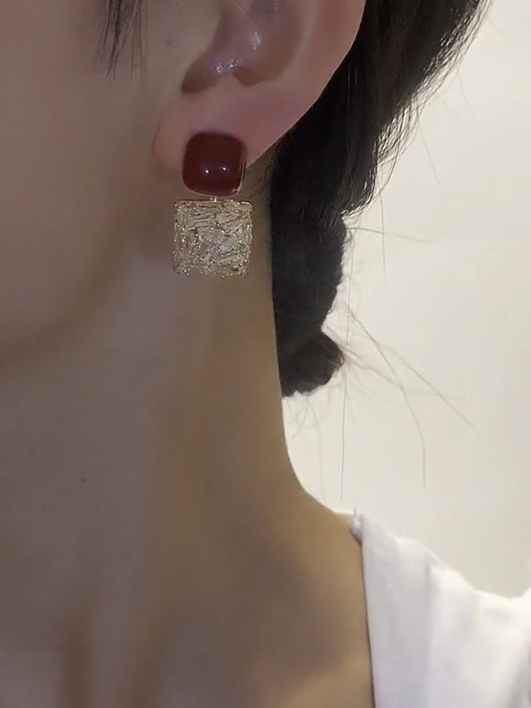 銀針紅色耳釘精緻時尚方形滿鑽耳環簡約設計個性耳飾秋冬新款韓國