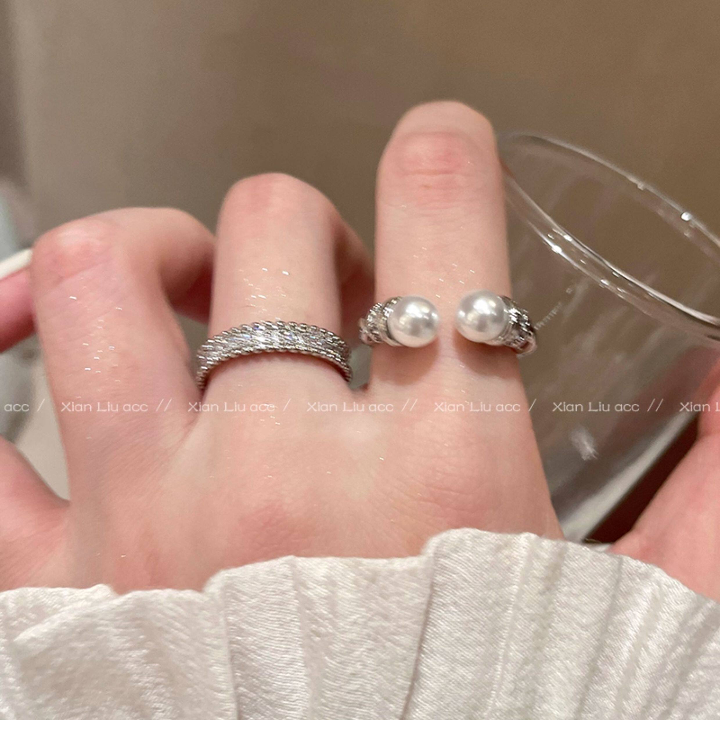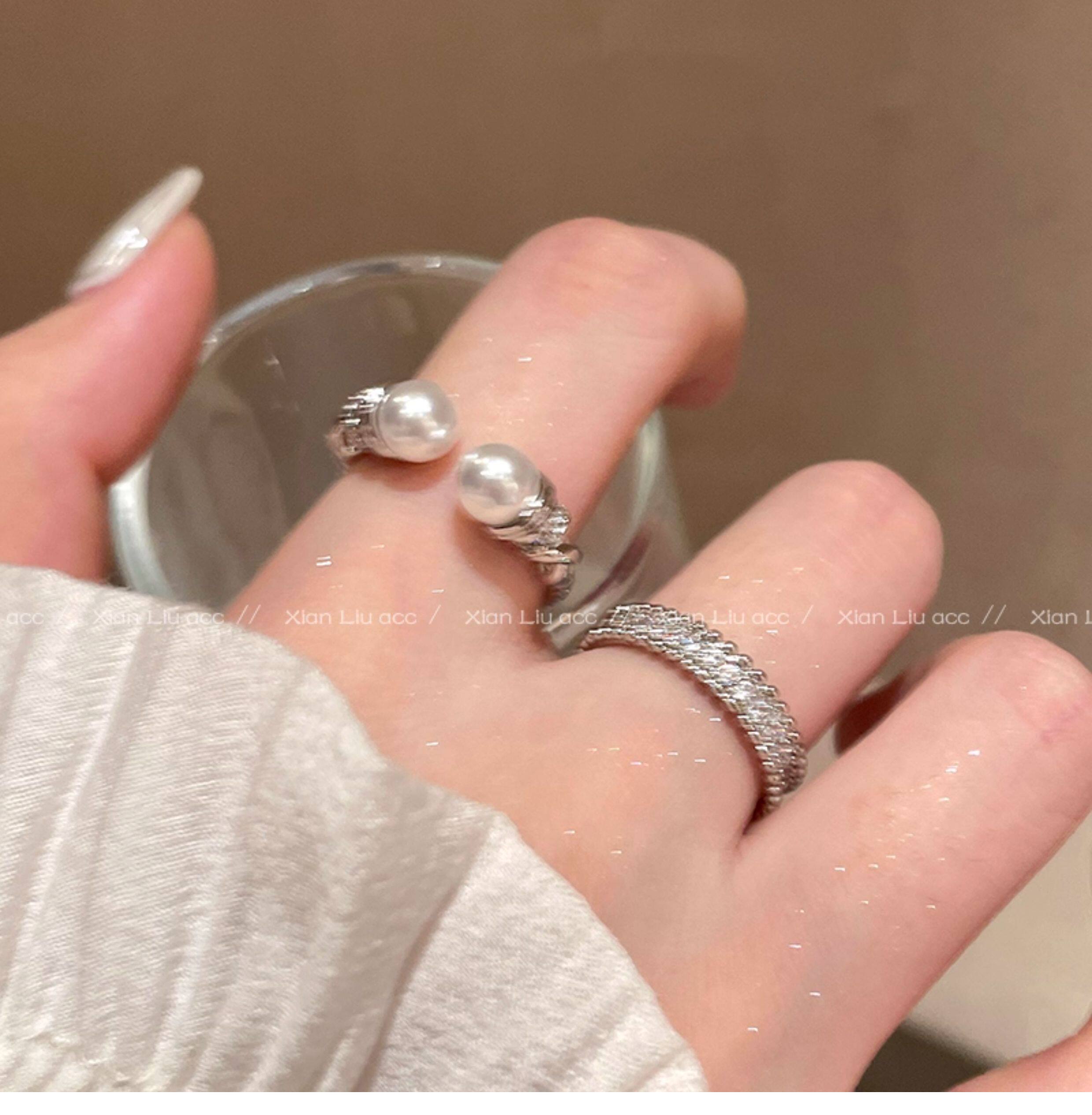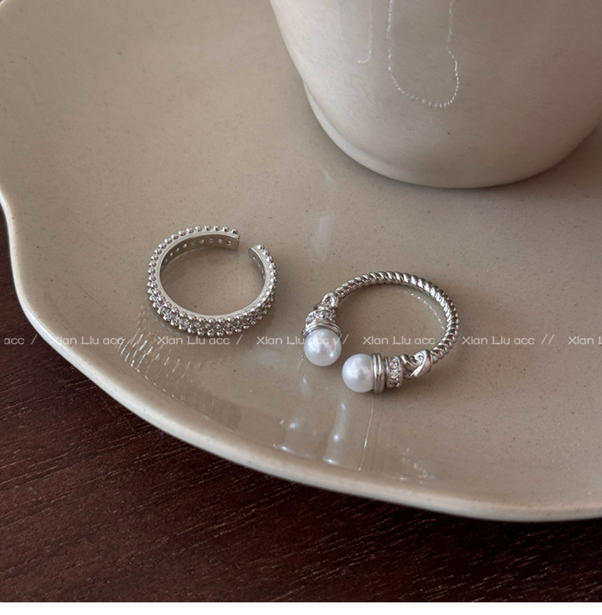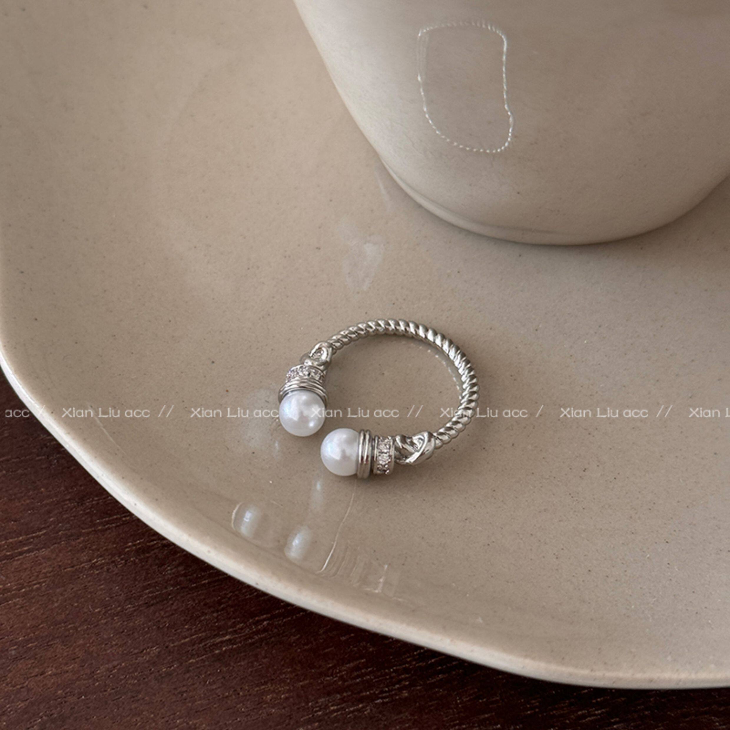 麻花雙珍珠開口戒指女小衆設計排鑽食指戒輕奢氣質高級感曡戴指環
