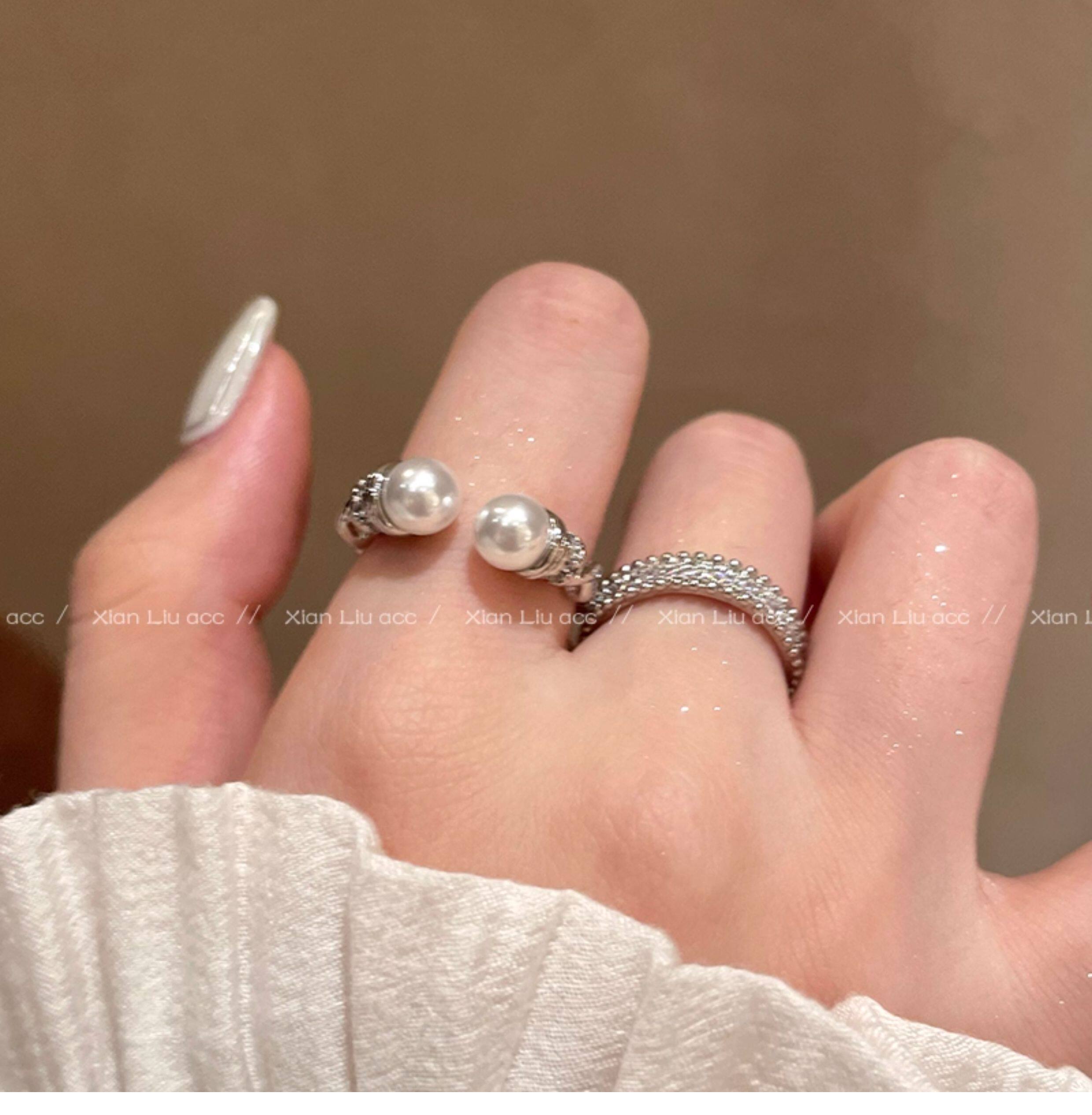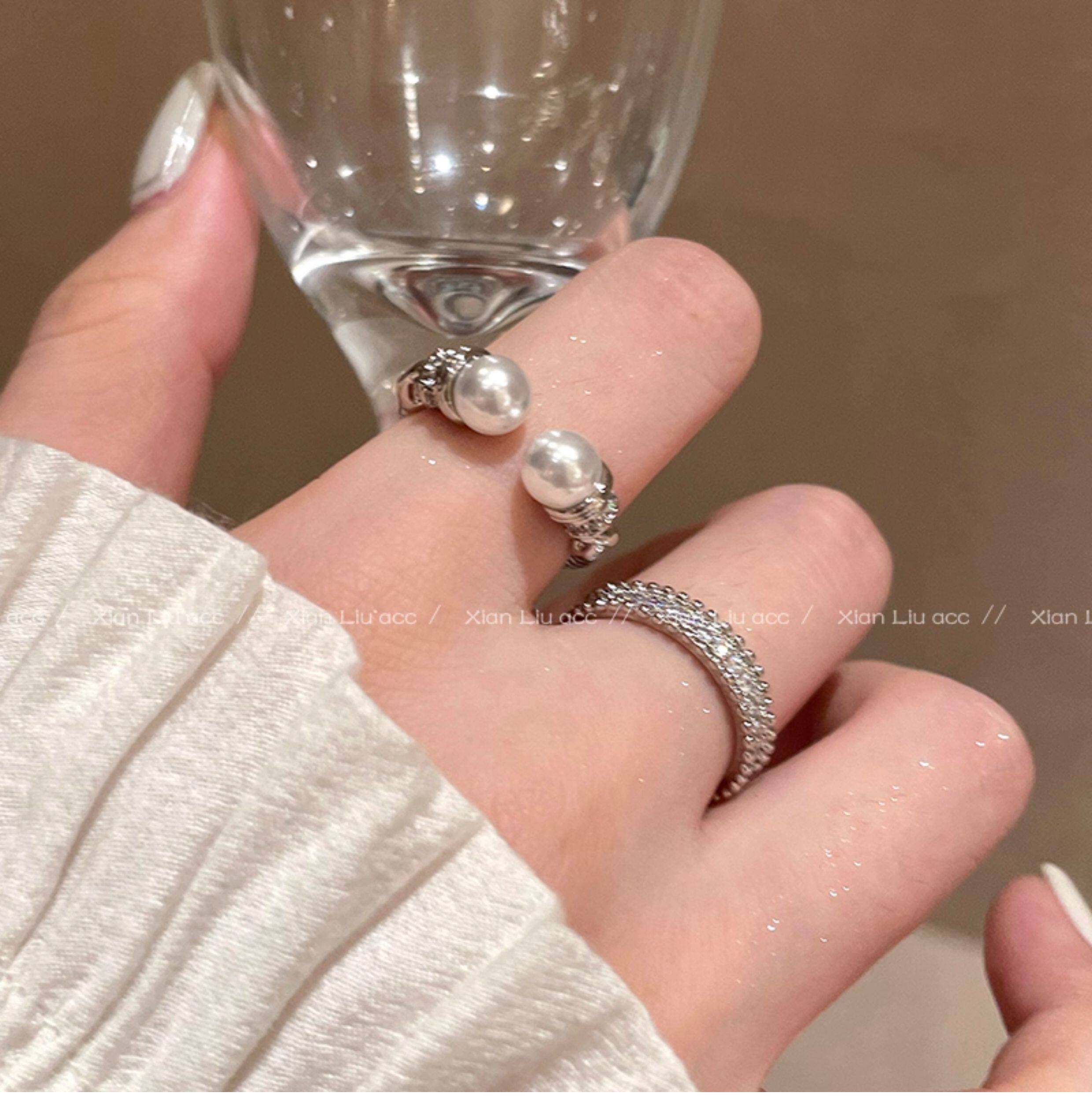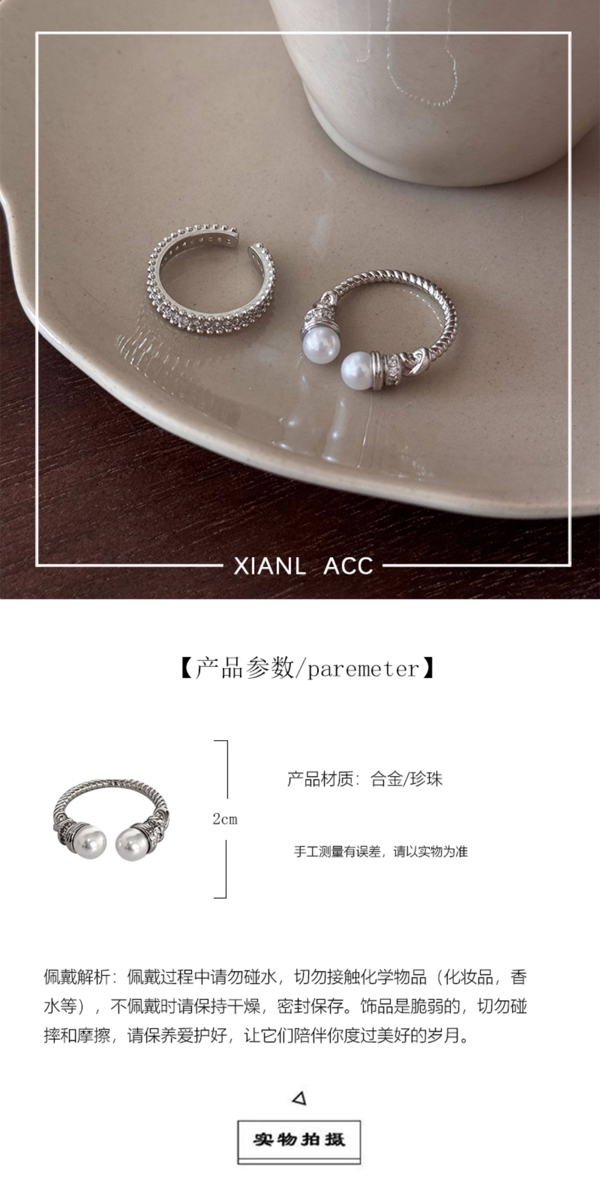 麻花雙珍珠開口戒指女小衆設計排鑽食指戒輕奢氣質高級感曡戴指環