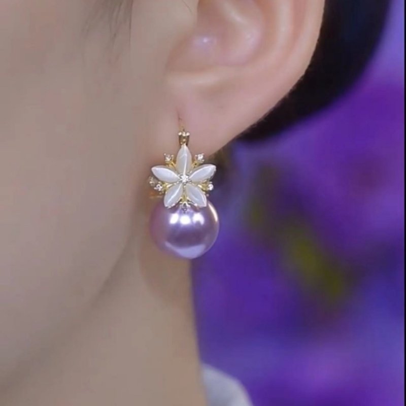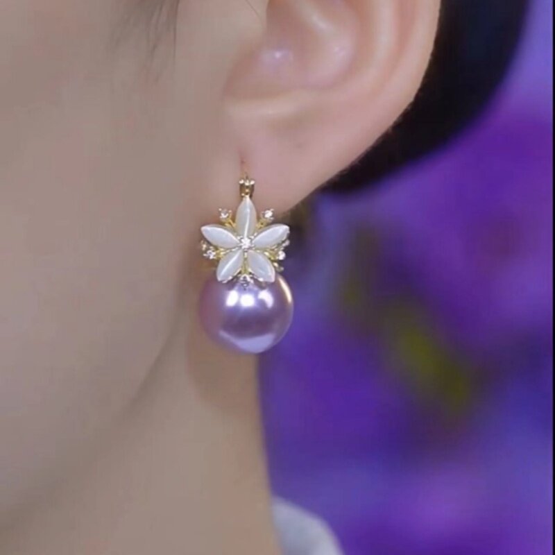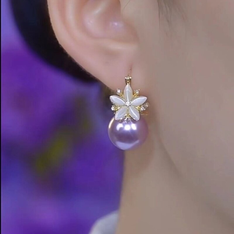 紫色珍珠鋯石花朵耳環2026新款爆款氣質耳釘高級感輕奢女人味耳飾