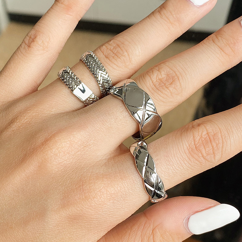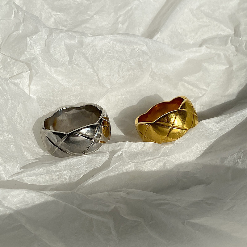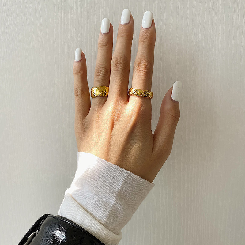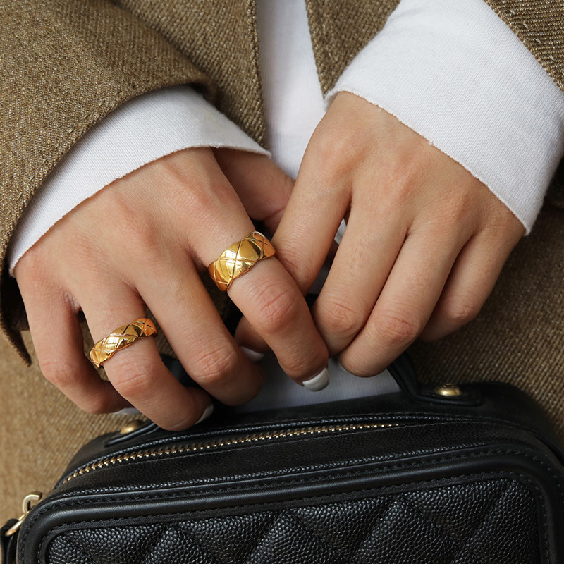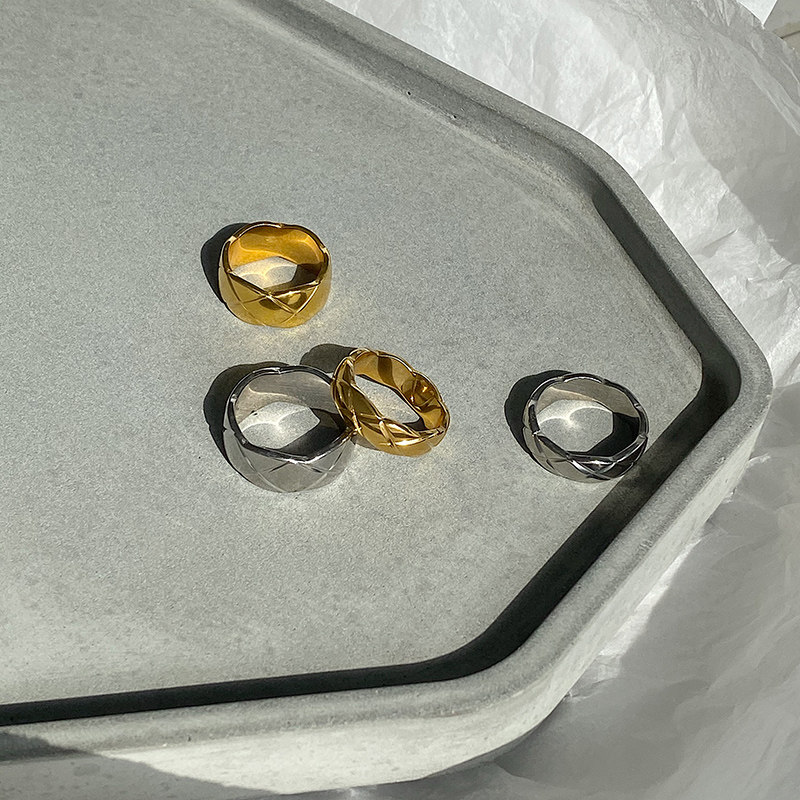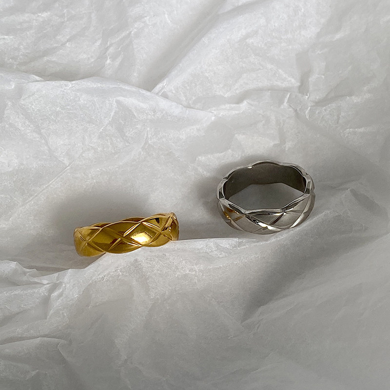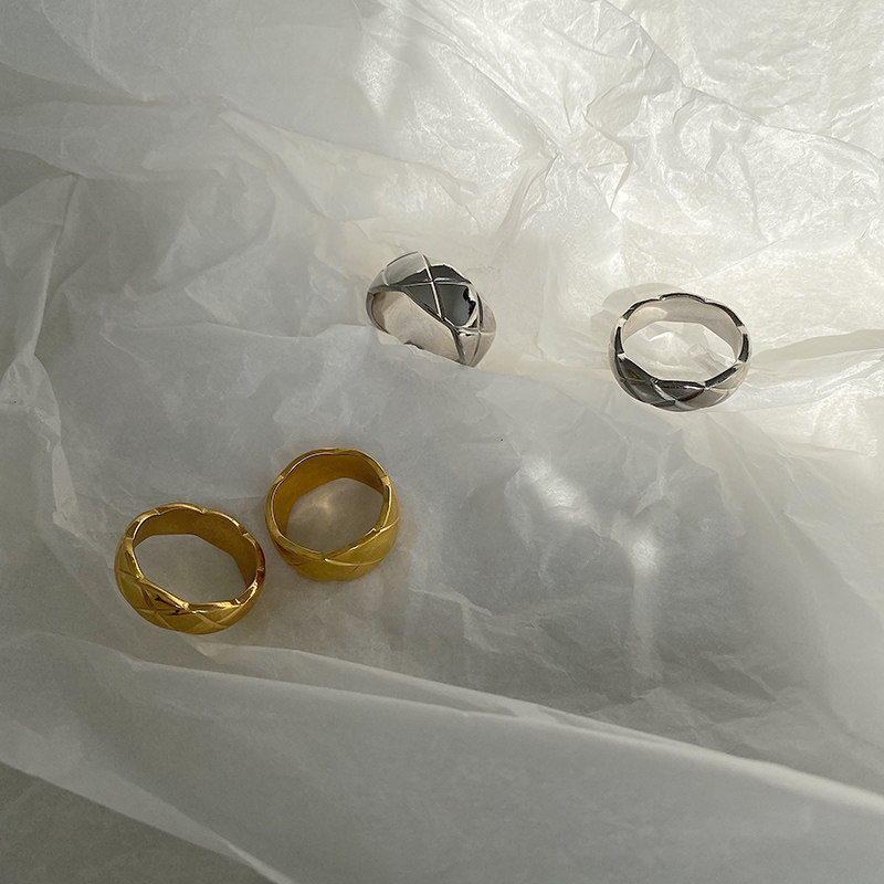 DOUDOU不掉色鈦鋼冷淡風菱格戒指設計金屬復古情侶對戒網紅男女