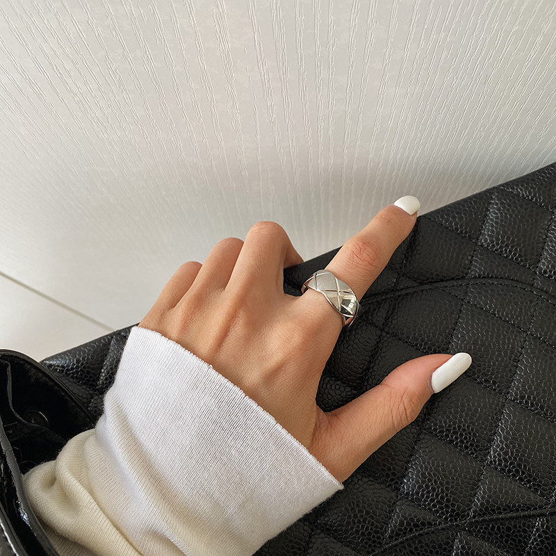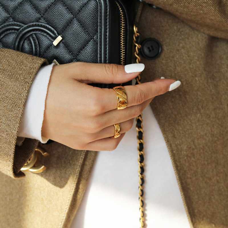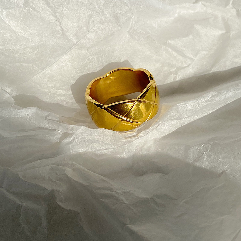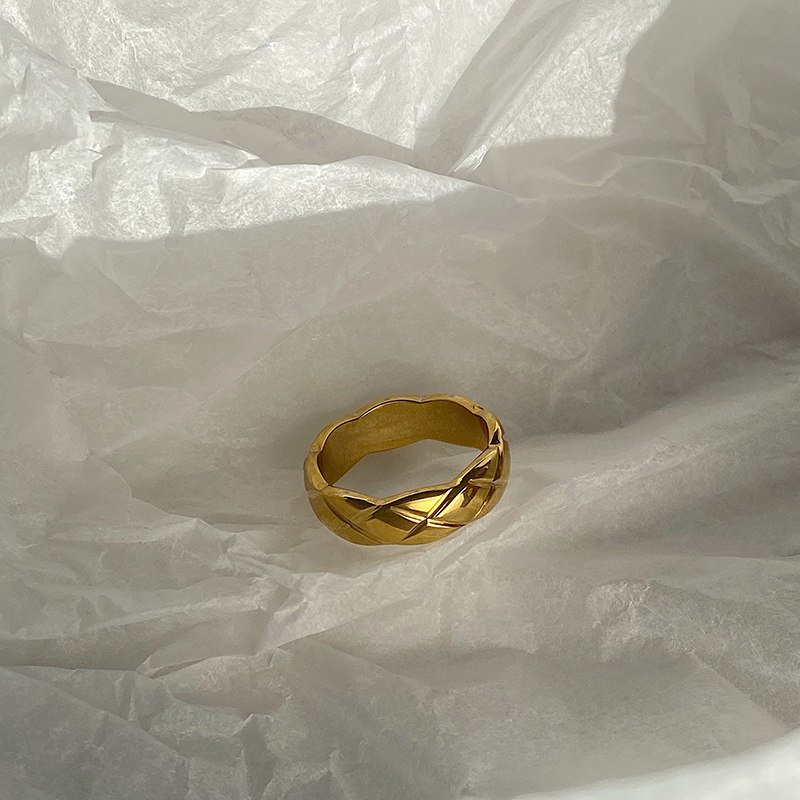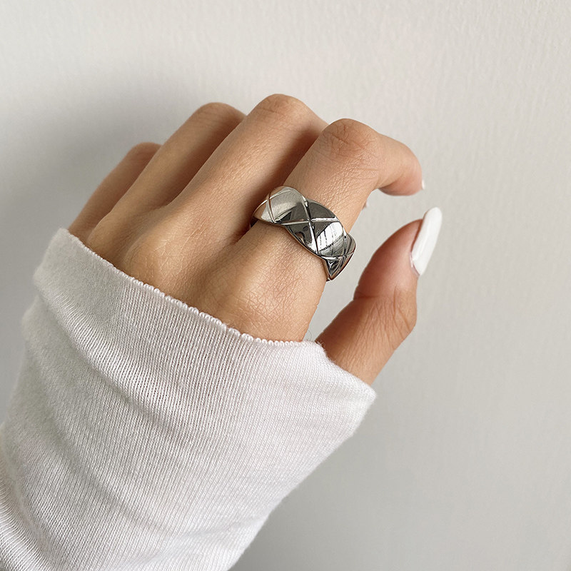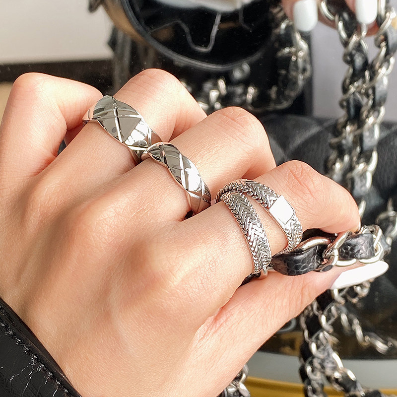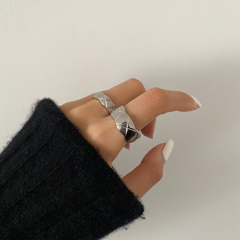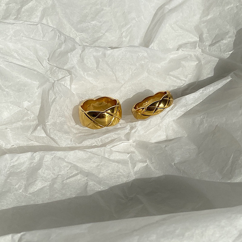 DOUDOU不掉色鈦鋼冷淡風菱格戒指設計金屬復古情侶對戒網紅男女