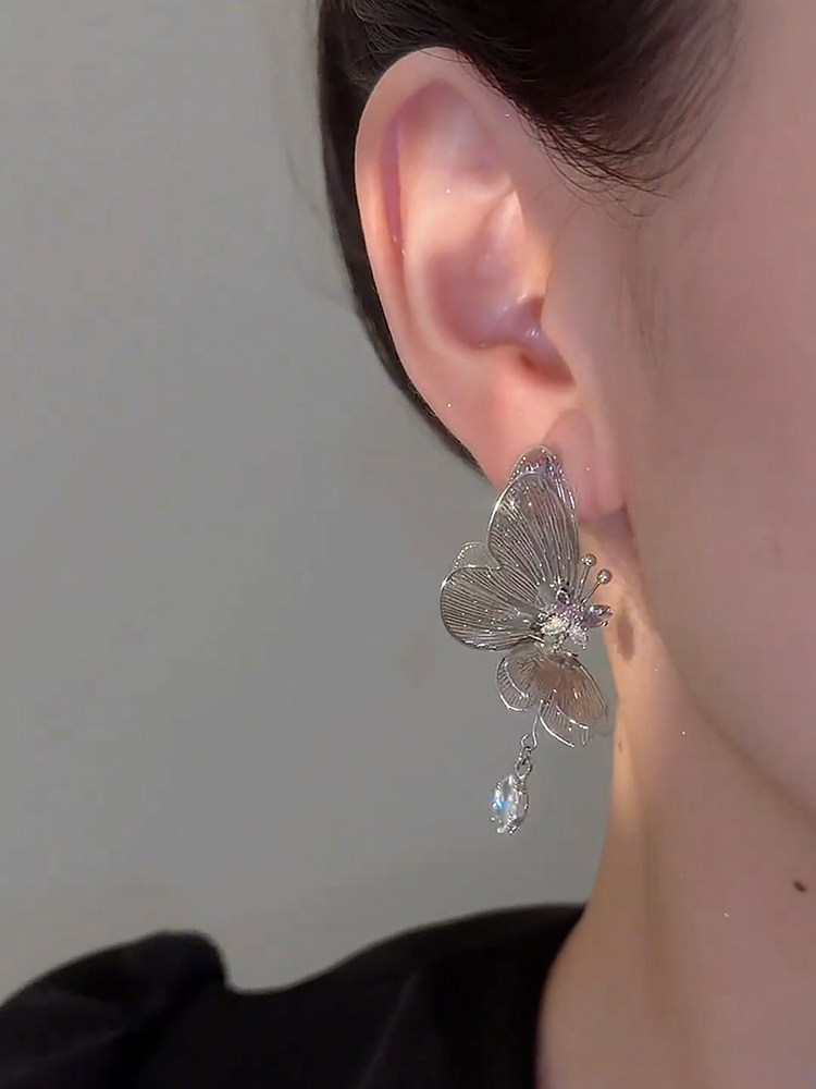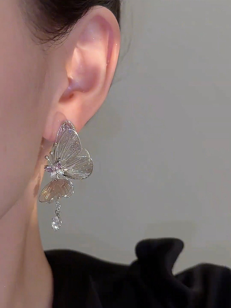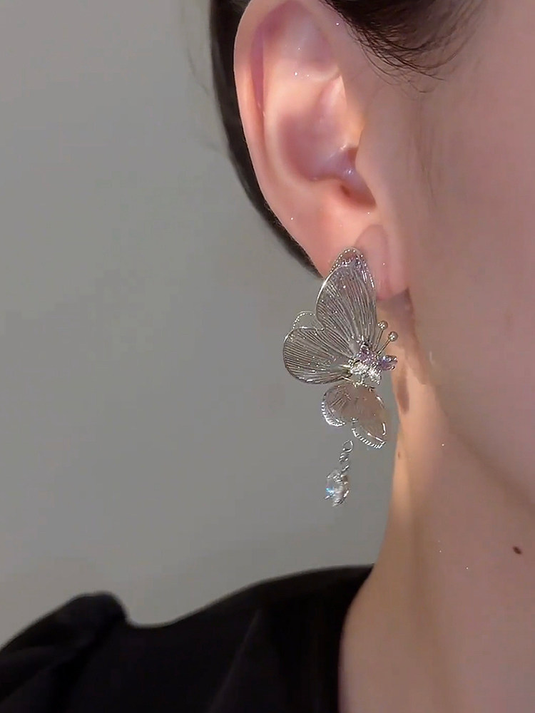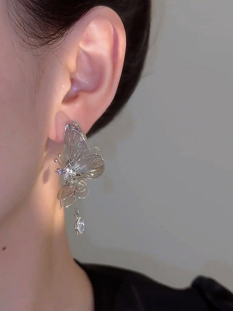 鏤空立體銀色蝴蝶吊墜耳環氣質個性設計感長款流蘇耳飾銀針耳釘女
