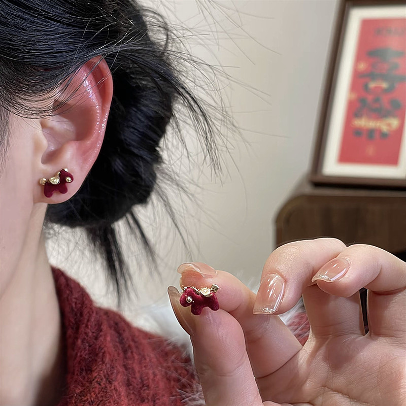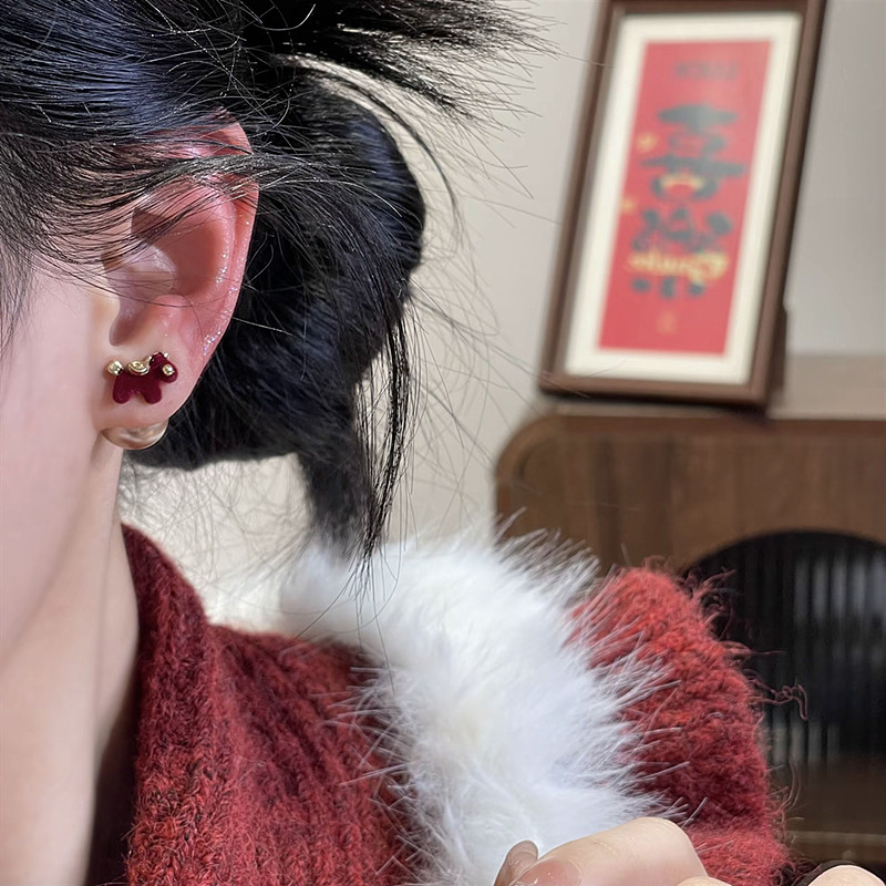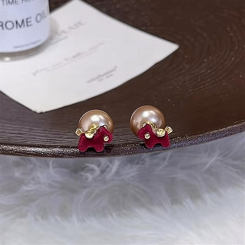 新款925銀針酒紅色植絨卡通兩戴小馬珍珠耳釘復古百搭可愛氣質女