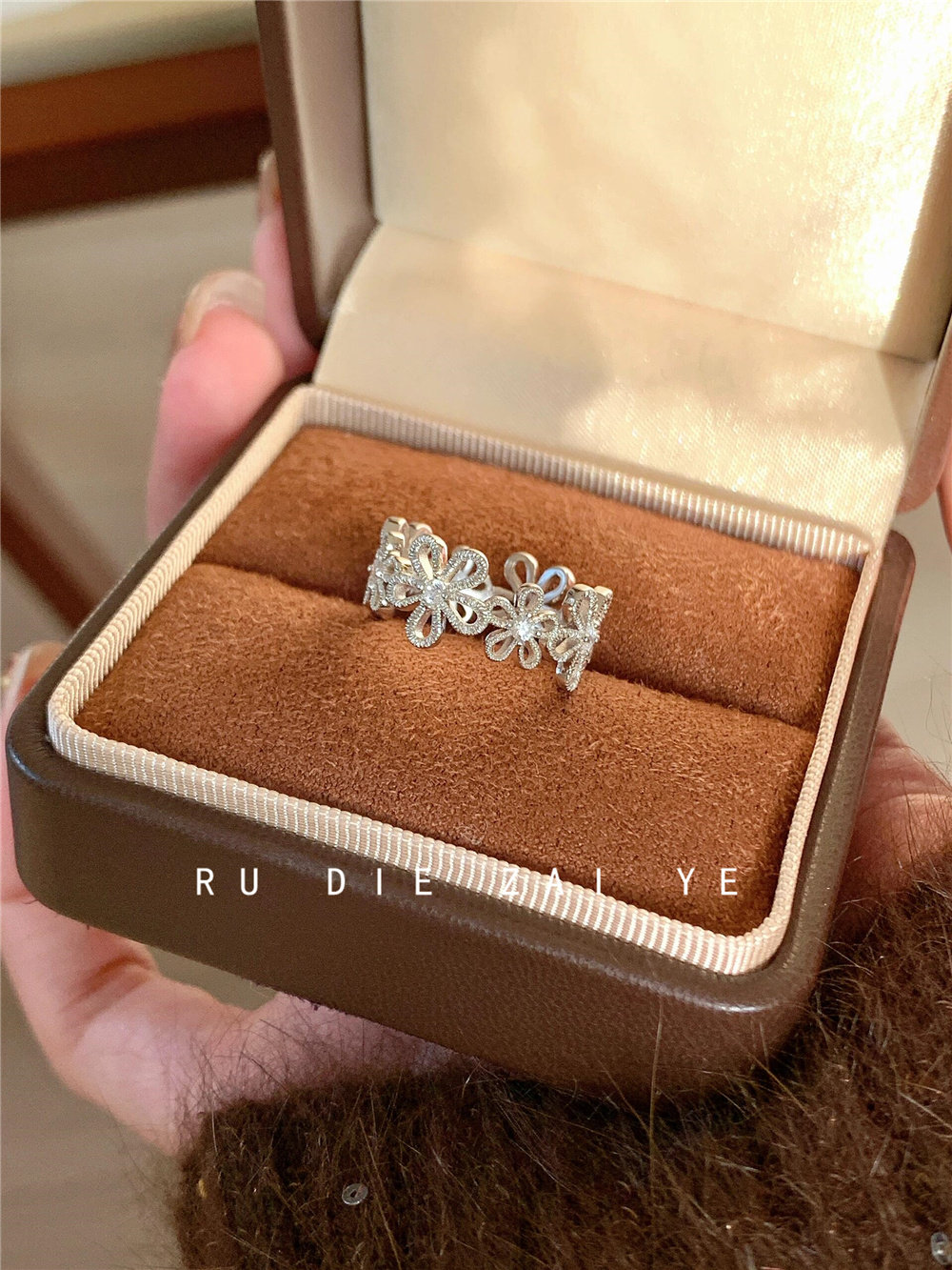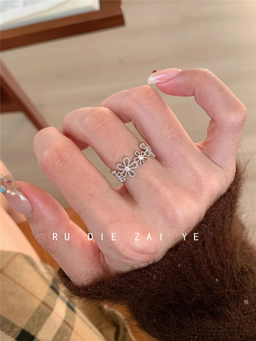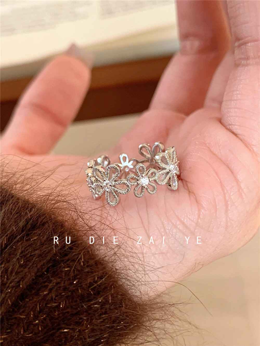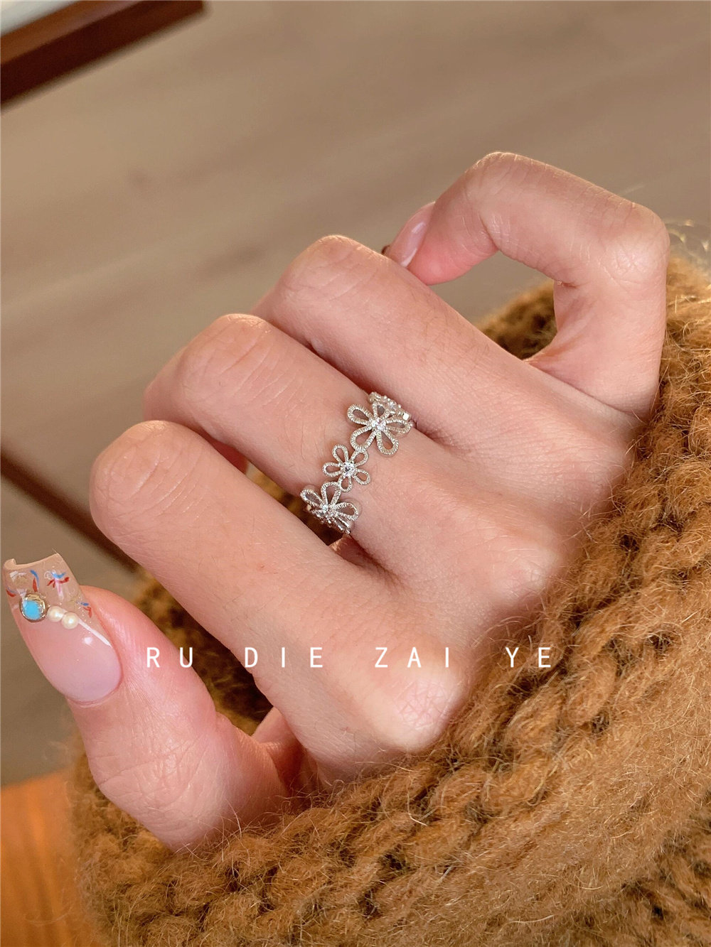 如蝶在野 甜美銀色蕾絲花環戒指女輕奢精緻春夏小衆設計開口戒指