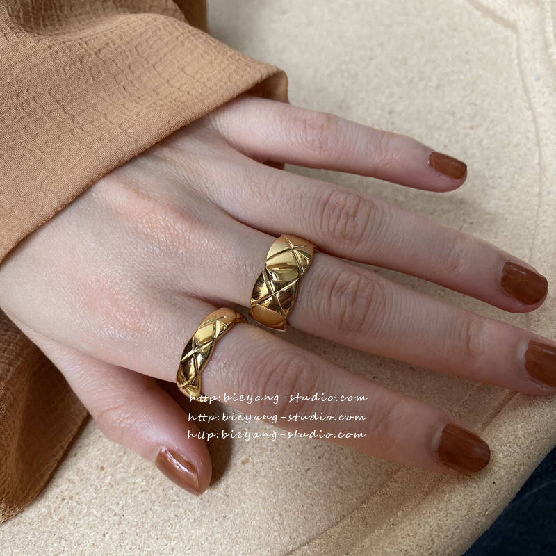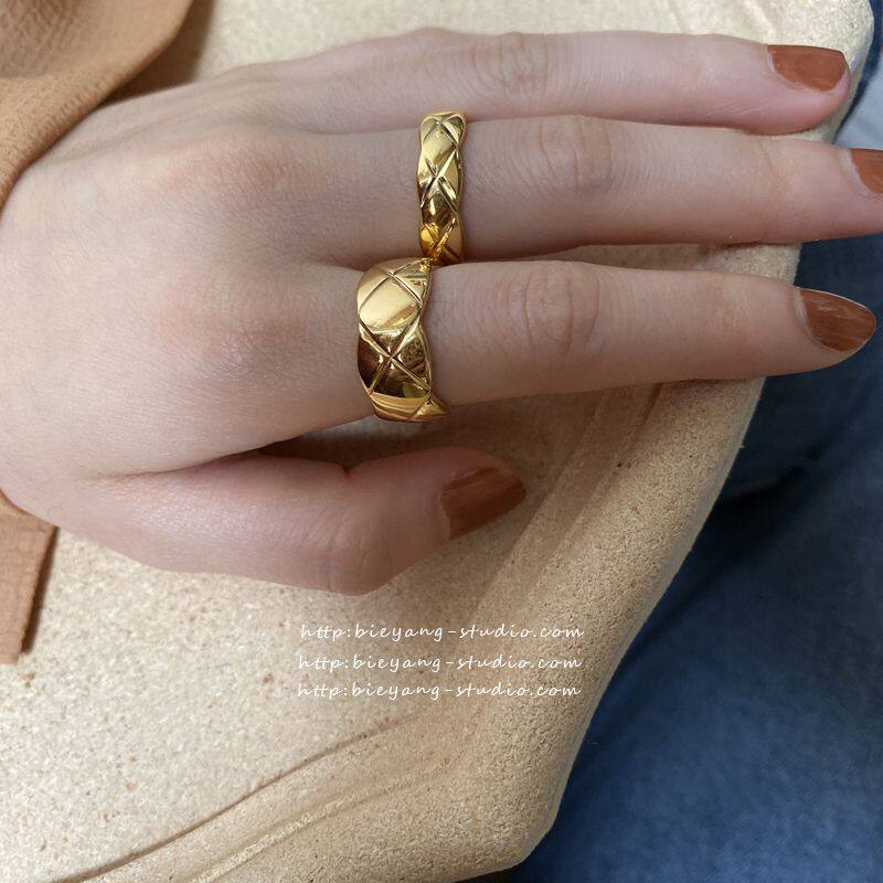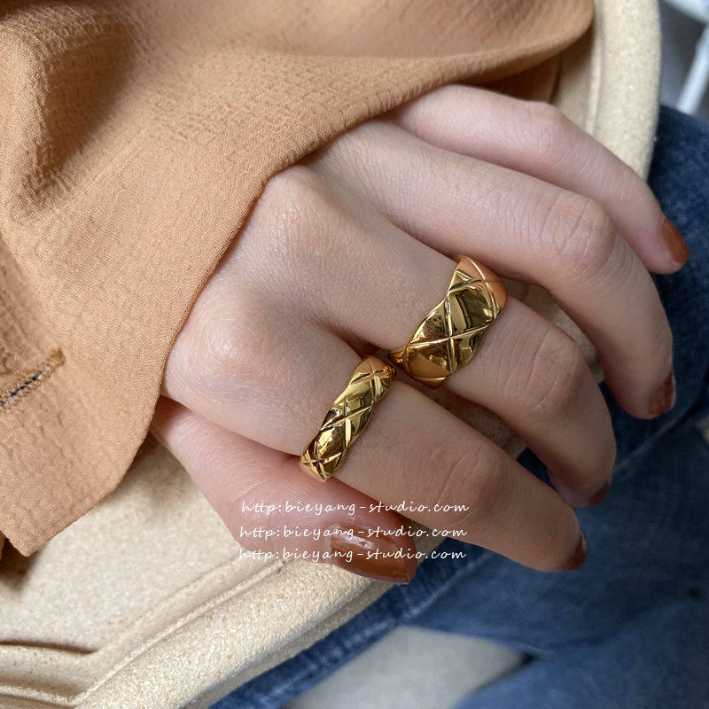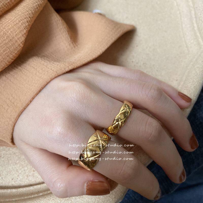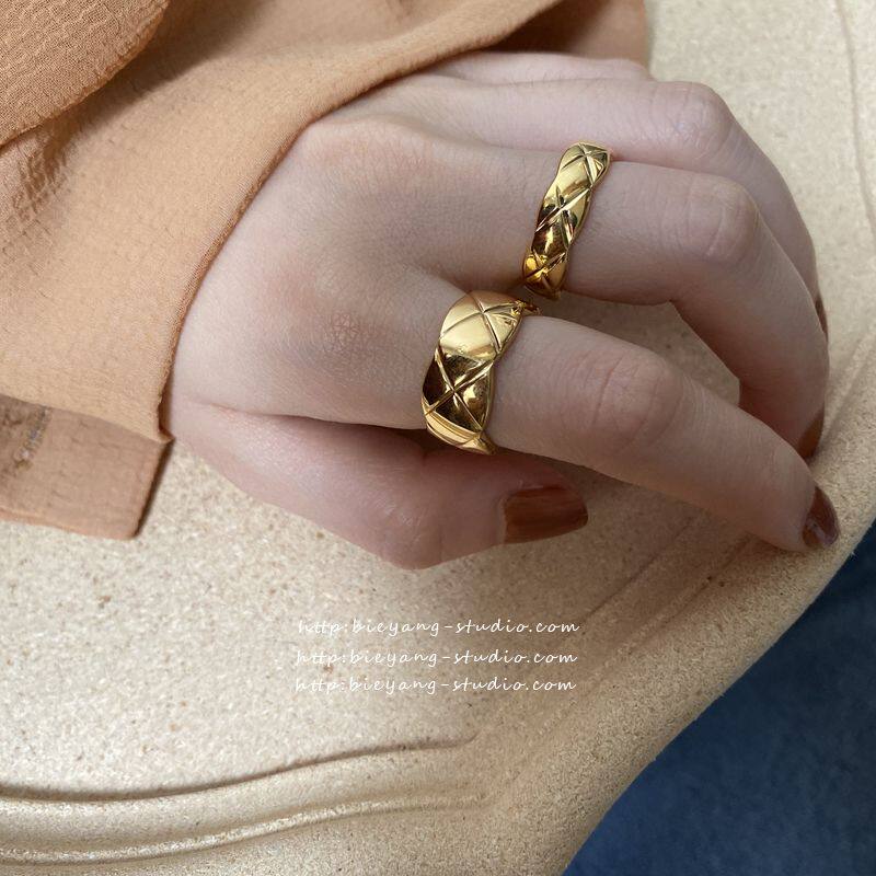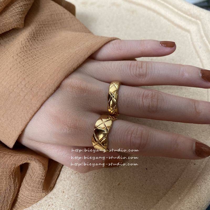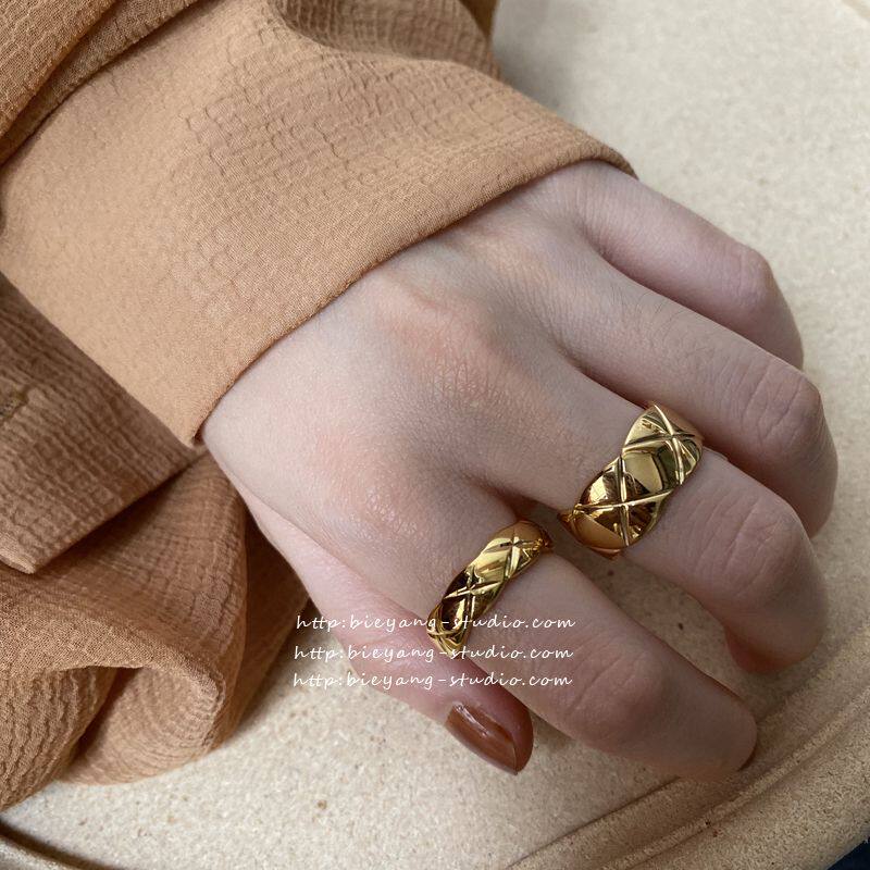 ins博主同款金色時髦指環復古小衆菱形格子chic時尚百搭戒指