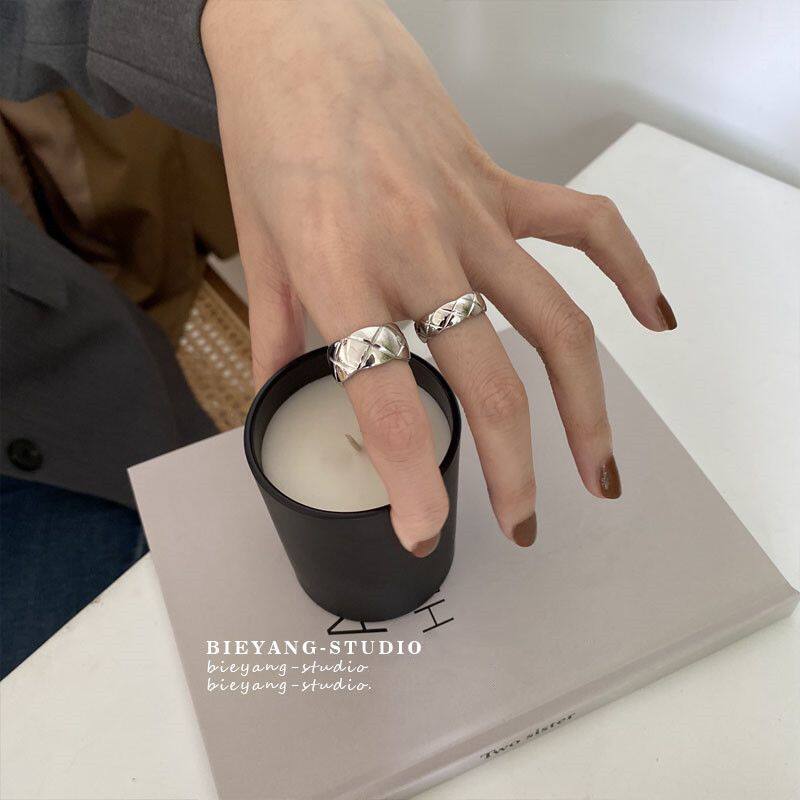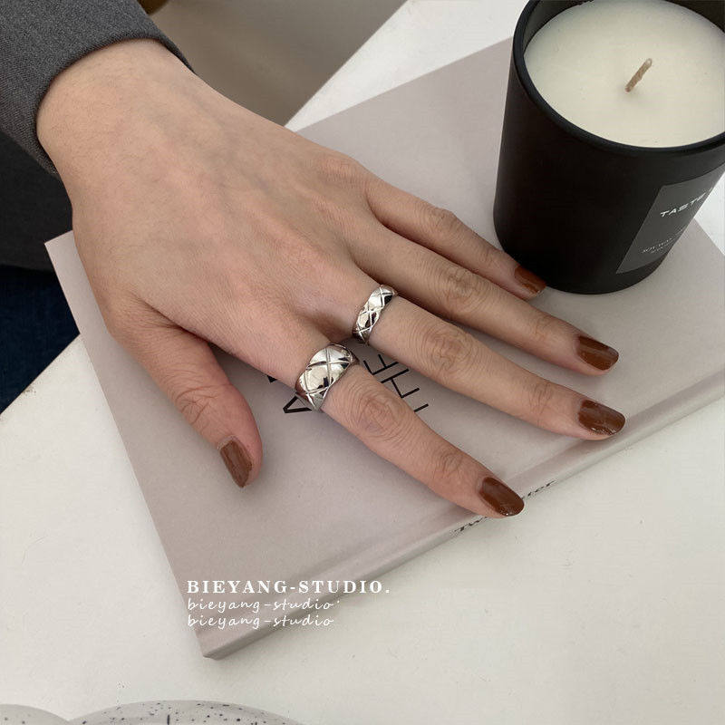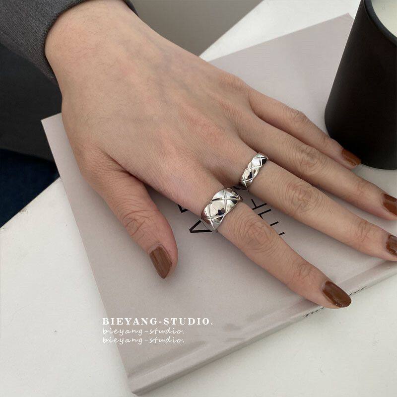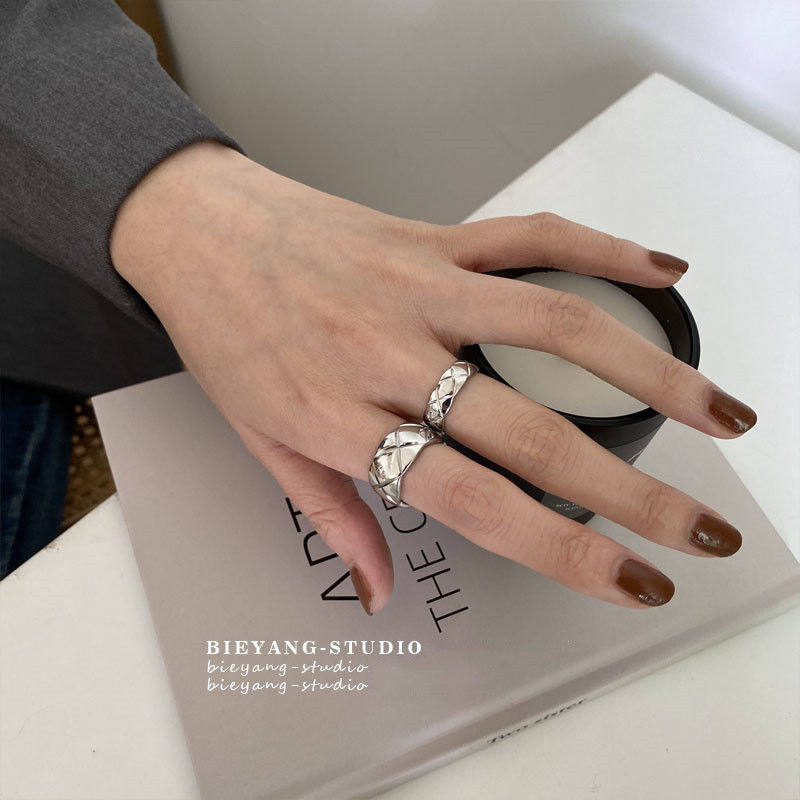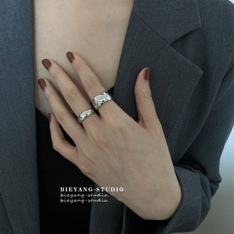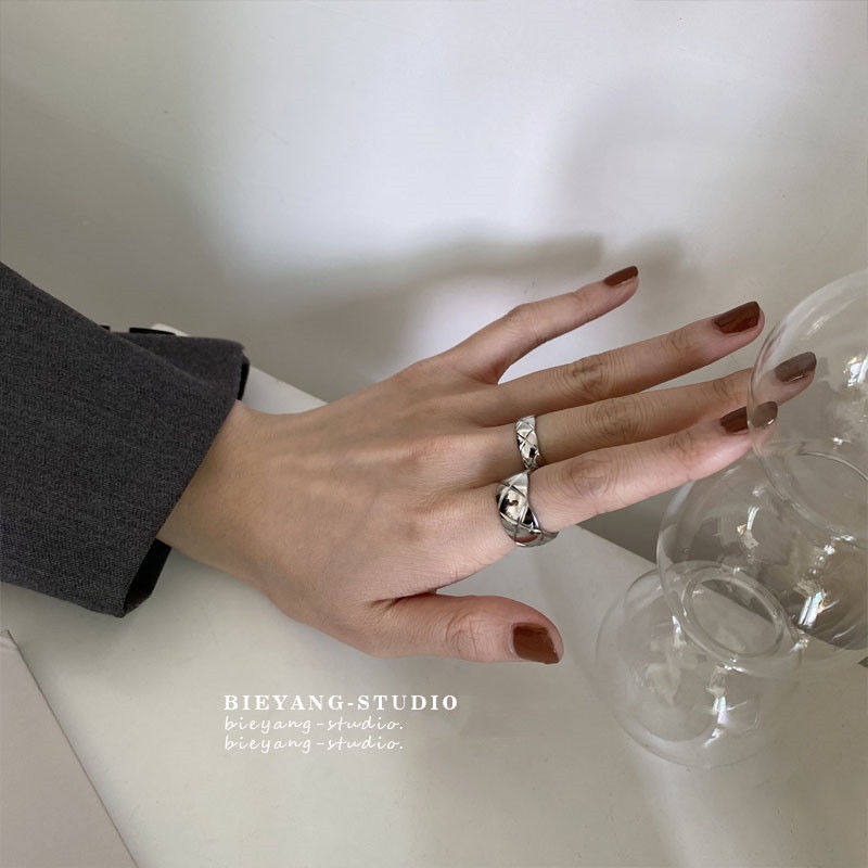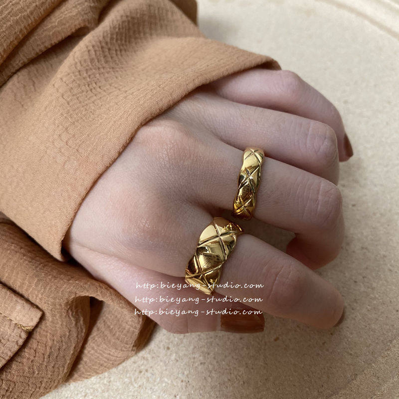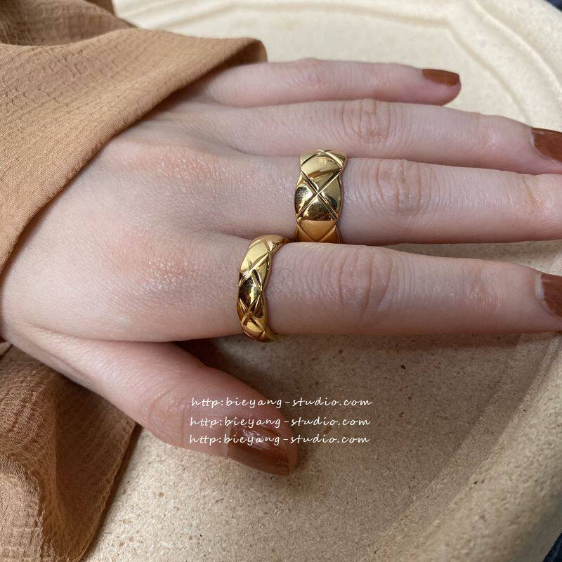 ins博主同款金色時髦指環復古小衆菱形格子chic時尚百搭戒指