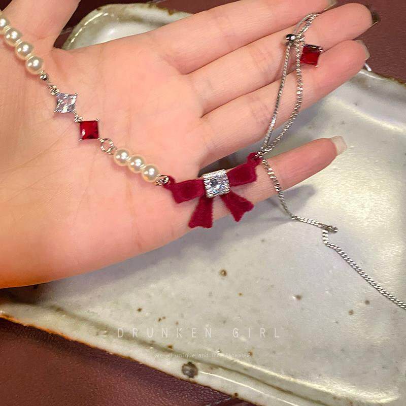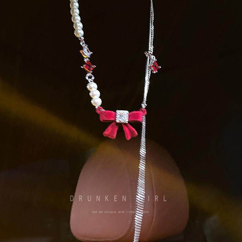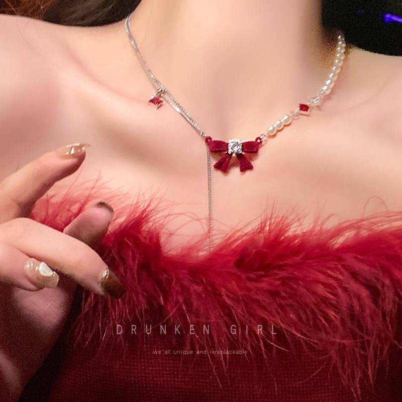 紅色系蝴蝶結珍珠項鍊女敬酒服禮服鎖骨鍊訂婚項鍊高級感裙子配飾