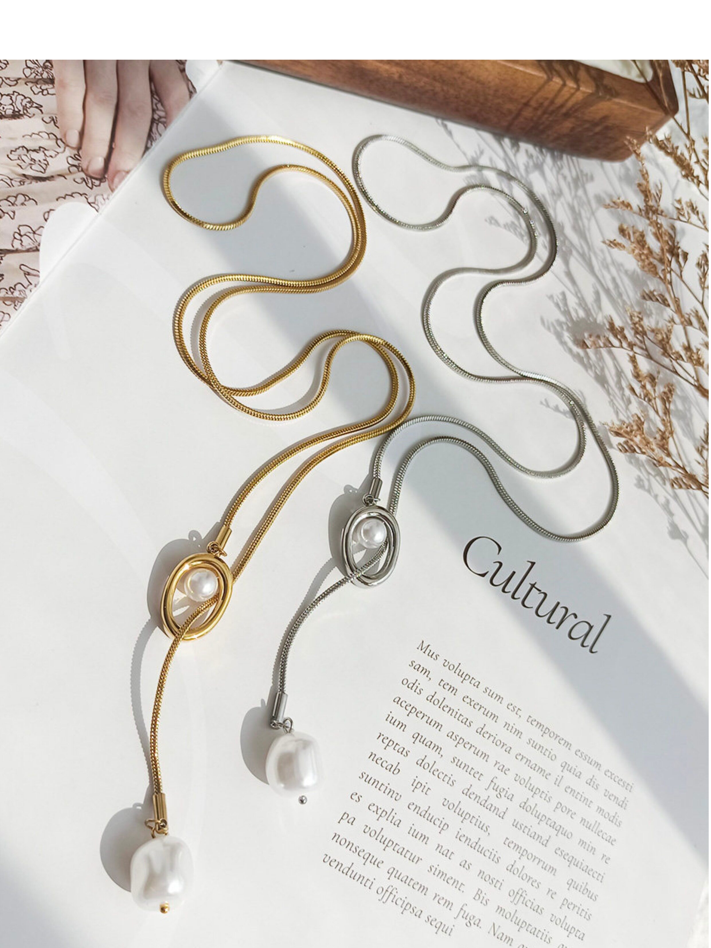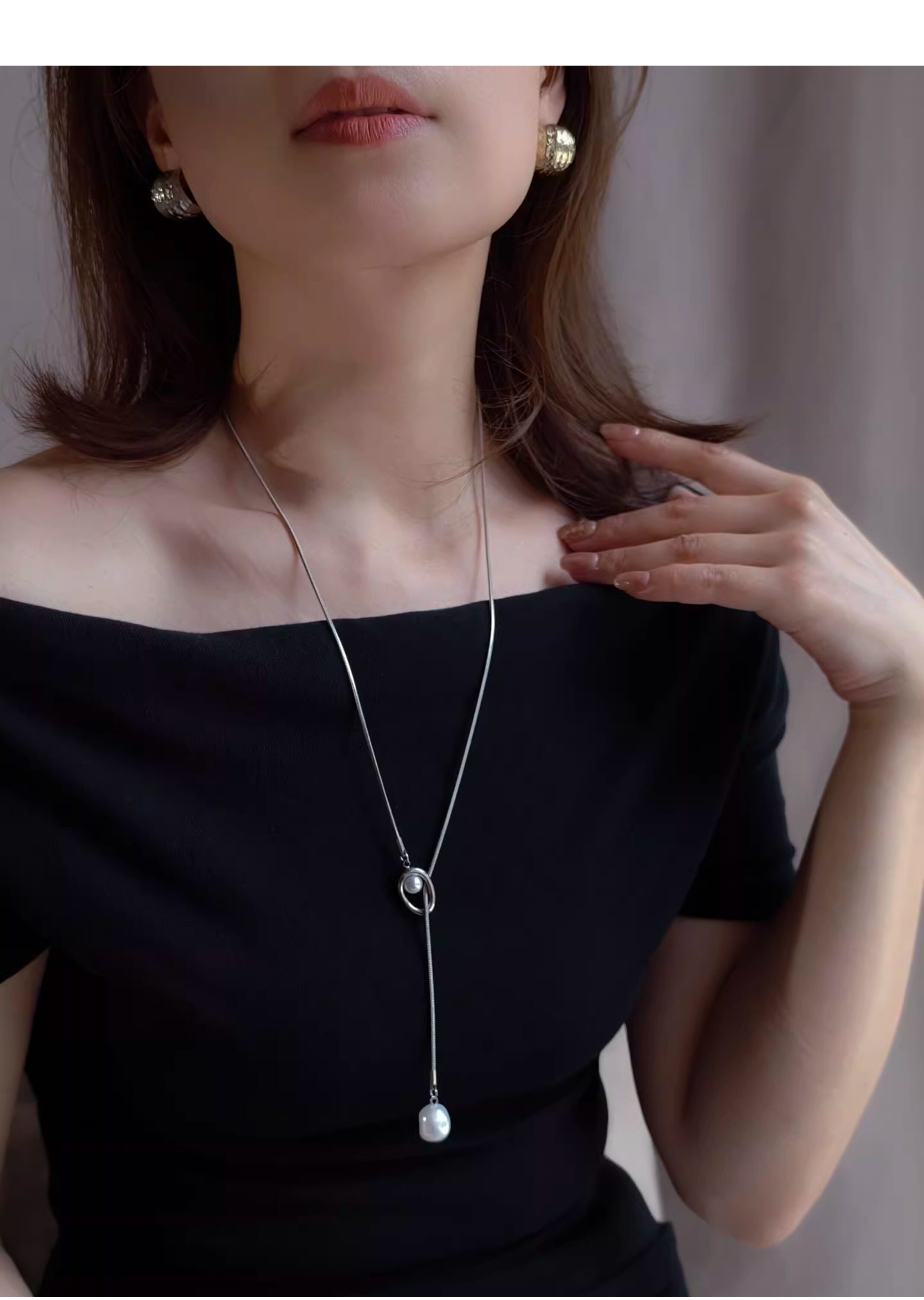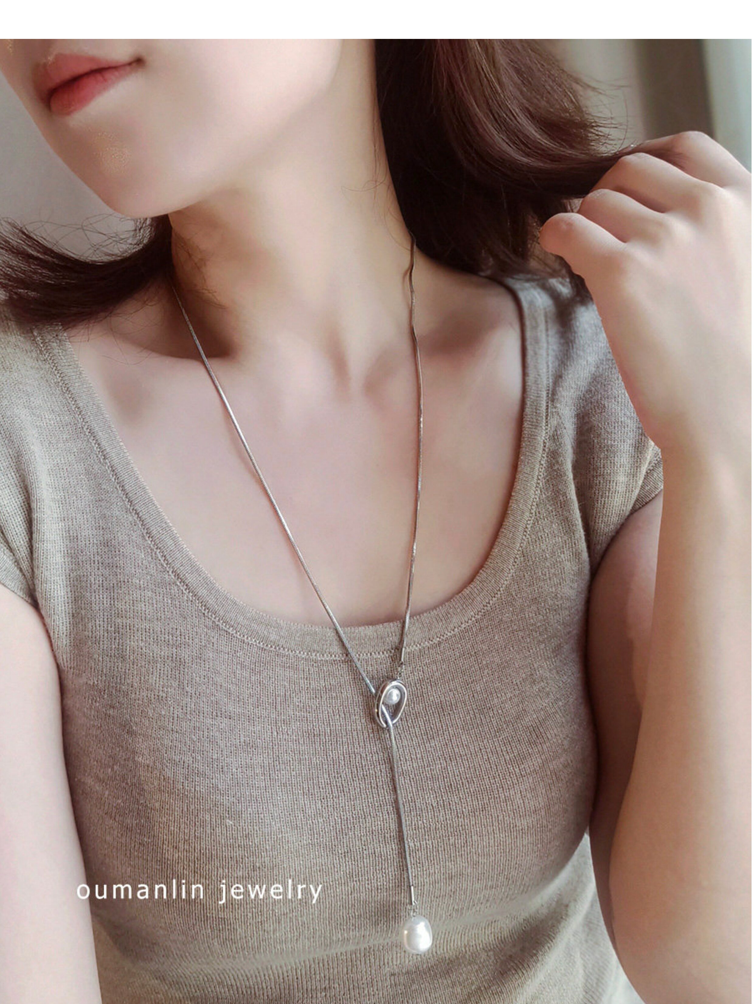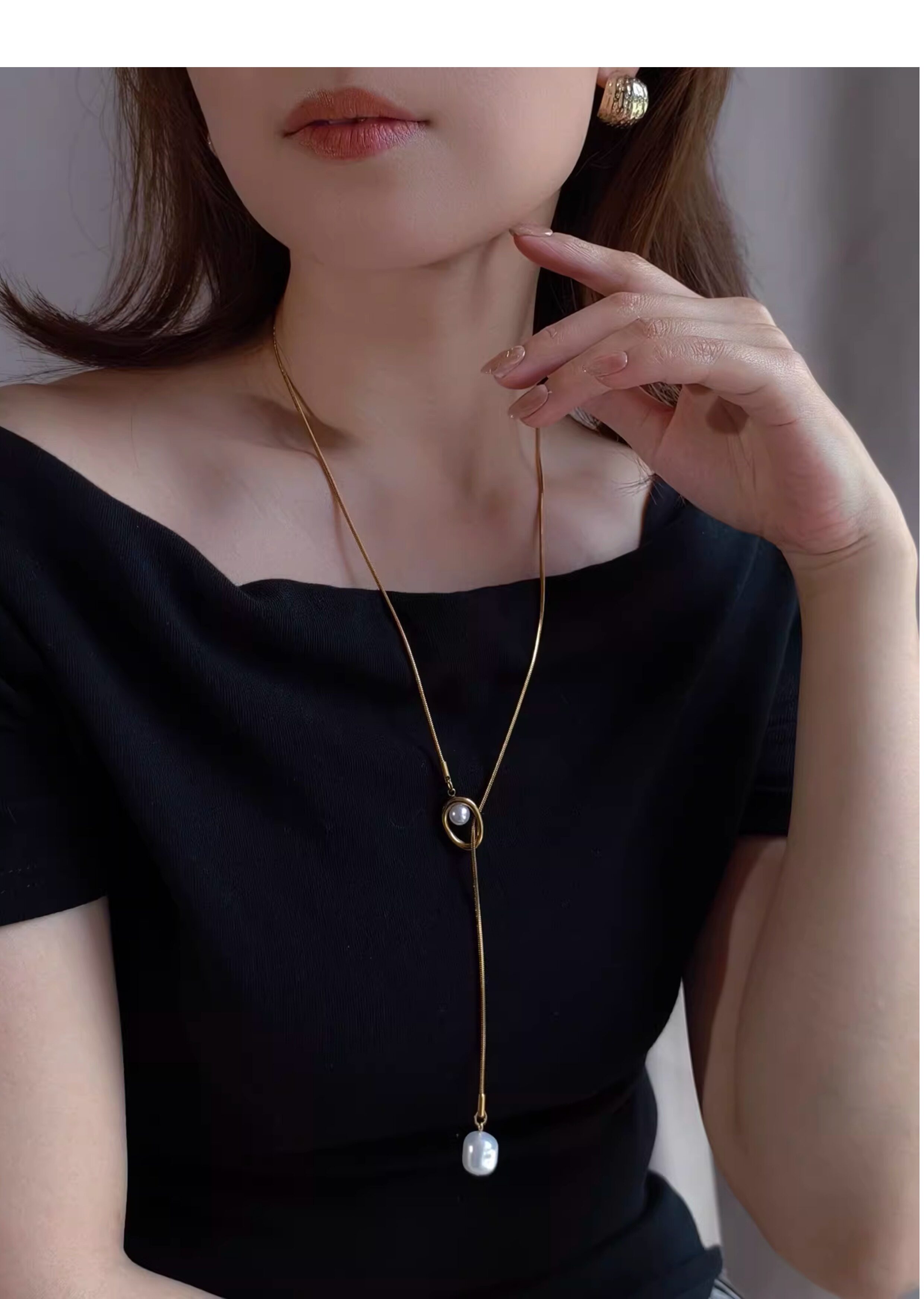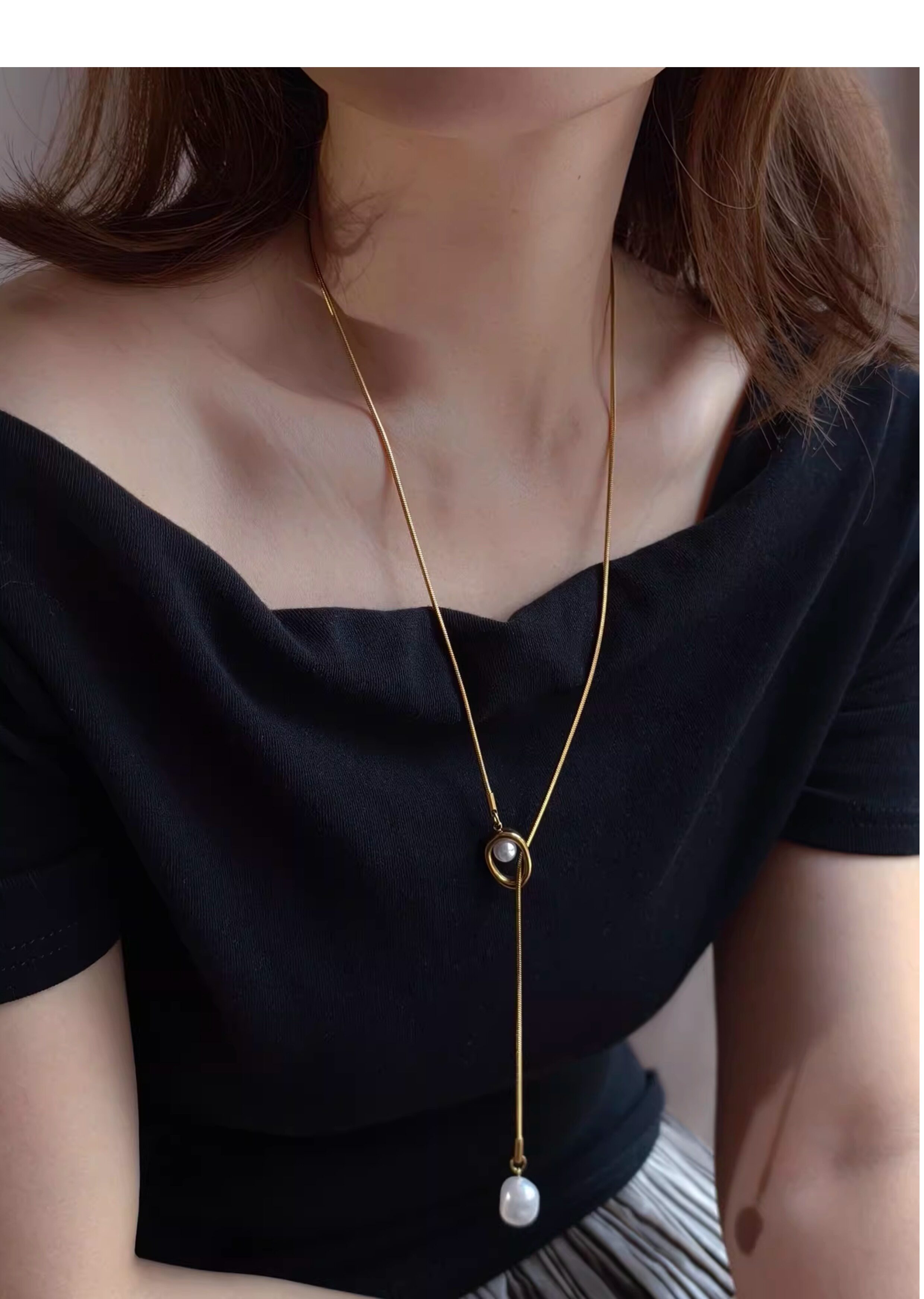 簡約仿珍珠項鍊大氣高檔高級感蛇骨鏈金色抽拉氣質長款輕奢毛衣鏈