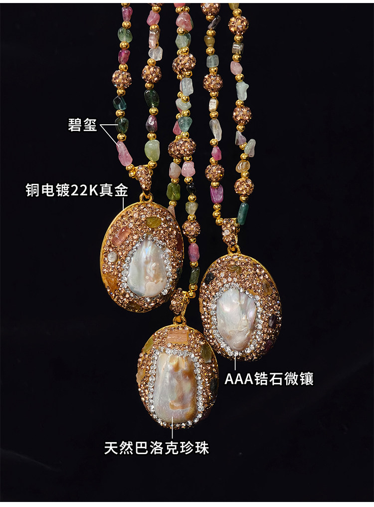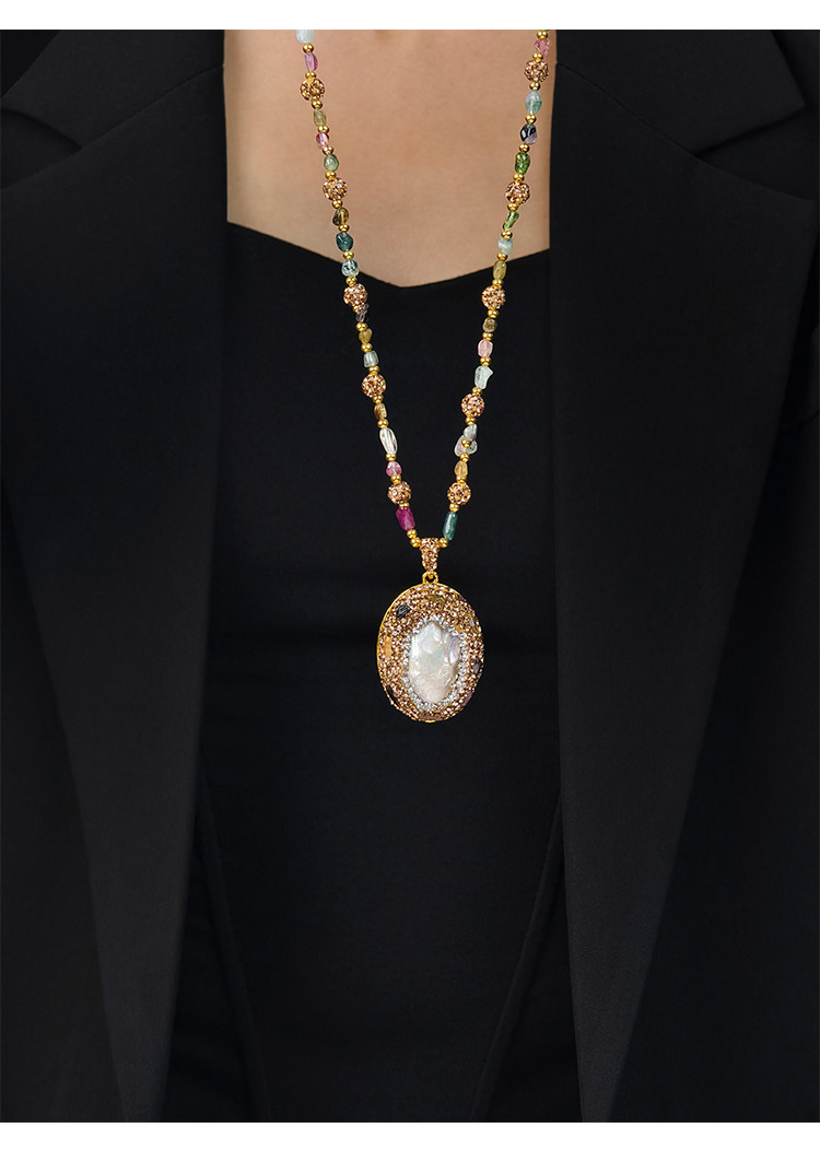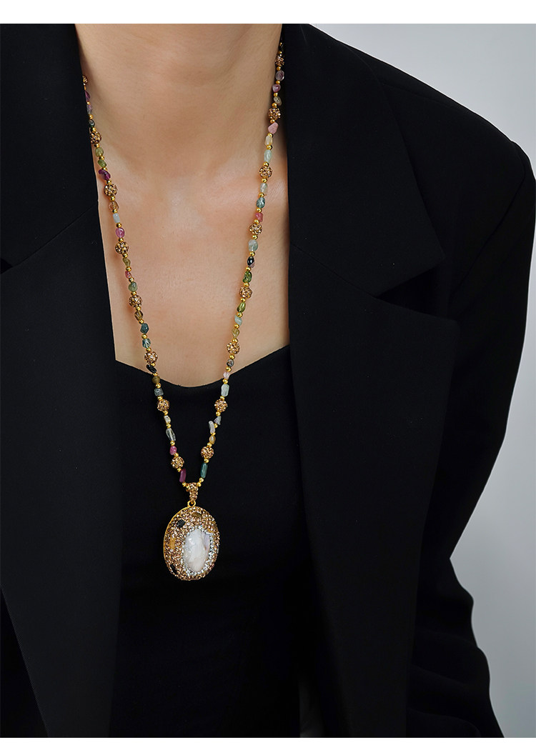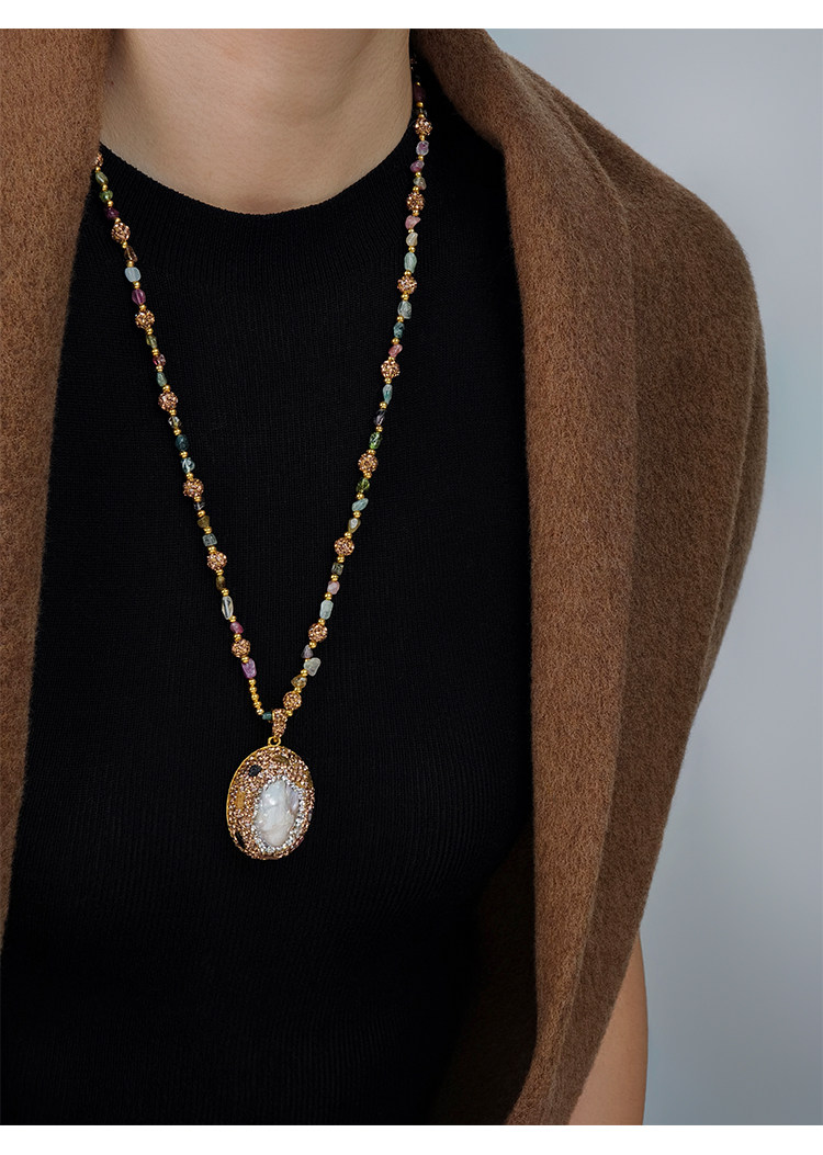 中世紀古典復古天然巴洛克珍珠吊墜項鍊天然石彩色碧璽長款毛衣鏈