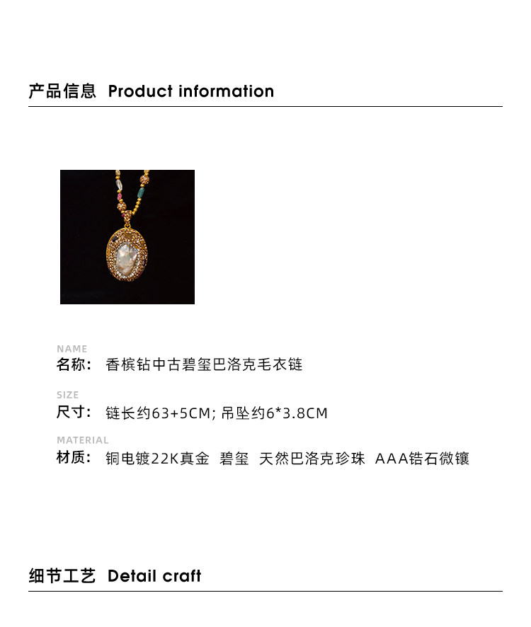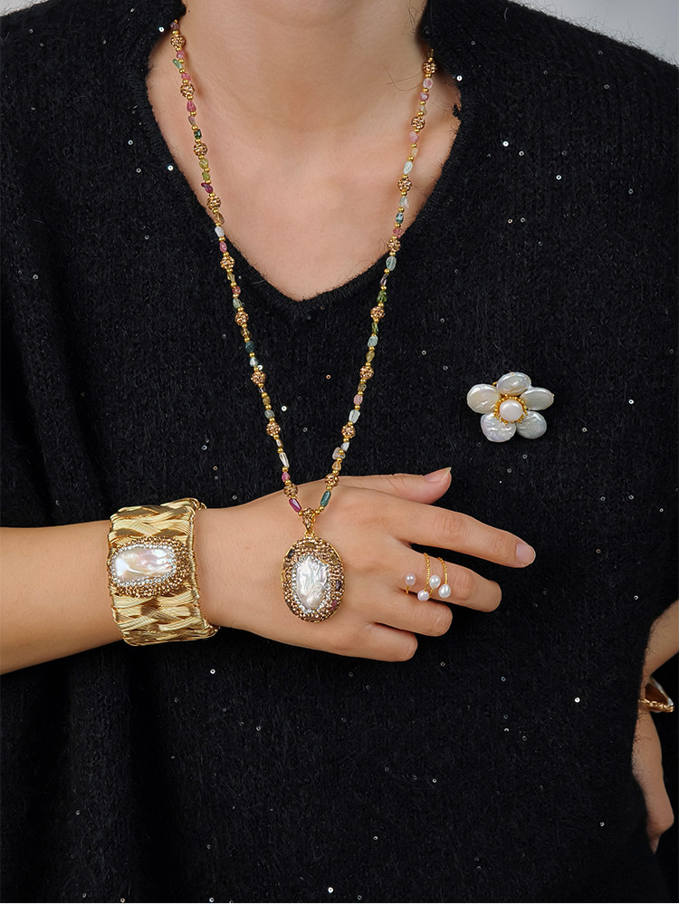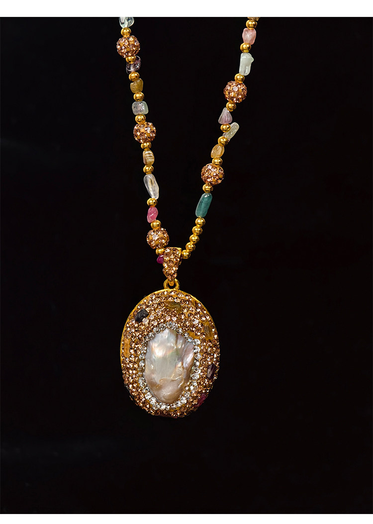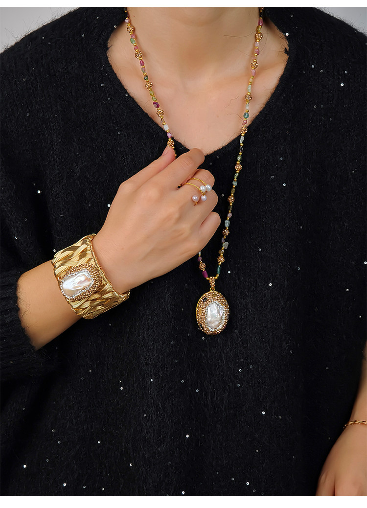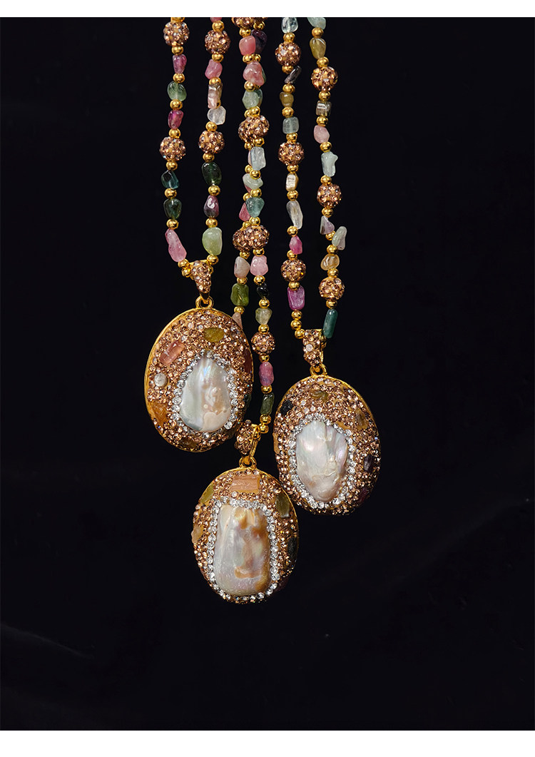 中世紀古典復古天然巴洛克珍珠吊墜項鍊天然石彩色碧璽長款毛衣鏈
