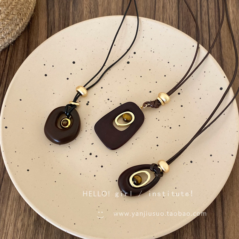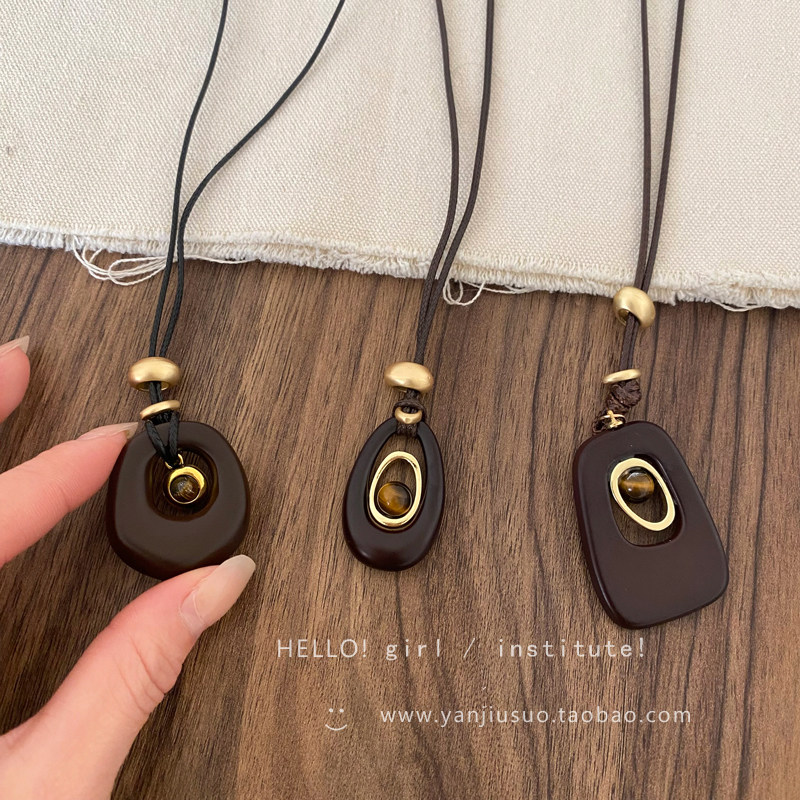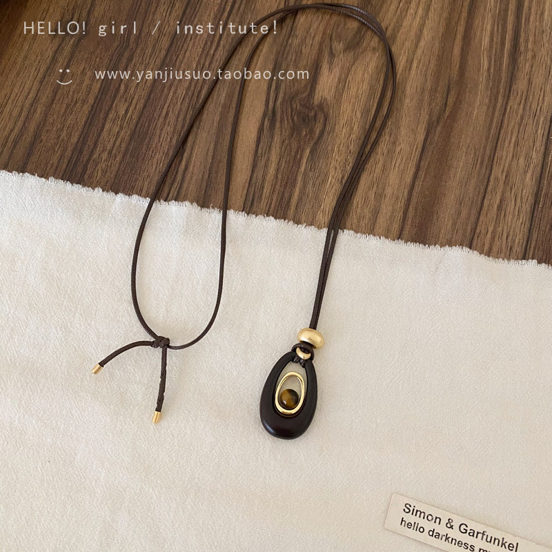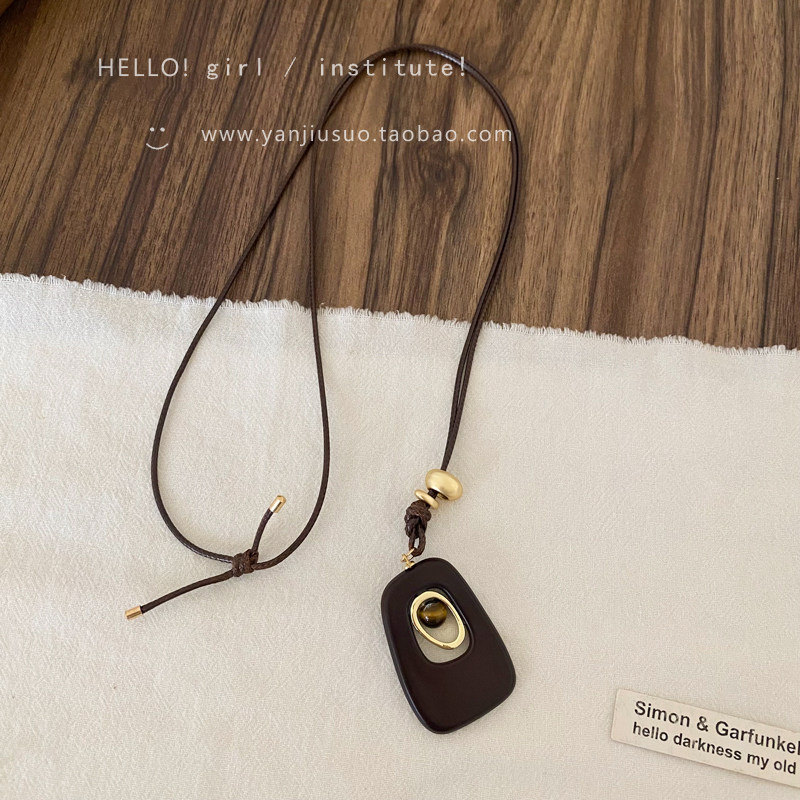 復古咖色虎眼石鏤空吊墜項鍊女秋冬獨特設計感長款掛脖毛衣鏈配飾
