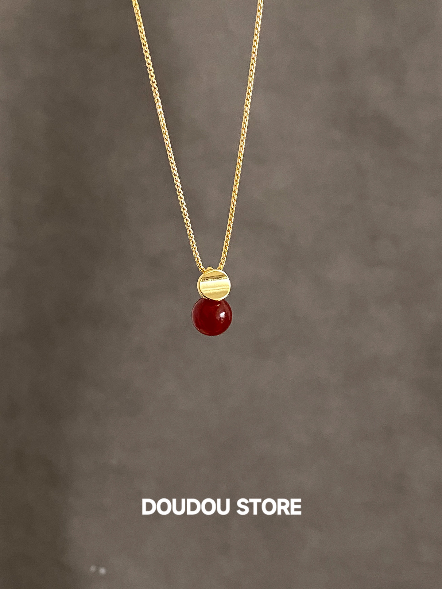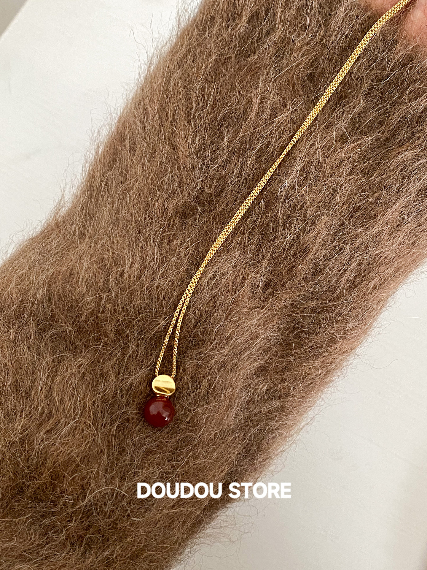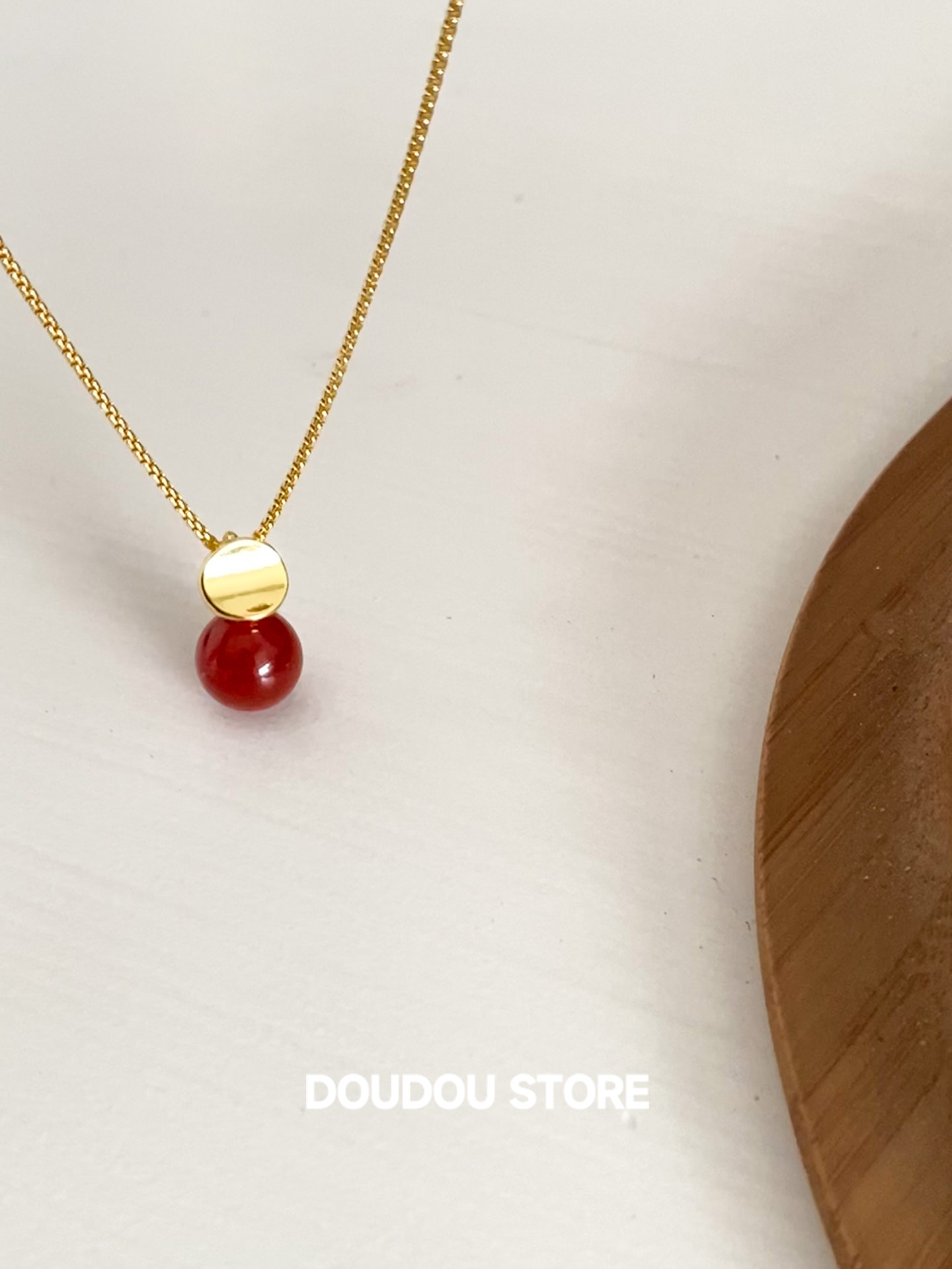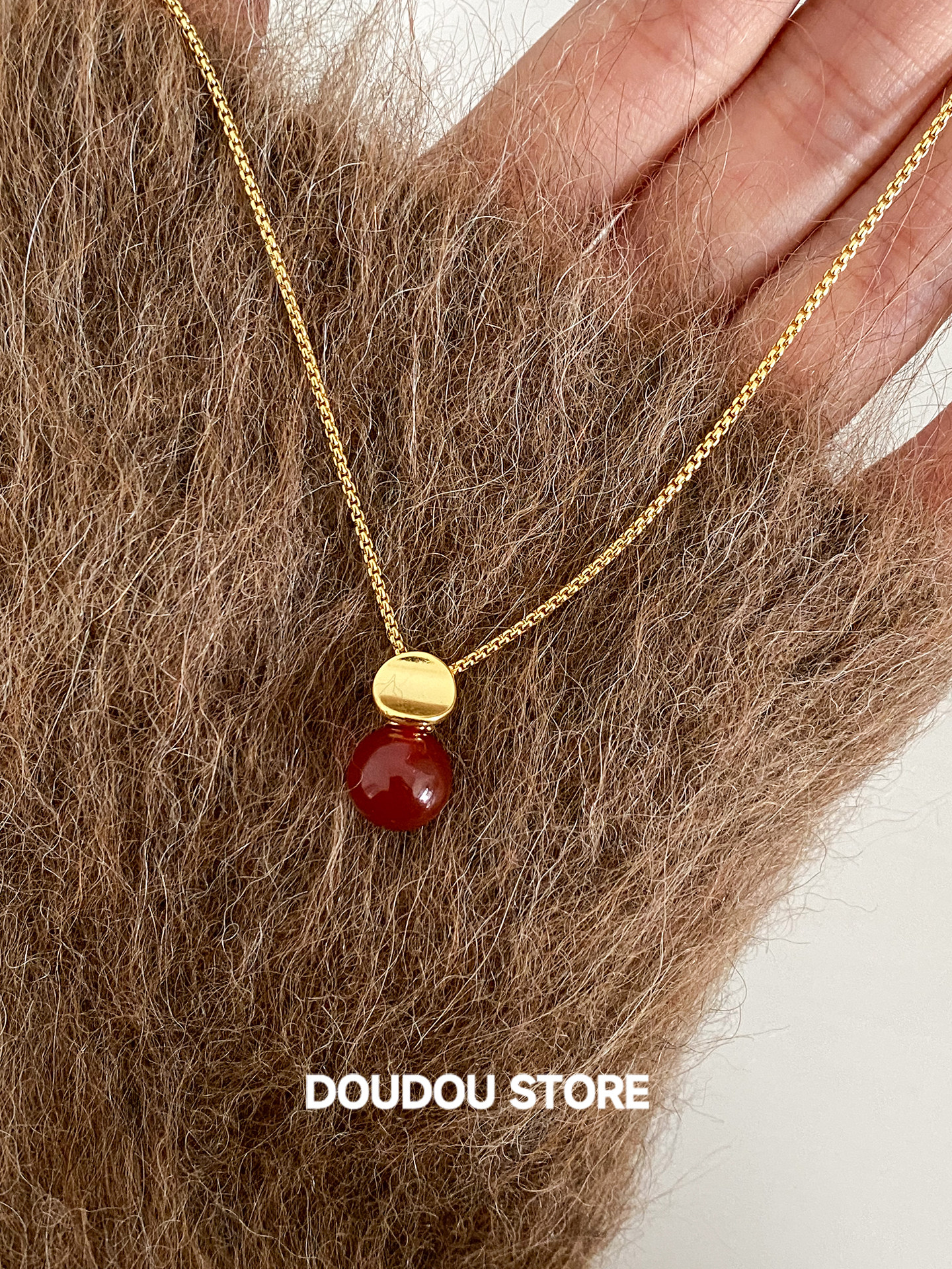 DOUDOUSTORE 高保色長版80cm新年天然紅瑪瑙幾何圓形項鍊毛衣鏈女