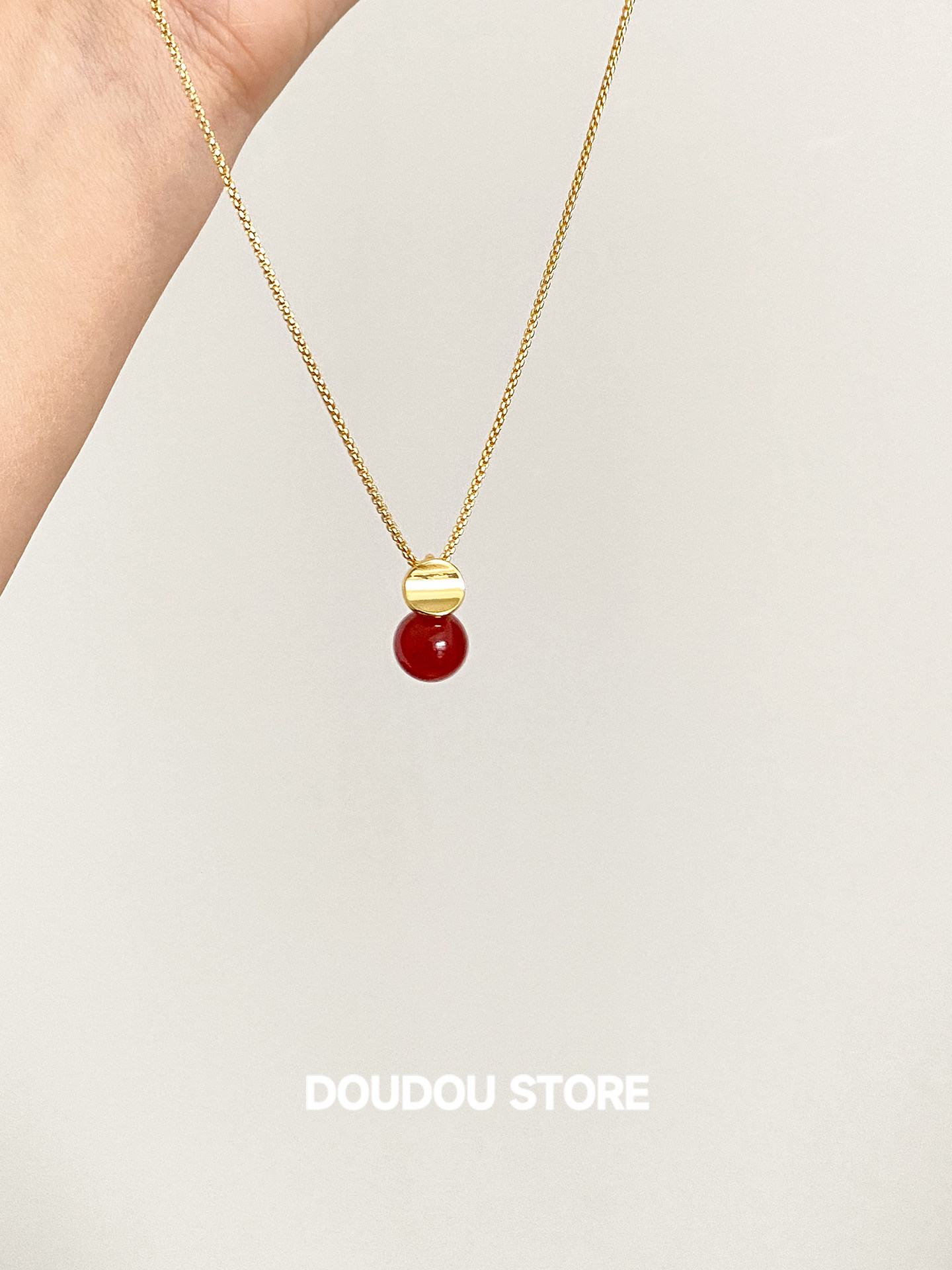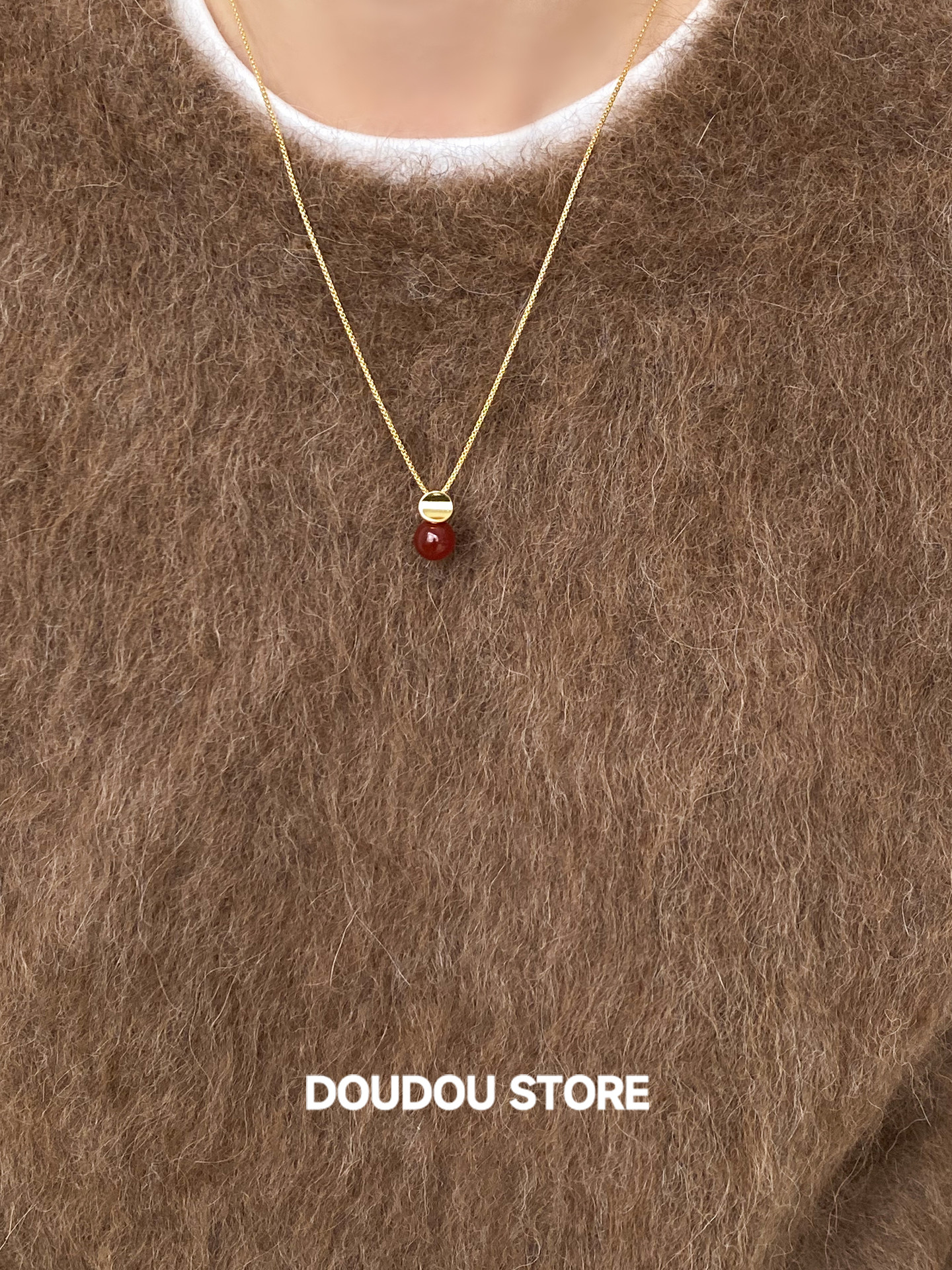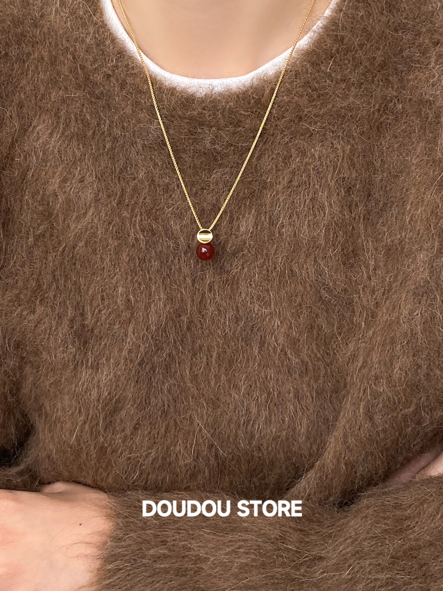 DOUDOUSTORE 高保色長版80cm新年天然紅瑪瑙幾何圓形項鍊毛衣鏈女