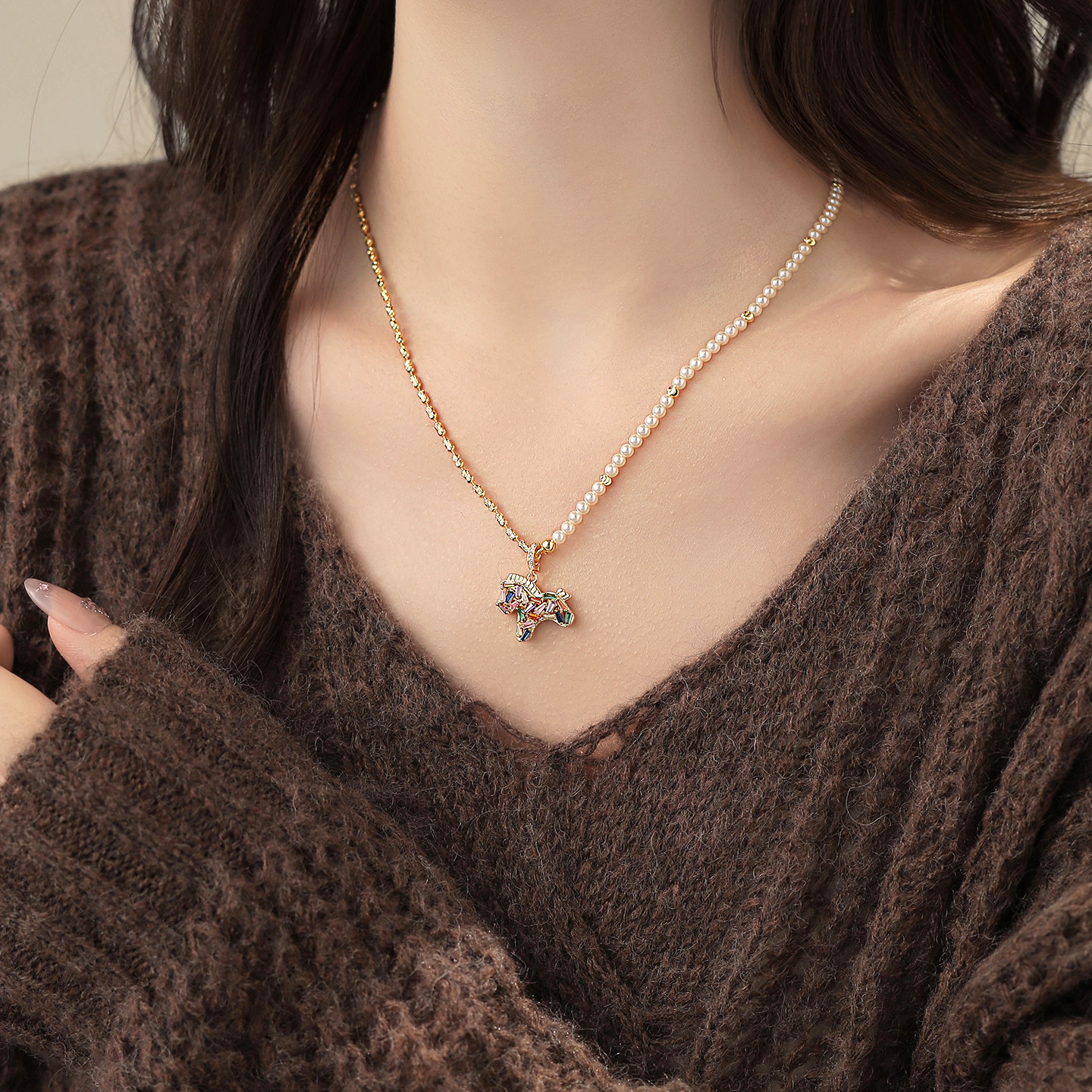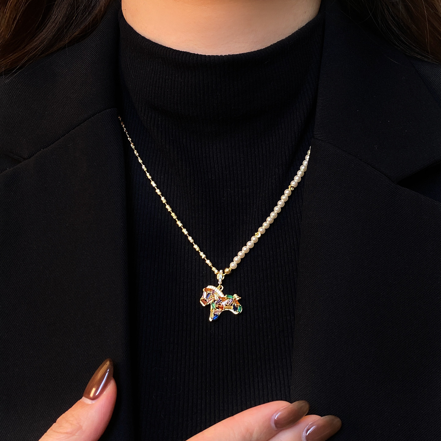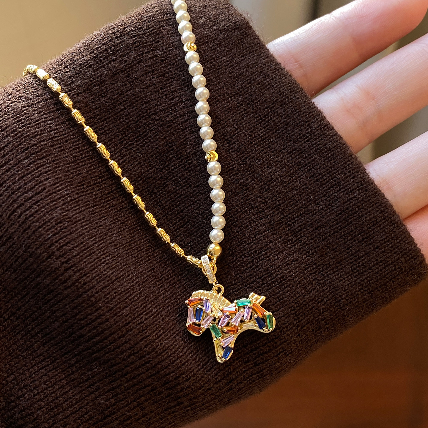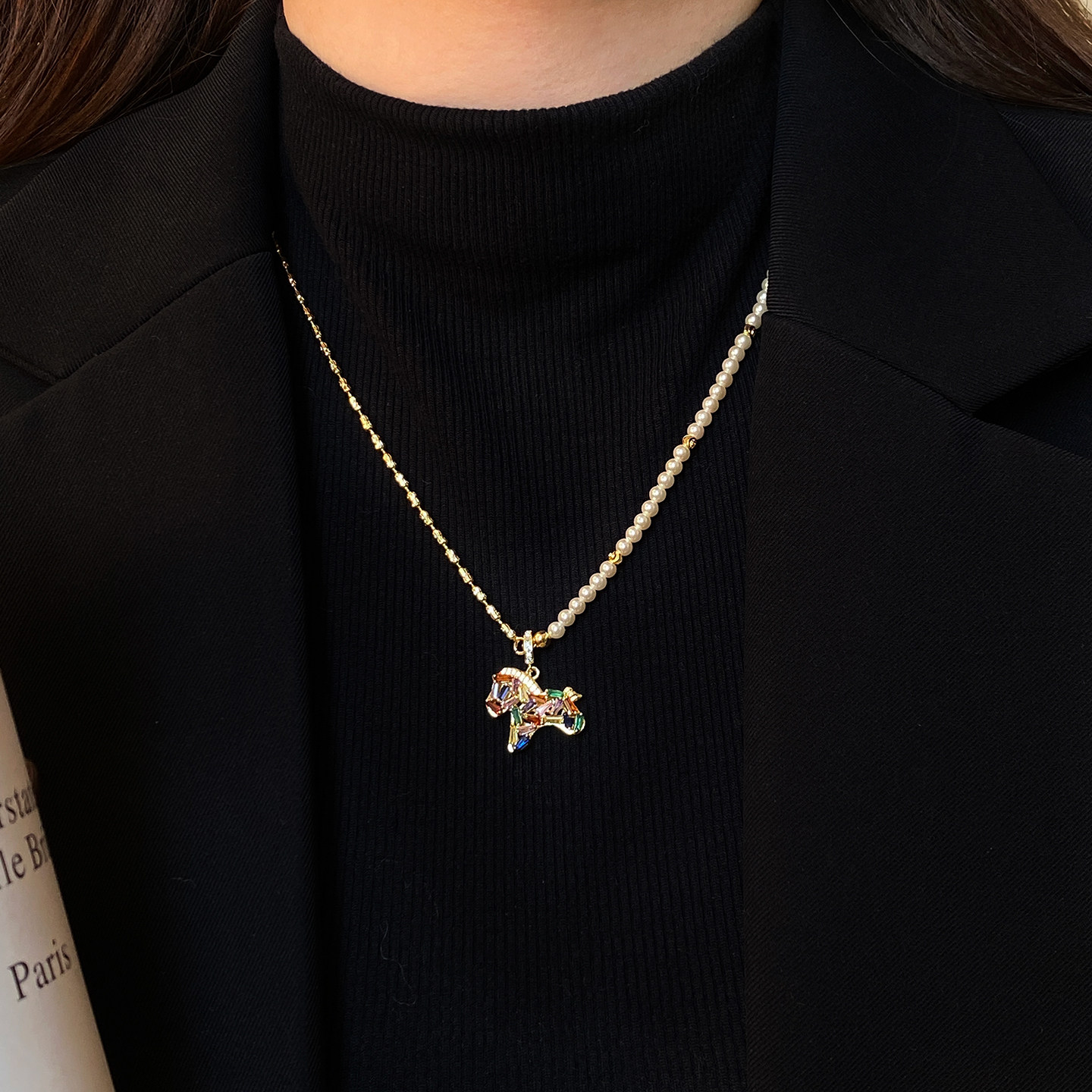 馬年彩色小馬吊墜珍珠項鍊女輕奢高級感小衆毛衣鏈琺瑯本命年配飾