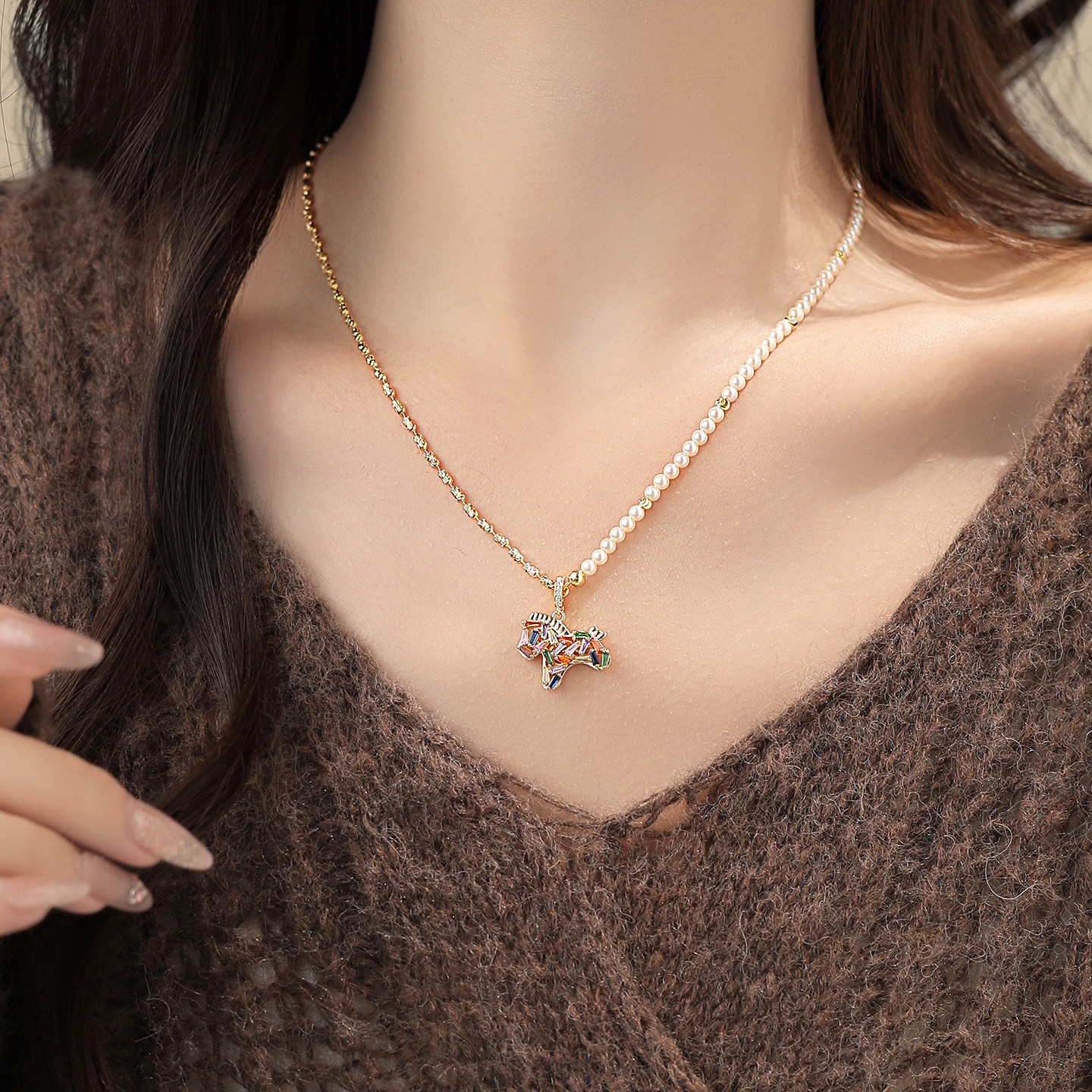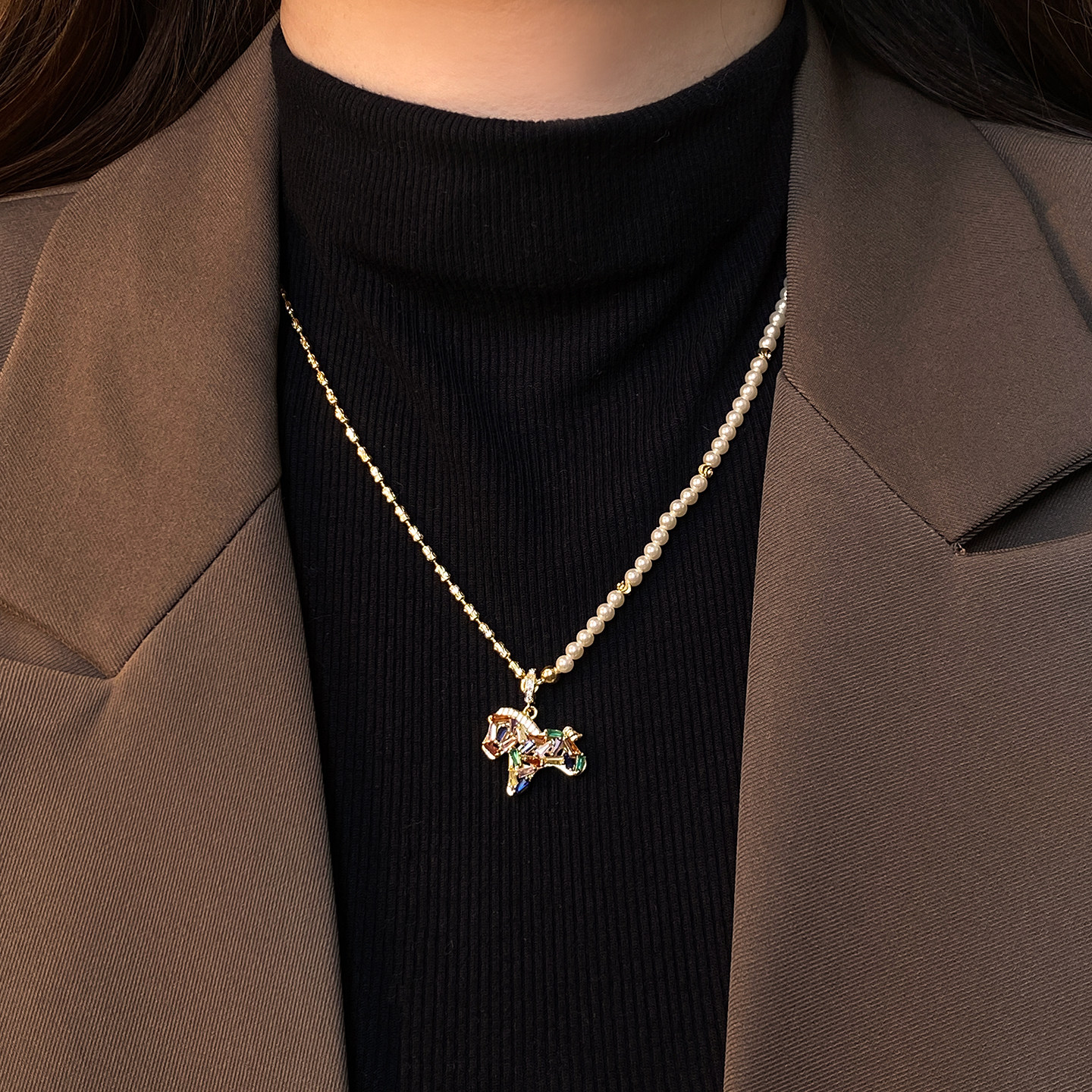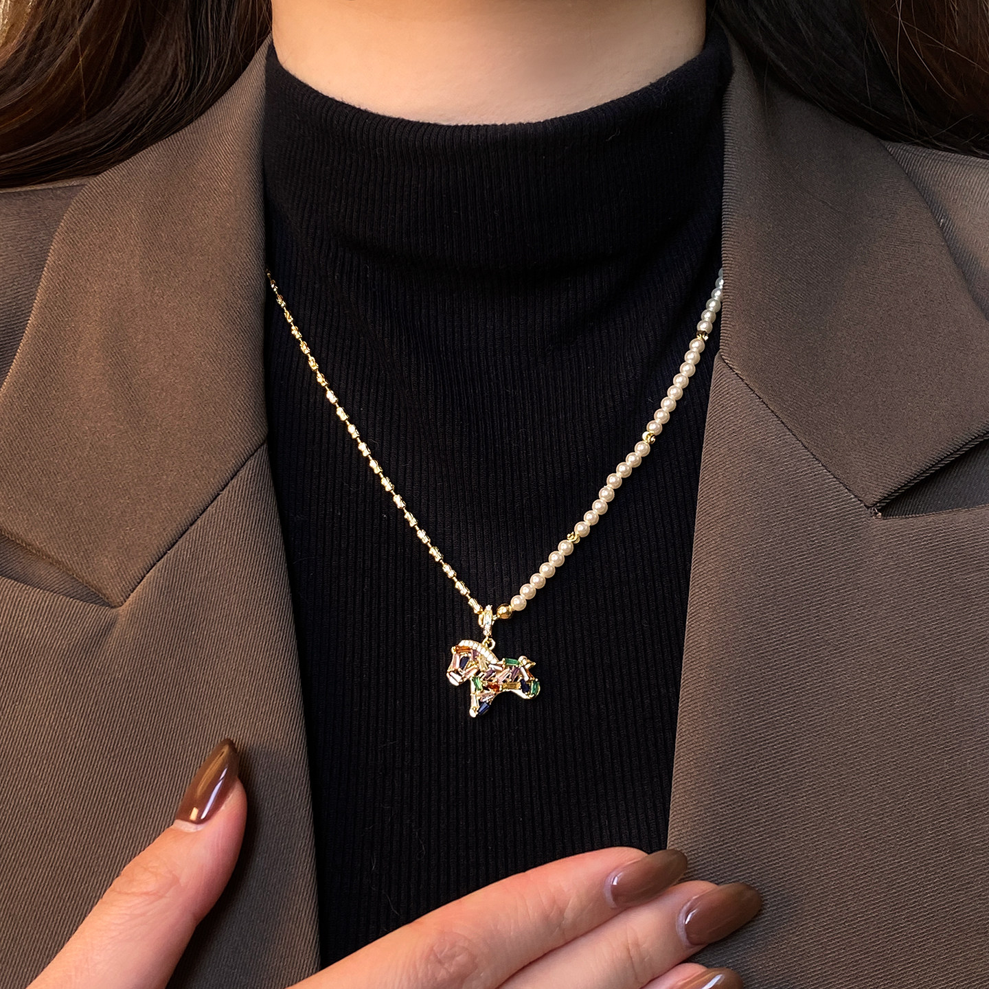 馬年彩色小馬吊墜珍珠項鍊女輕奢高級感小衆毛衣鏈琺瑯本命年配飾