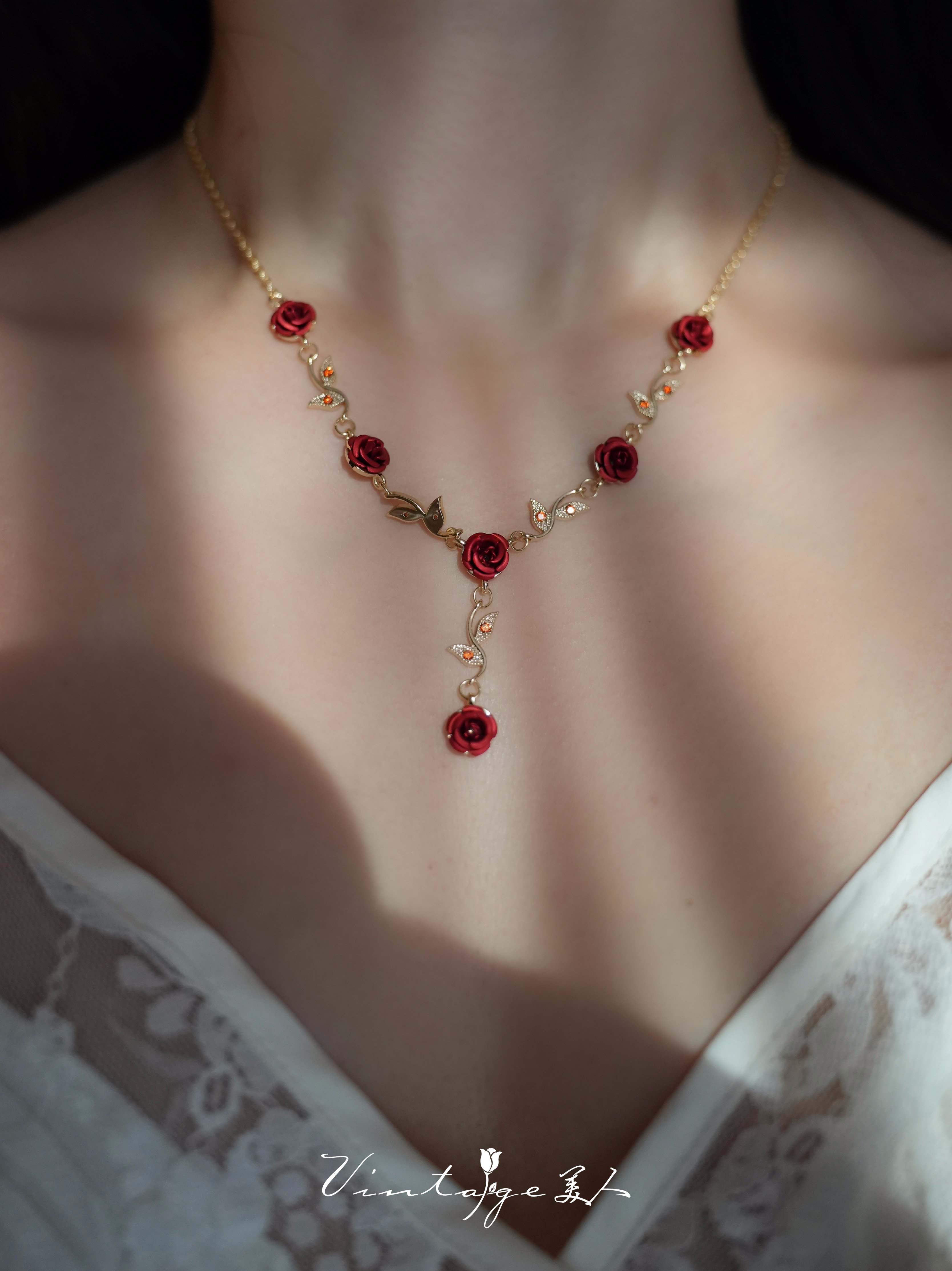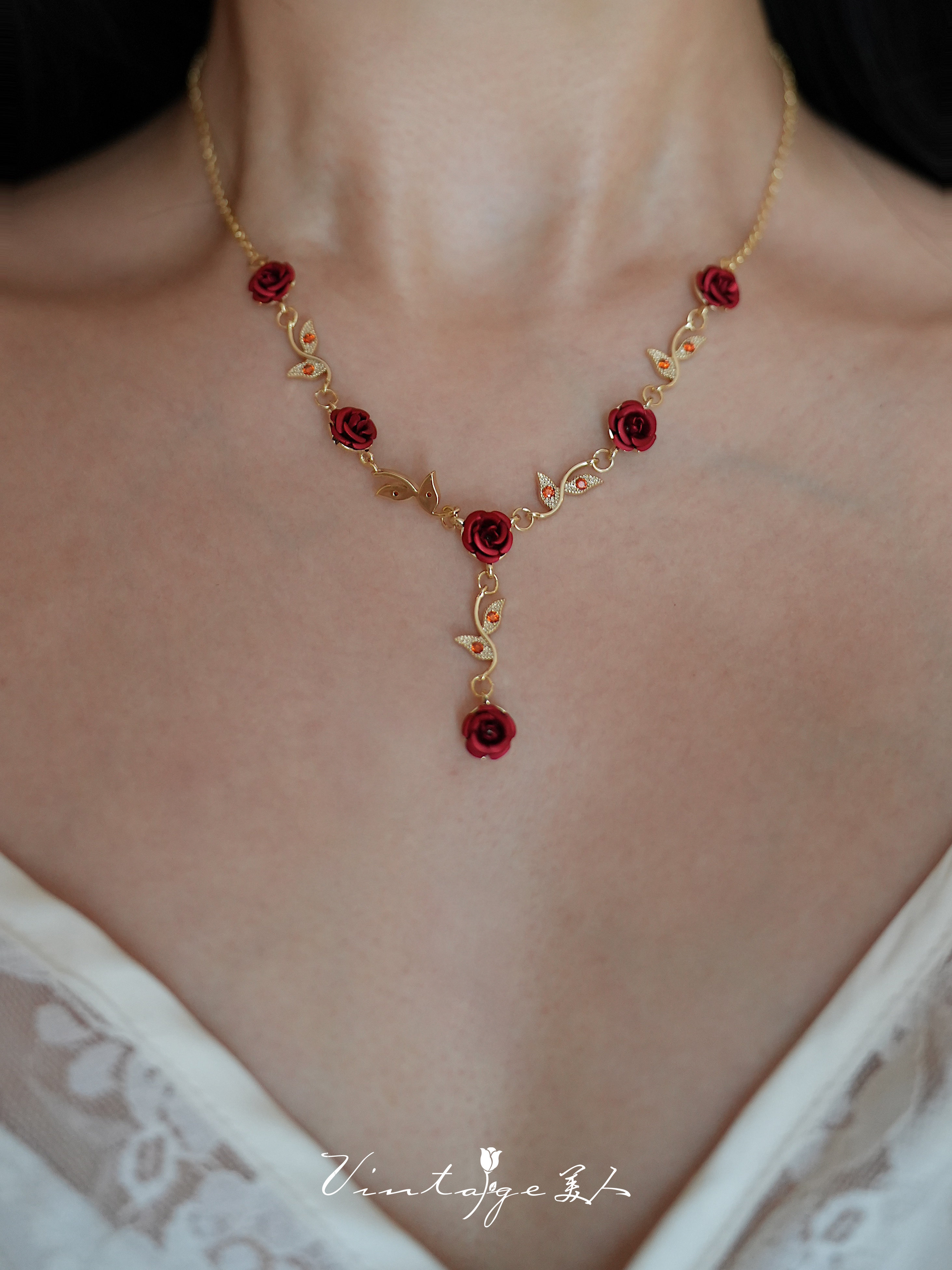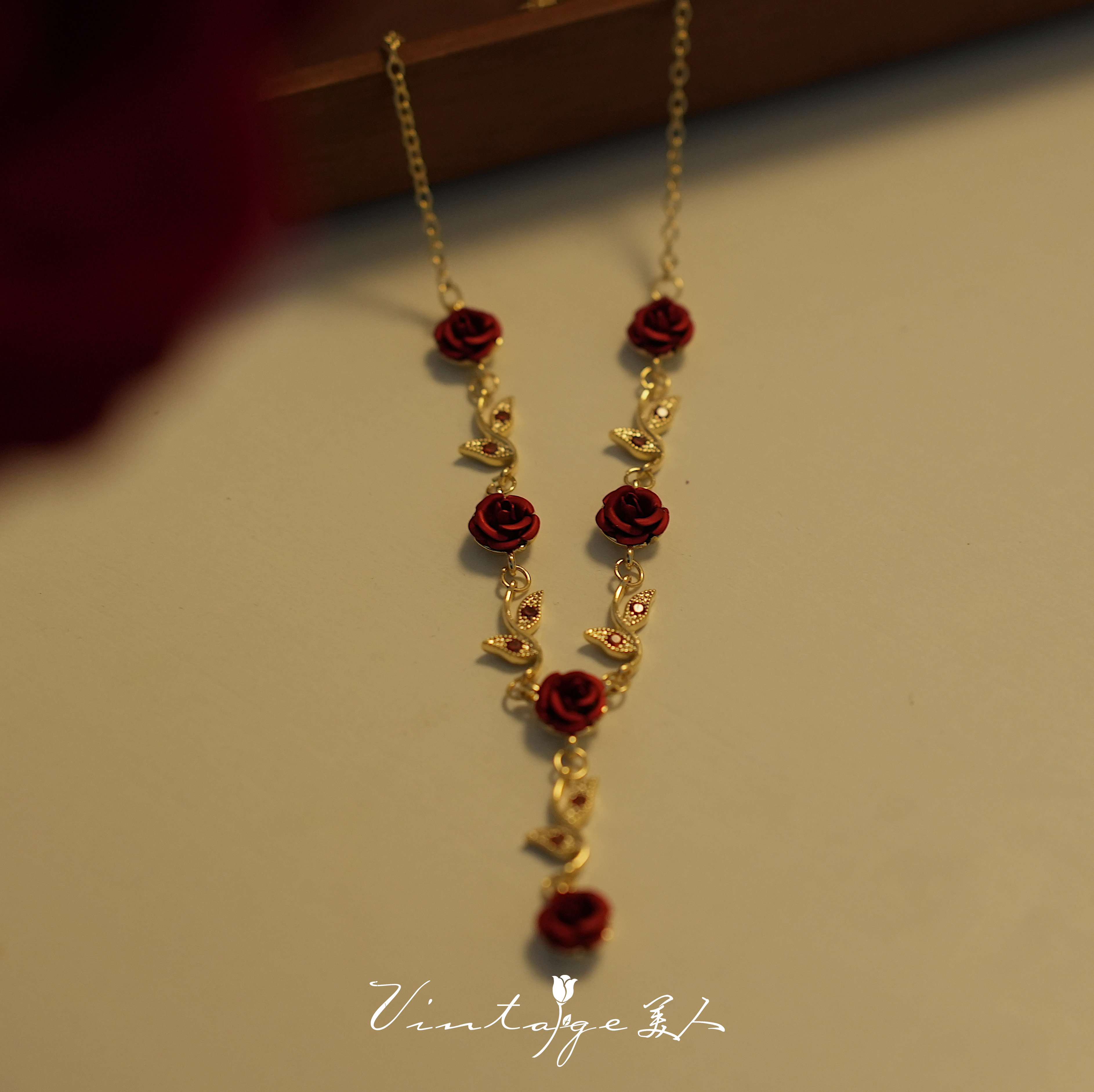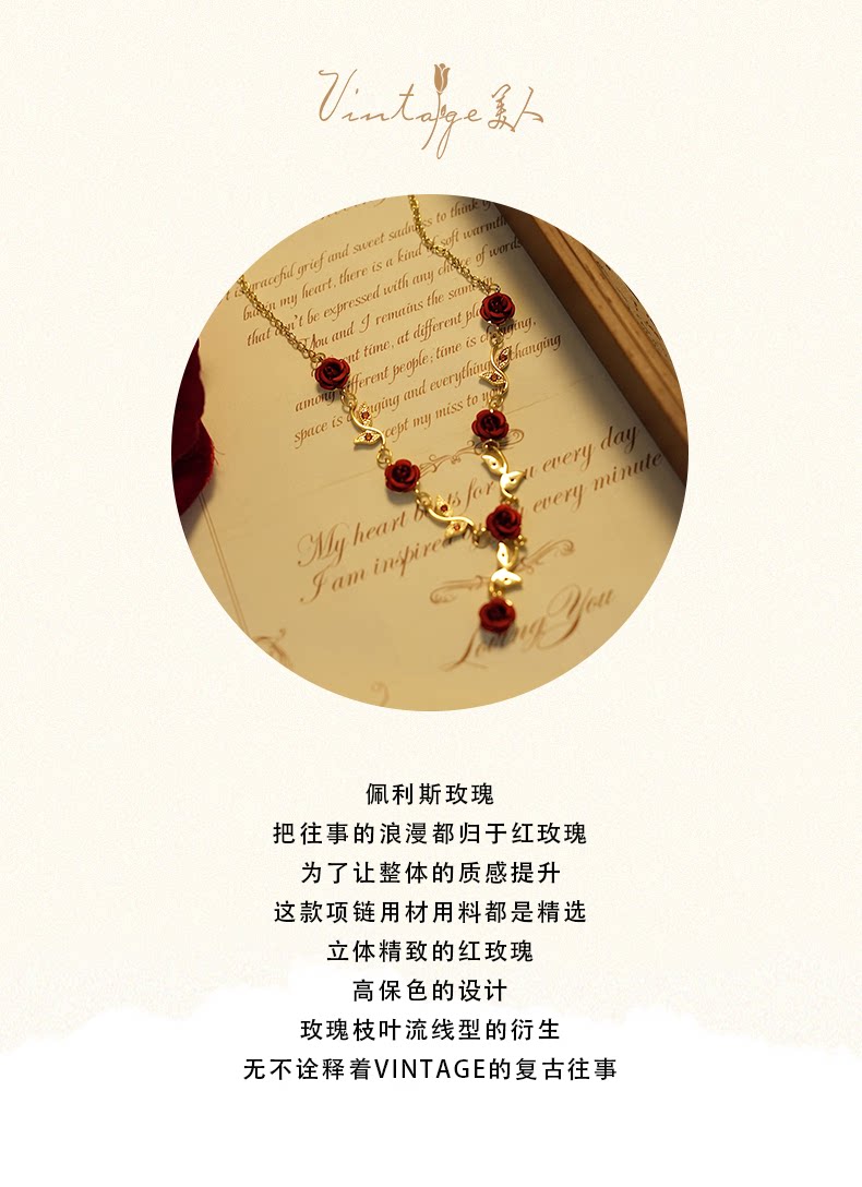 「珮利斯玫瑰」vintage法式復古優雅森系高級感紅玫瑰項鍊/鎖骨鍊
