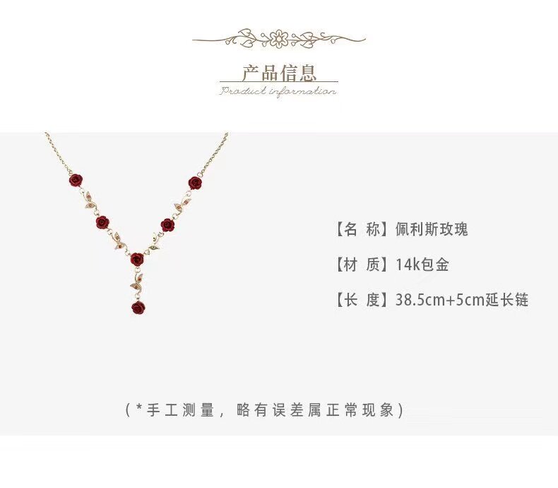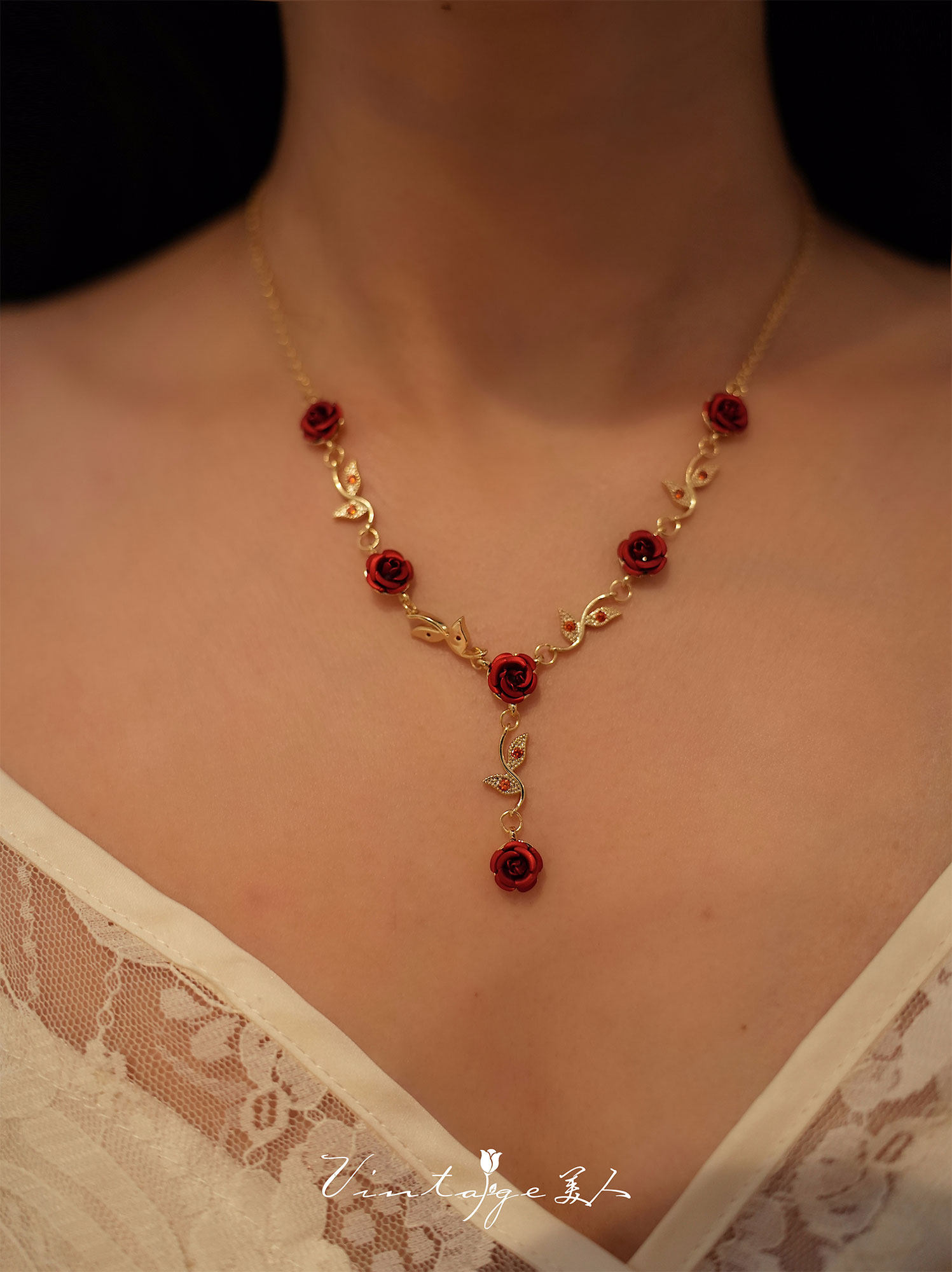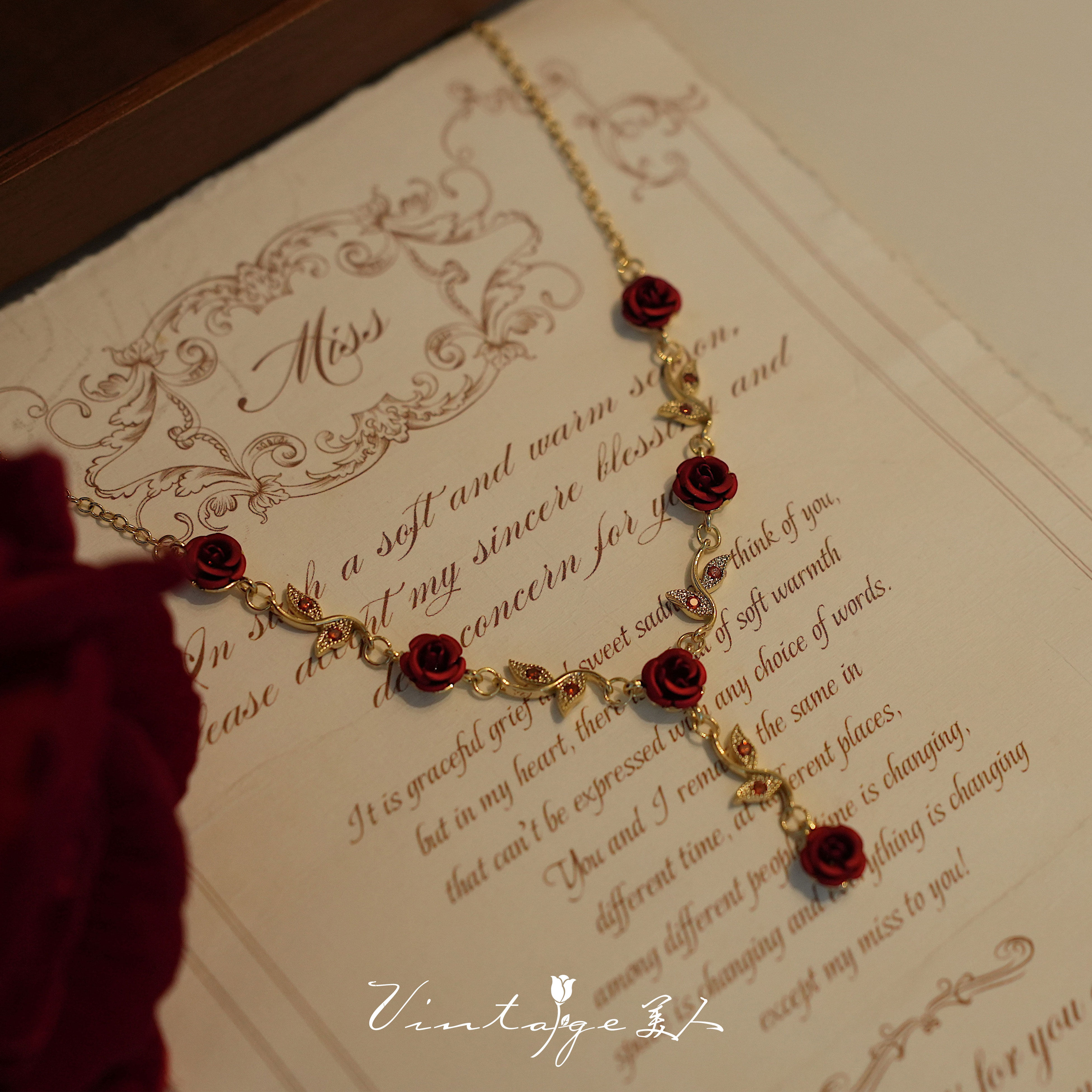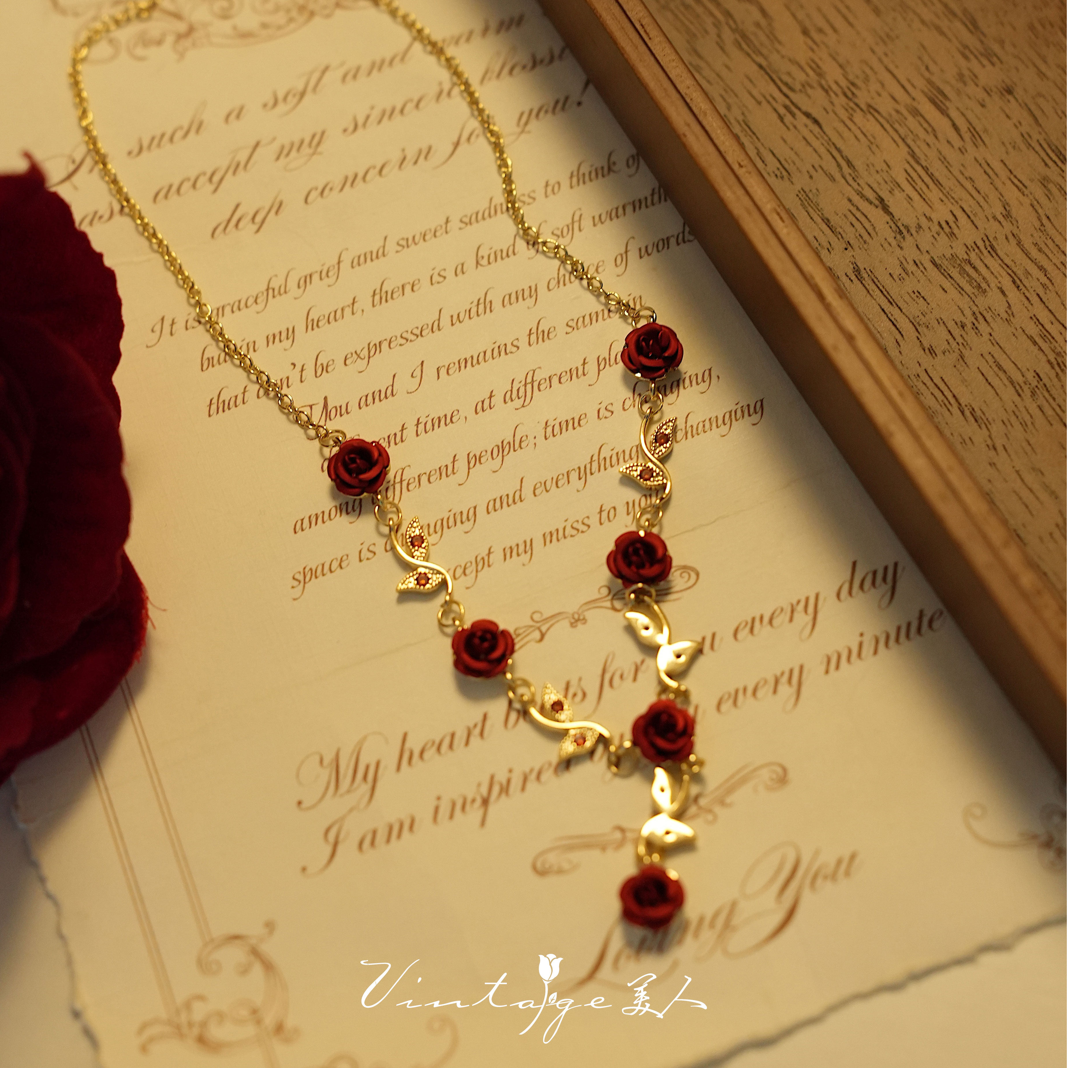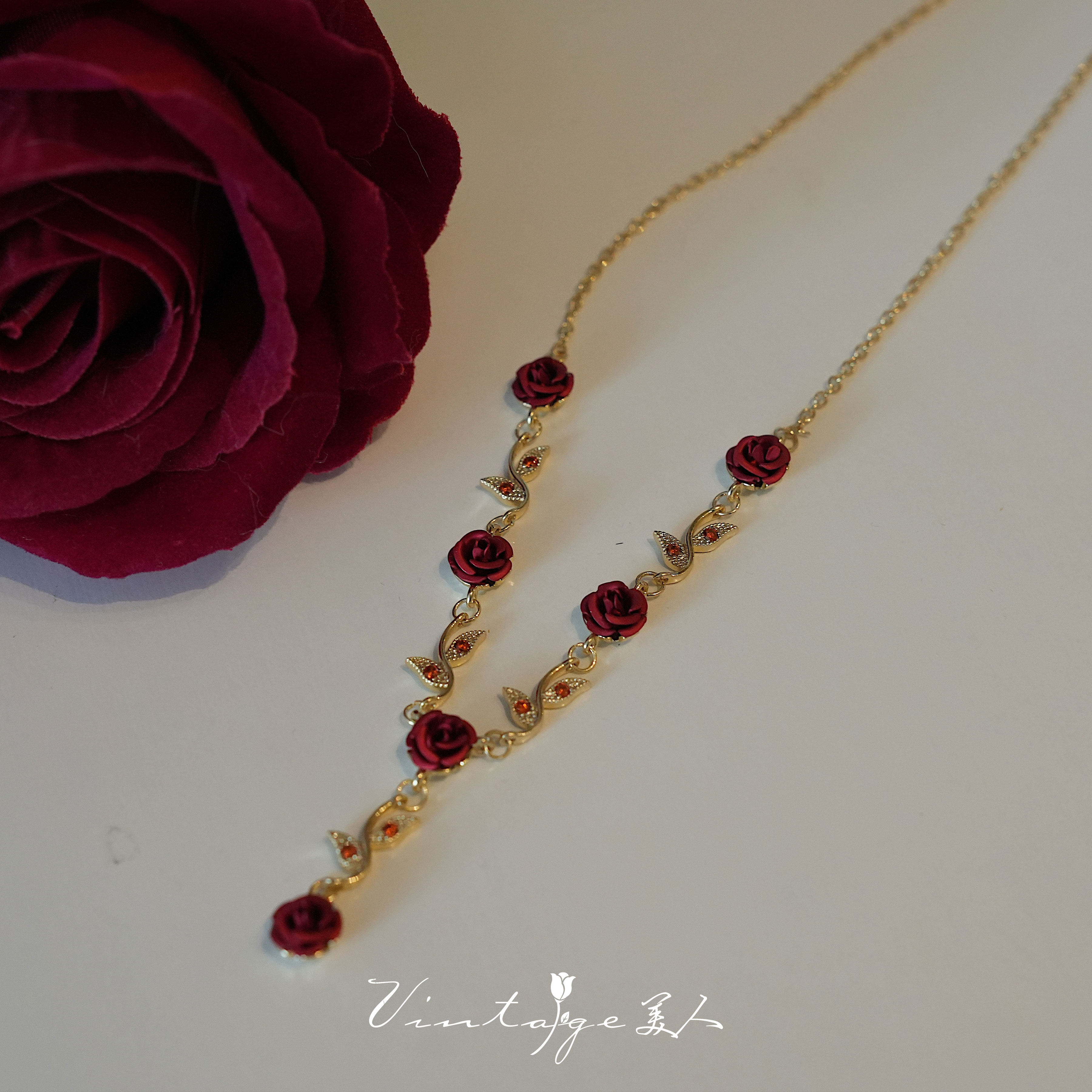 「珮利斯玫瑰」vintage法式復古優雅森系高級感紅玫瑰項鍊/鎖骨鍊