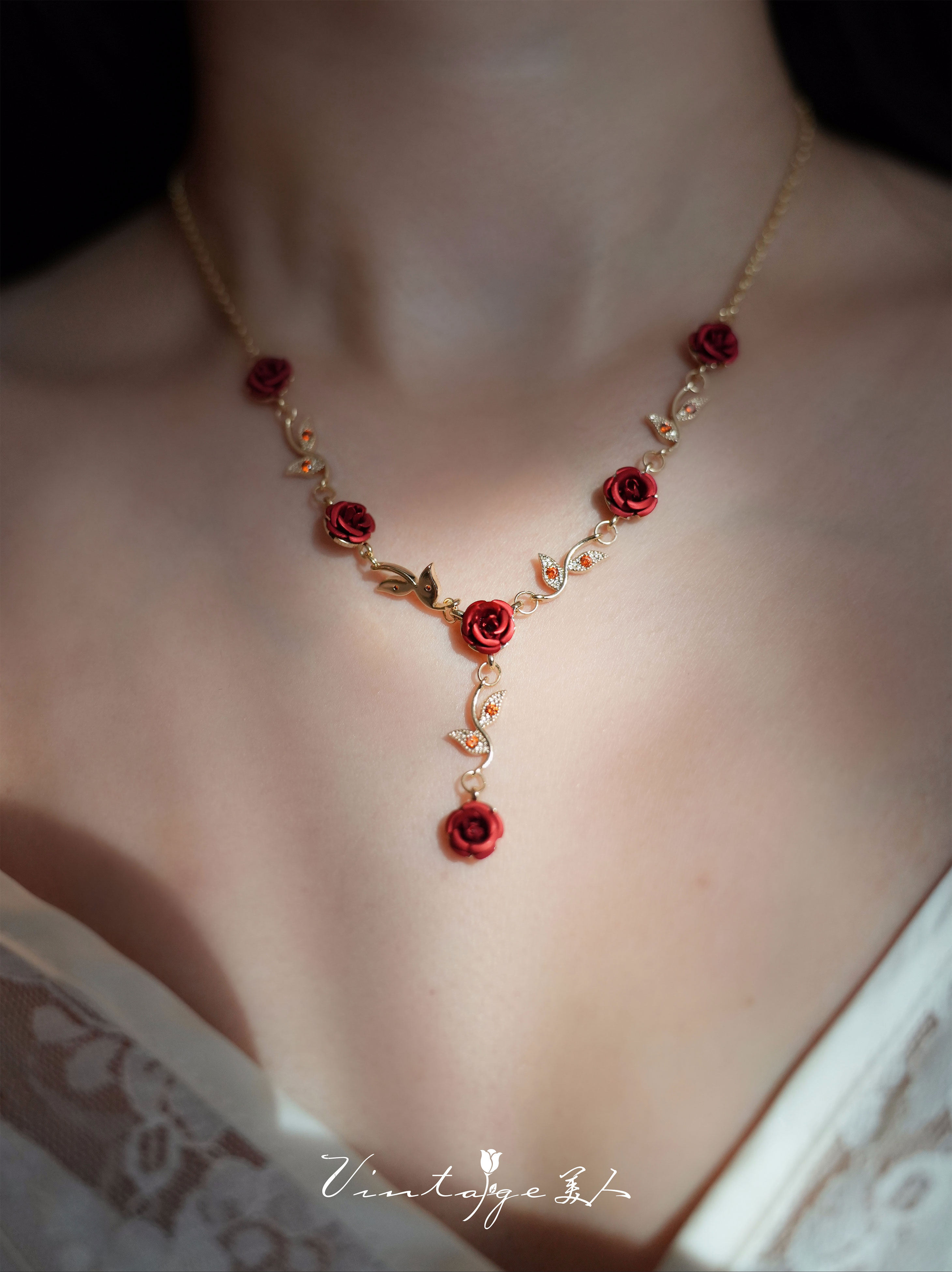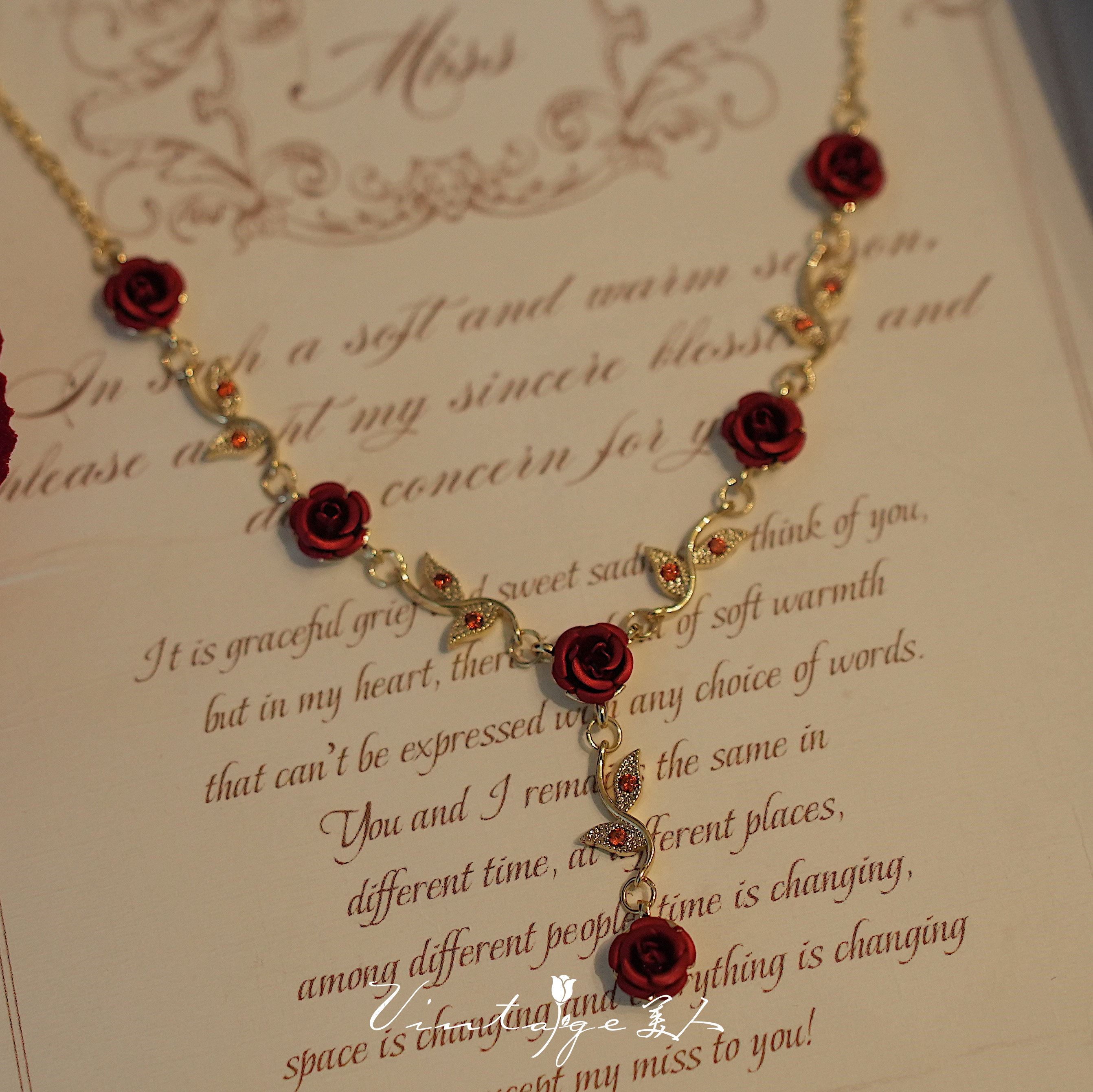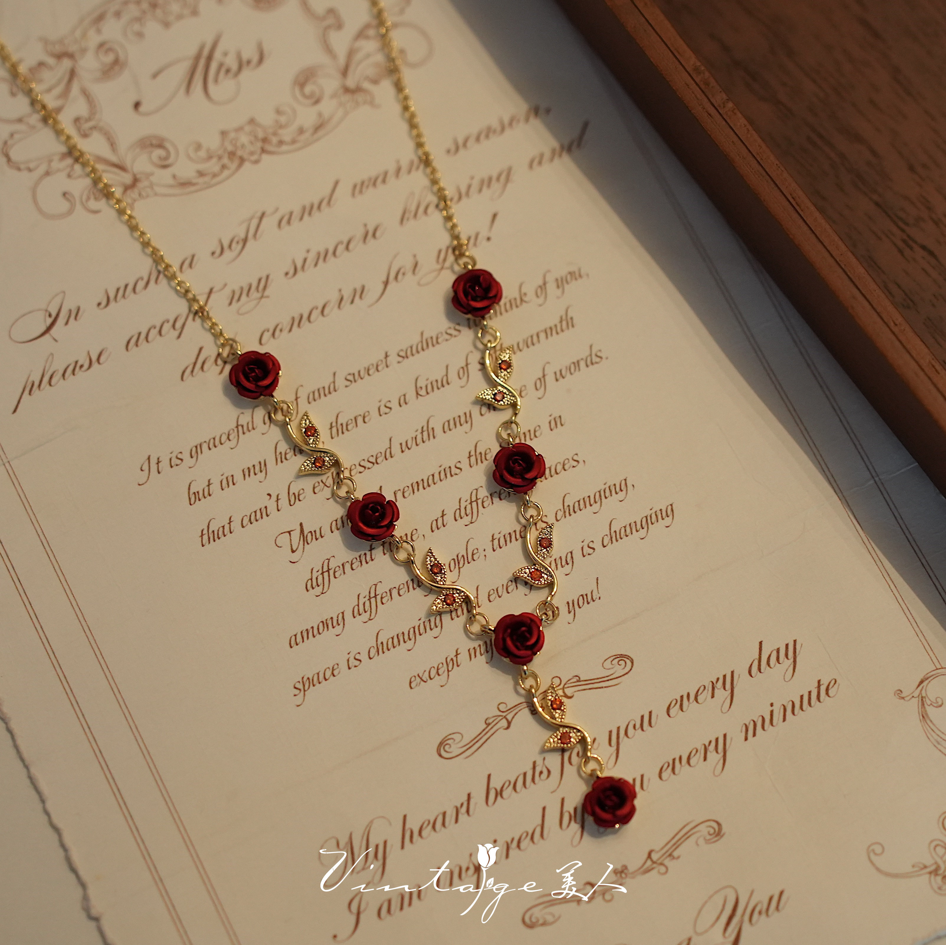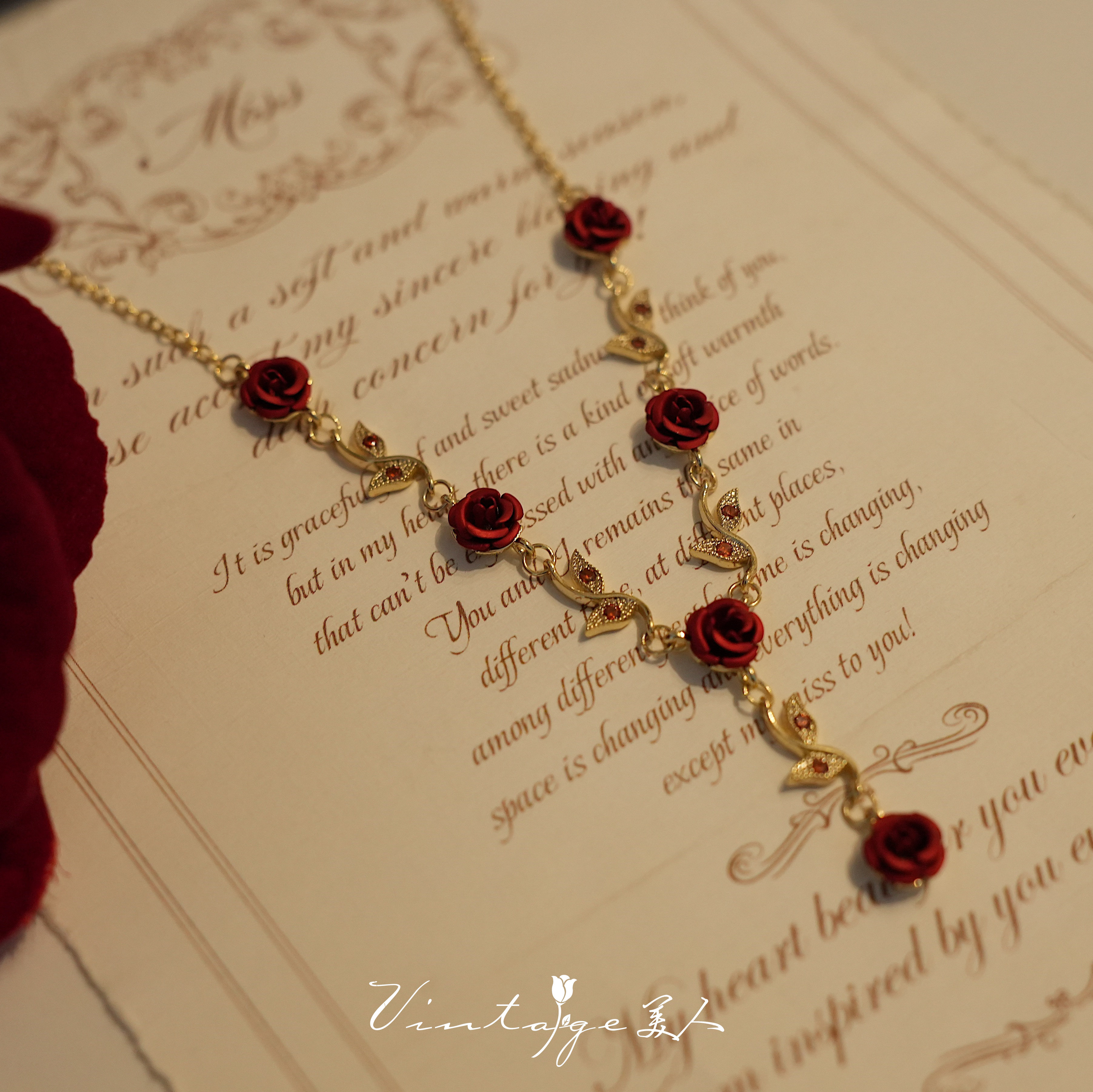 「珮利斯玫瑰」vintage法式復古優雅森系高級感紅玫瑰項鍊/鎖骨鍊