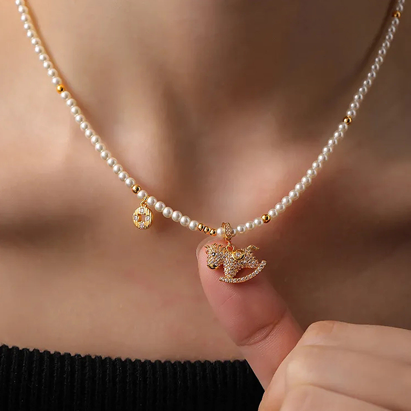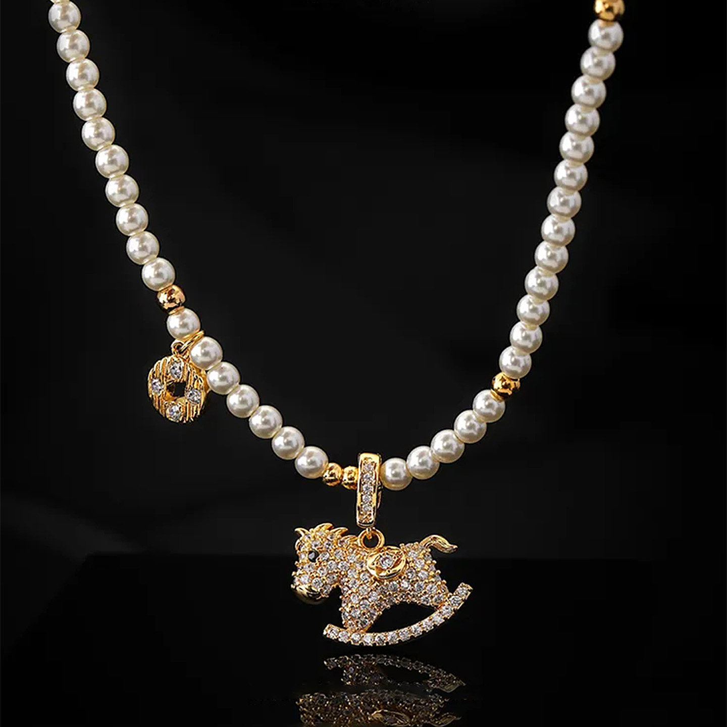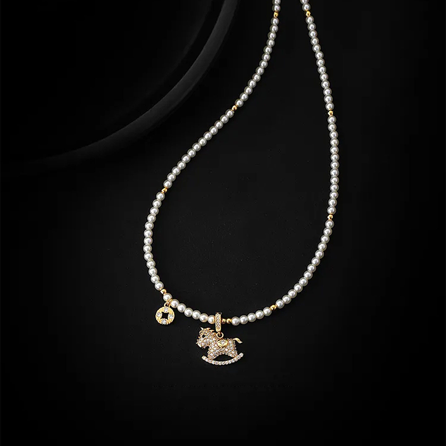 「馬上有錢」普陀山滿鑽小馬珍珠錢幣項鍊馬年本命年招財鎖骨鍊