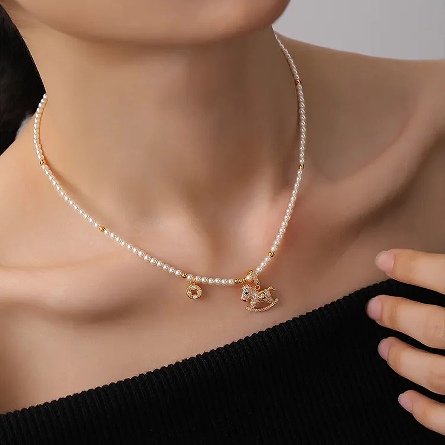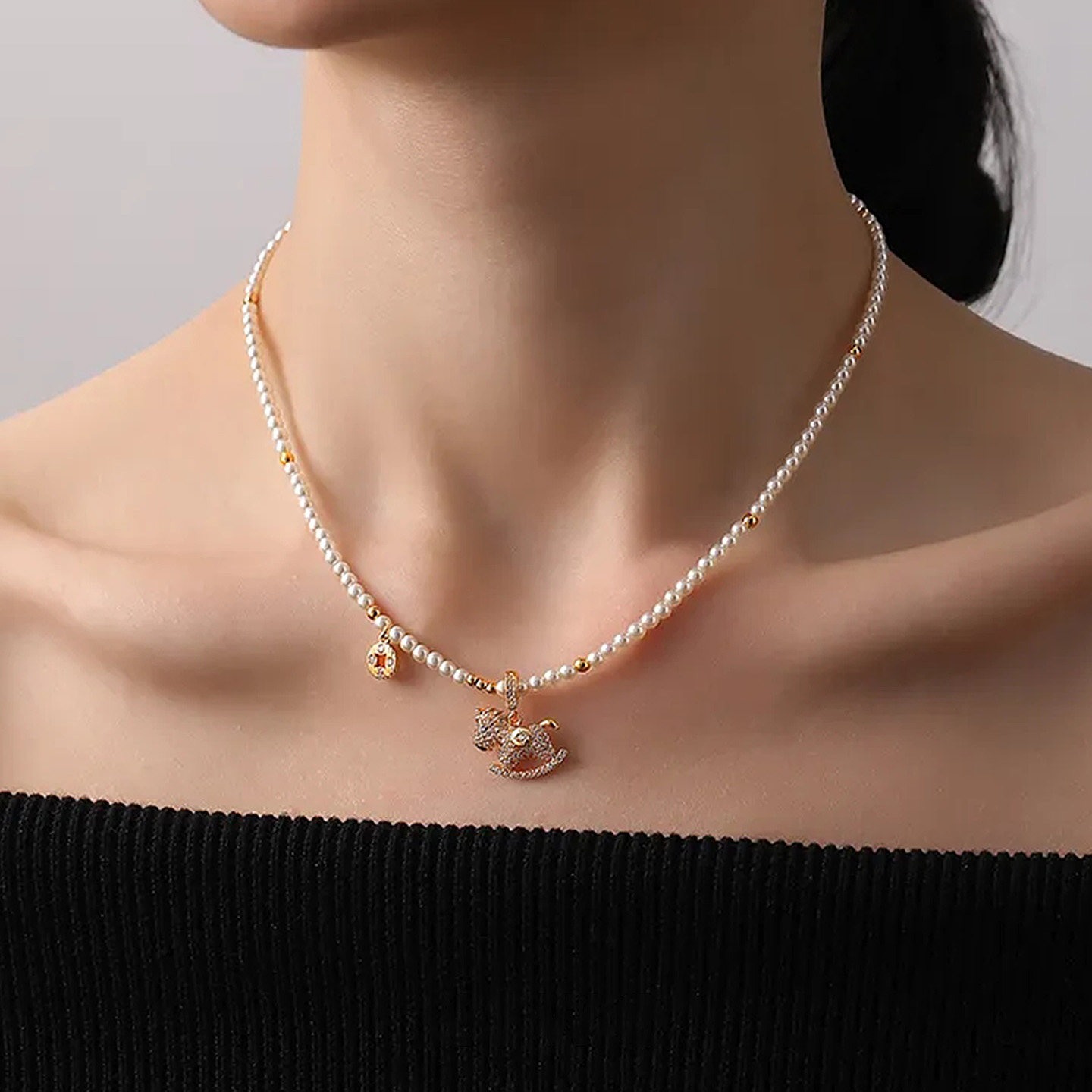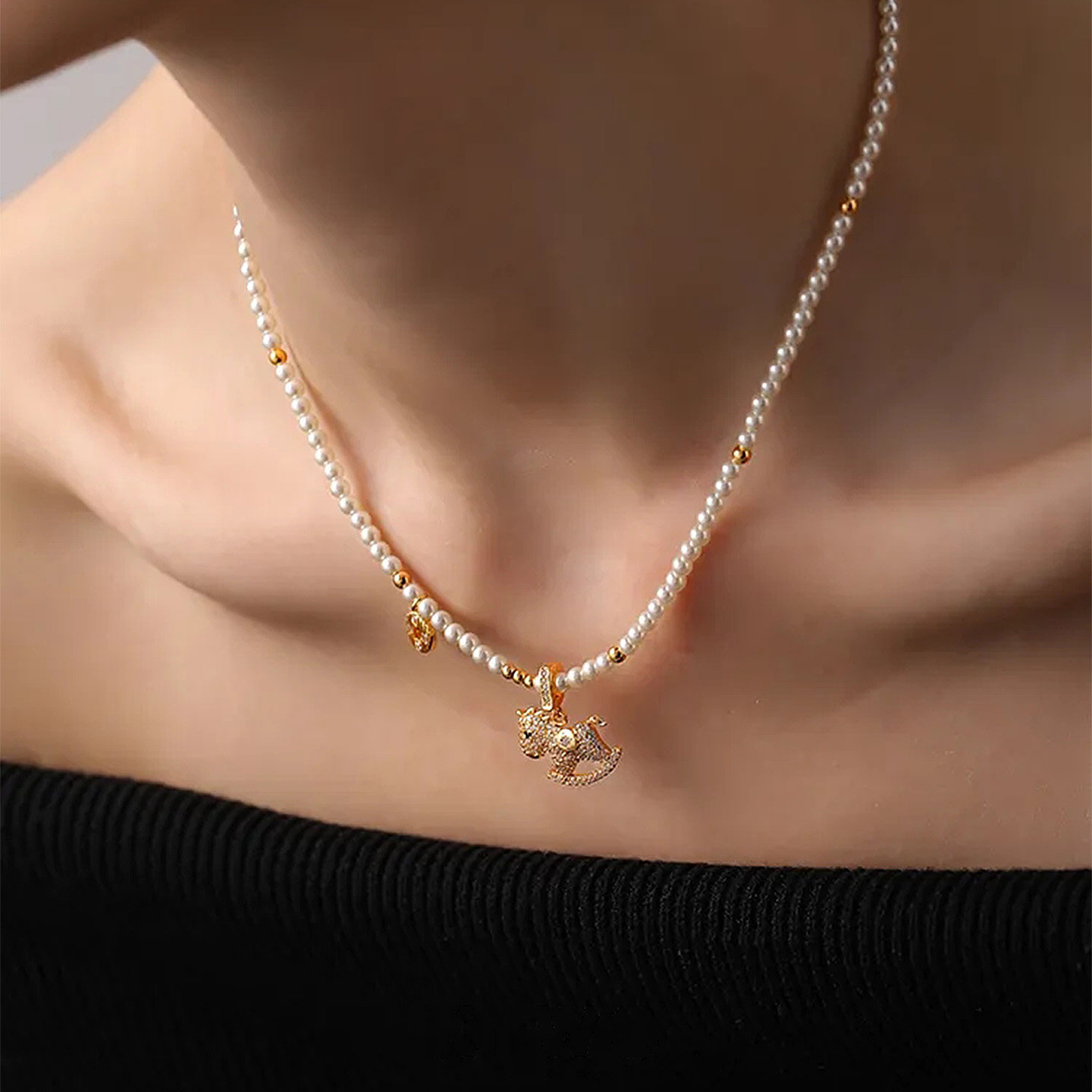 「馬上有錢」普陀山滿鑽小馬珍珠錢幣項鍊馬年本命年招財鎖骨鍊