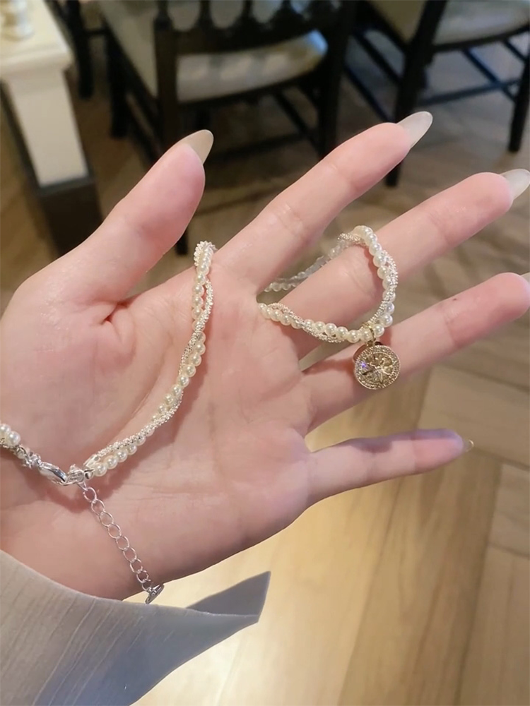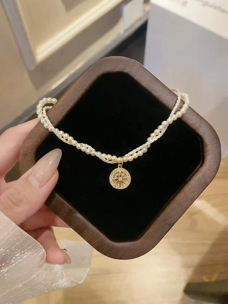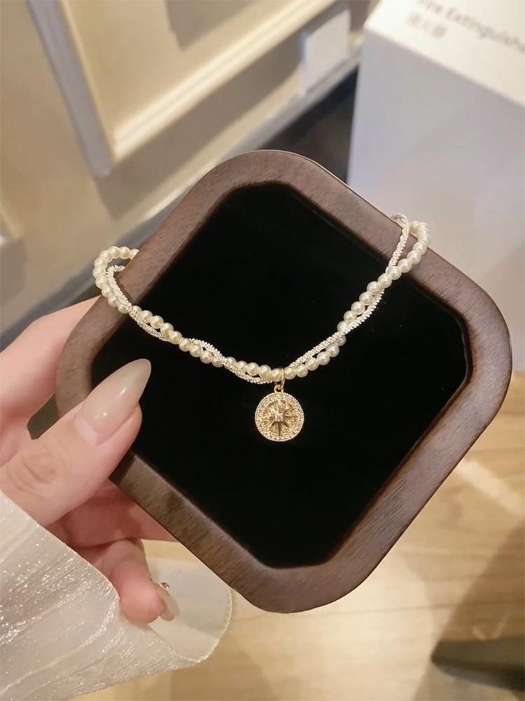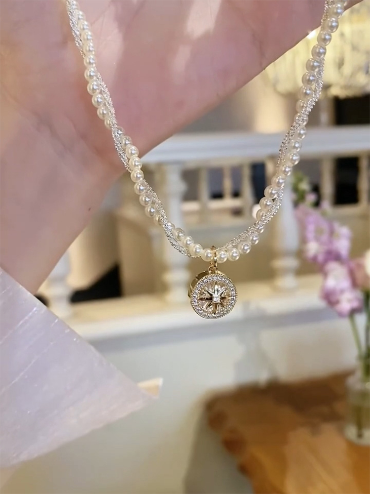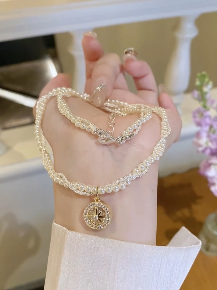 法式雙層施家珍珠滿天星麻花項鍊千金感八芒星羅盤鎖骨鍊頸鏈