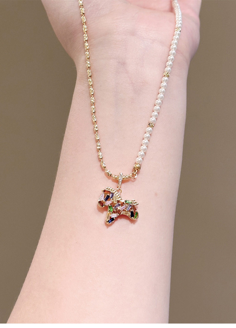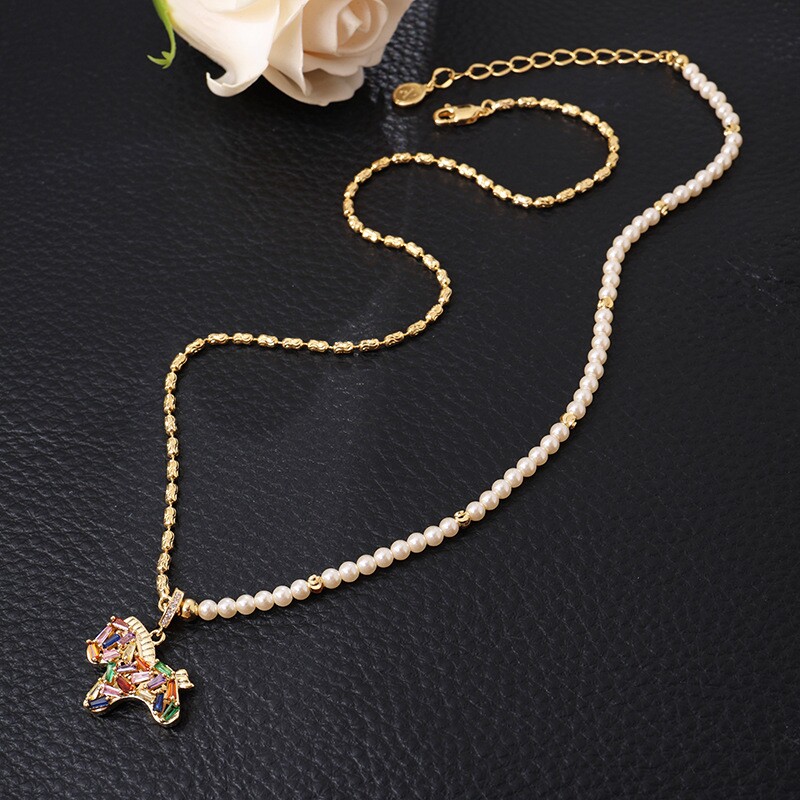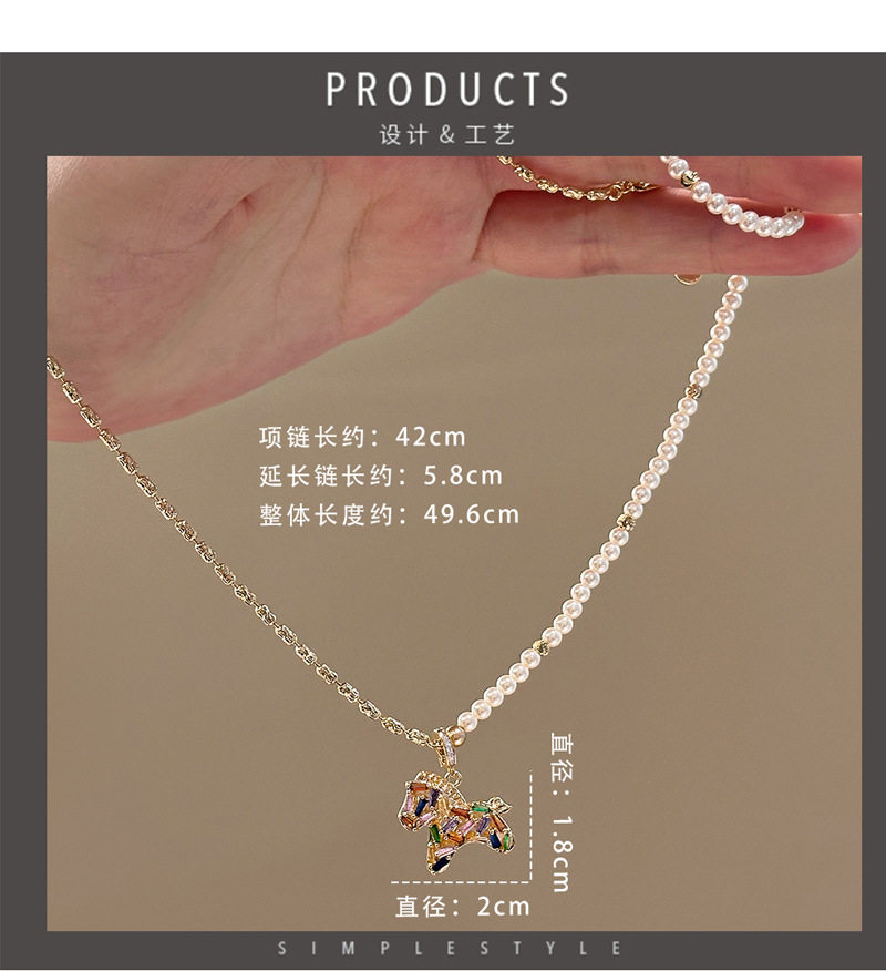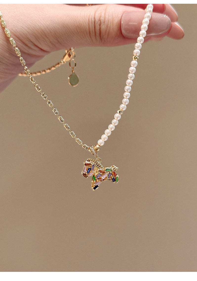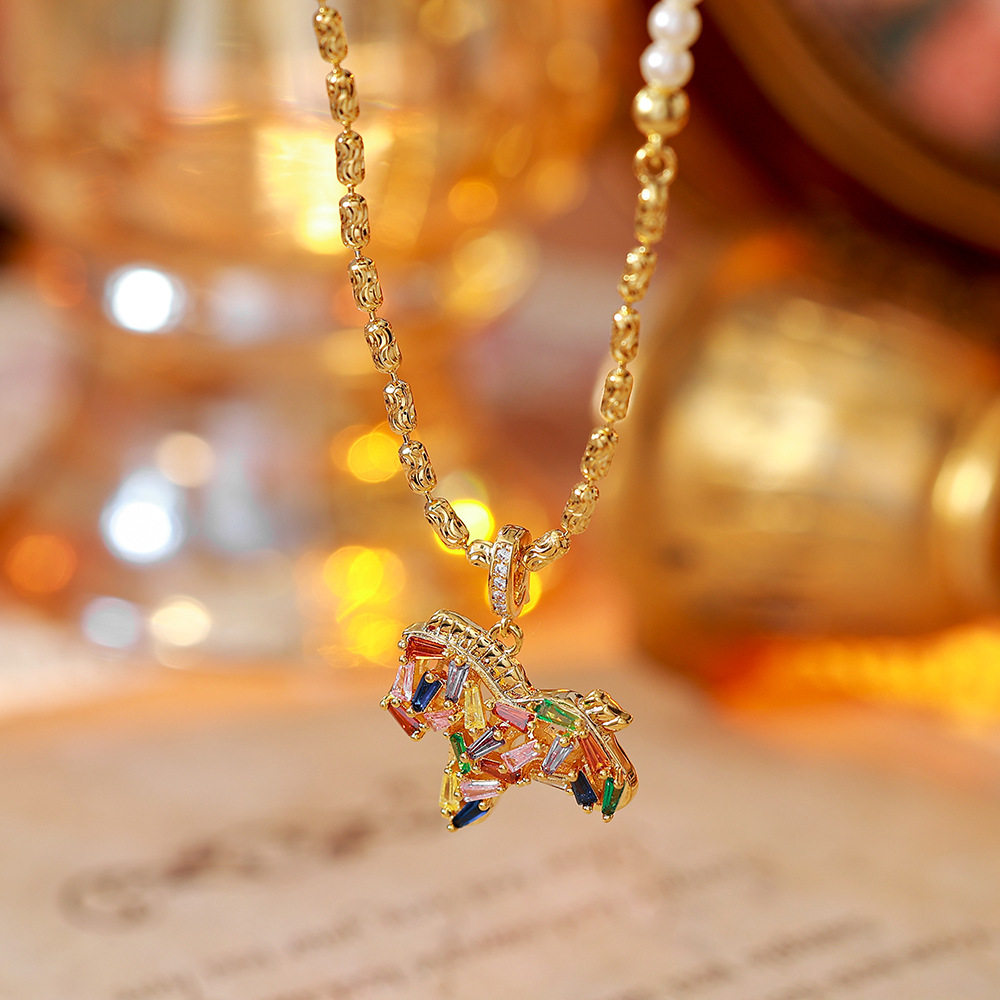彩色水晶鋯小馬吊墜珍珠項鍊配飾女秋冬毛衣鏈輕奢高級感頸鏈飾品