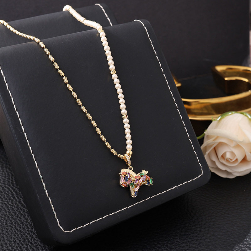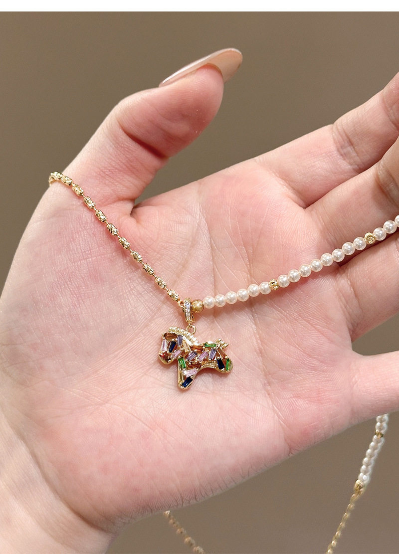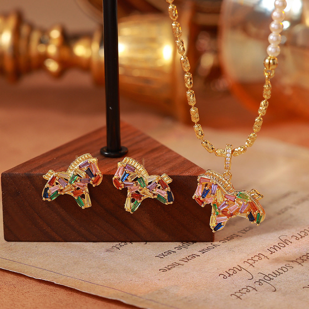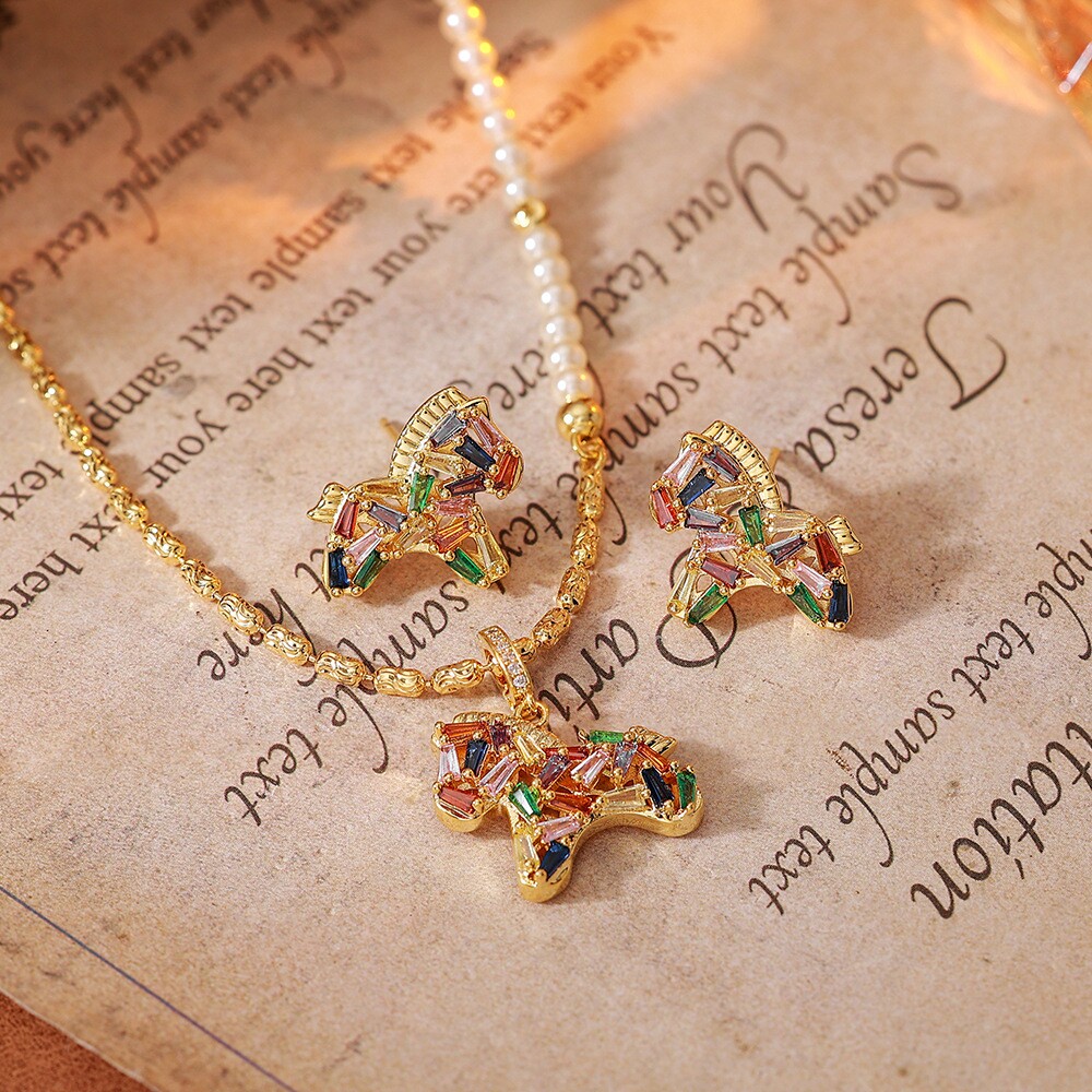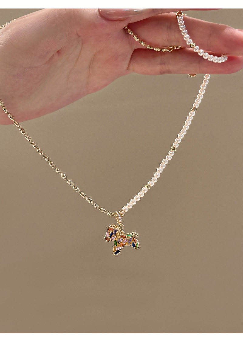 彩色水晶鋯小馬吊墜珍珠項鍊配飾女秋冬毛衣鏈輕奢高級感頸鏈飾品