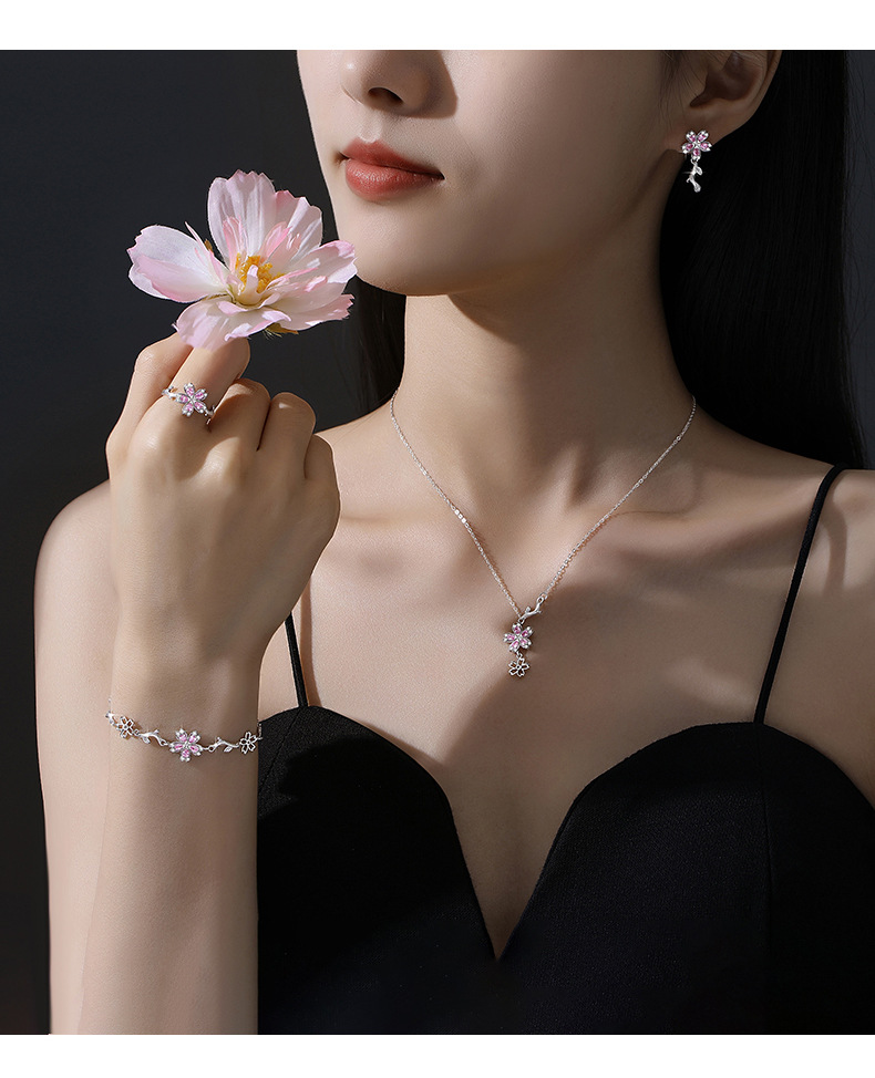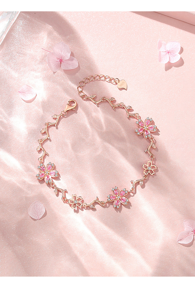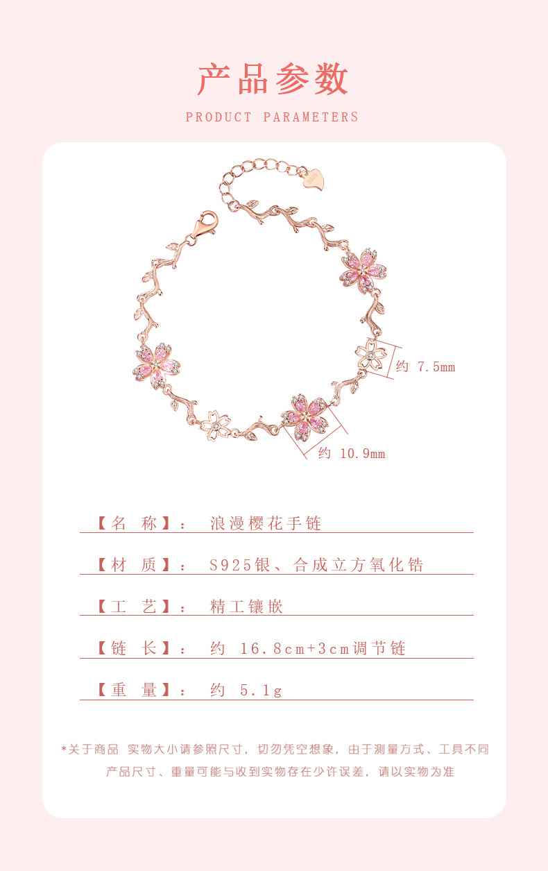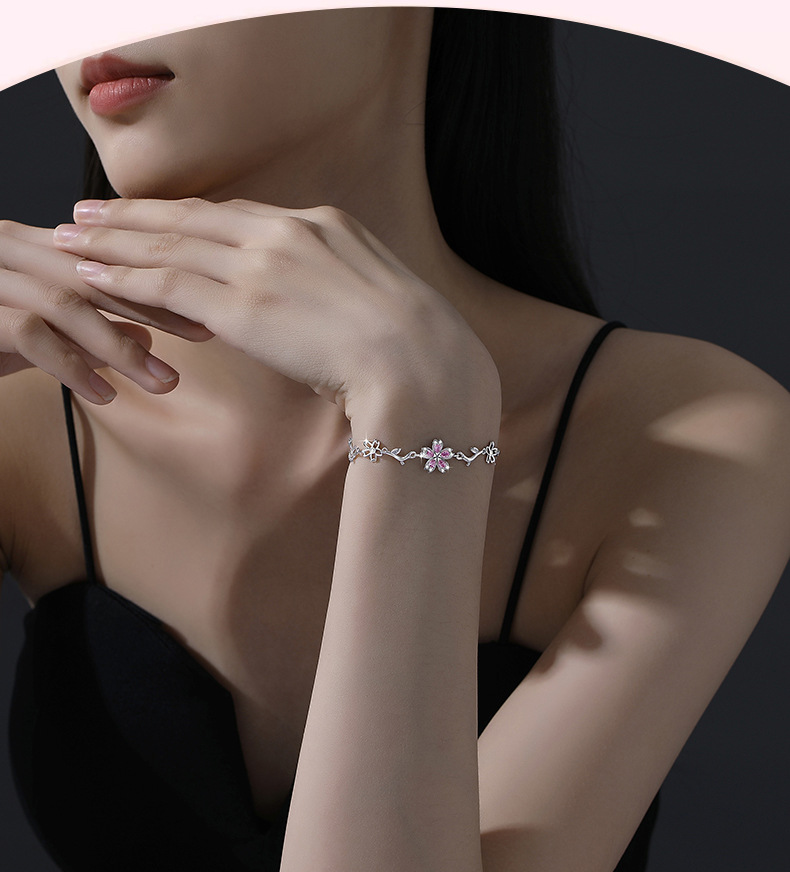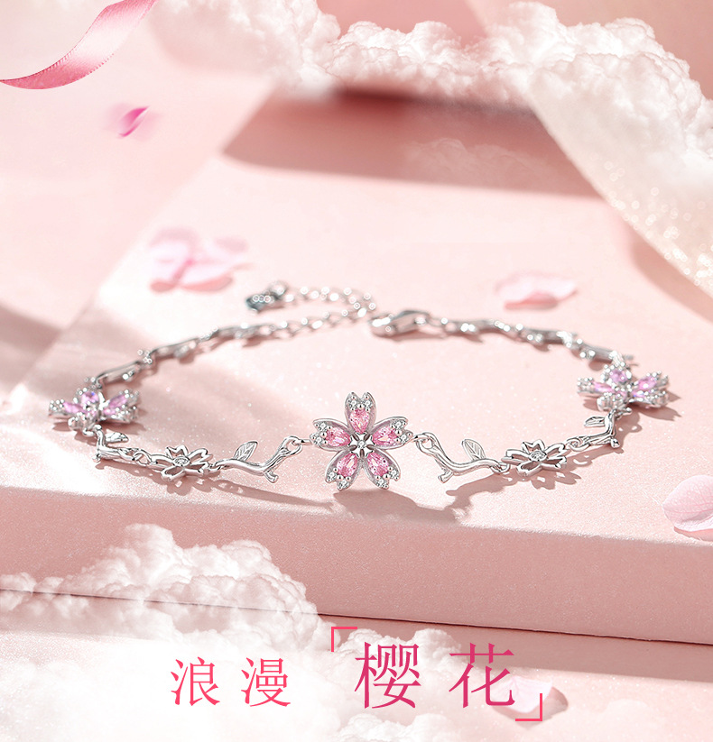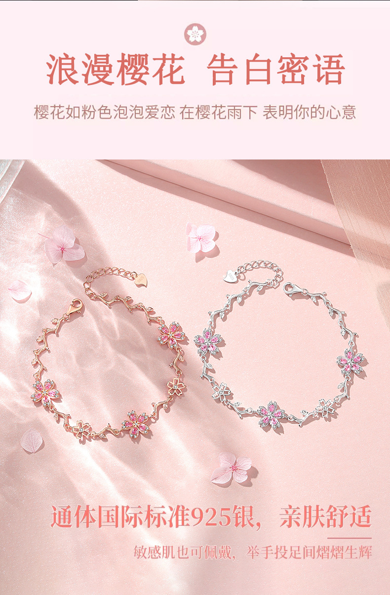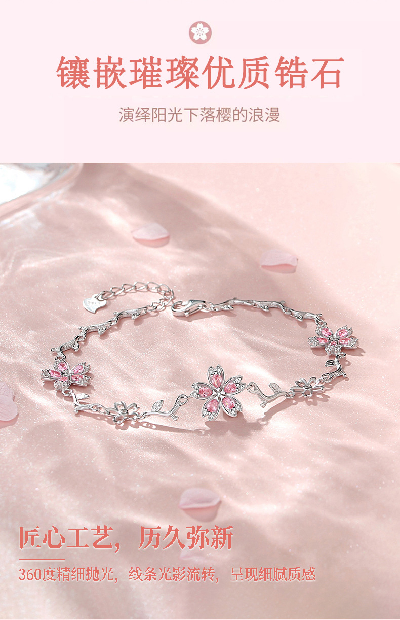 原創S925純銀櫻花手鏈女時尚粉色花朵手飾輕奢小衆設計得物風禮物