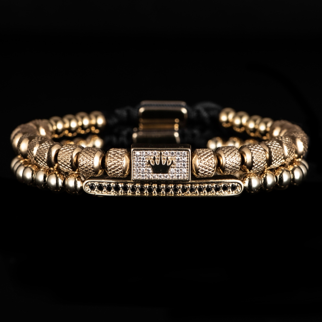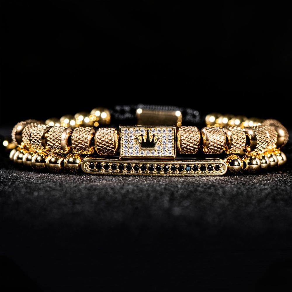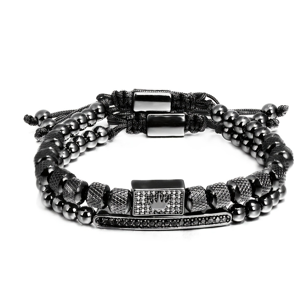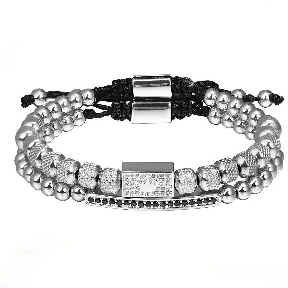 2件套歐美微鑲鋯石方塊皇冠不鏽鋼串珠菠蘿珠男士手鏈套裝