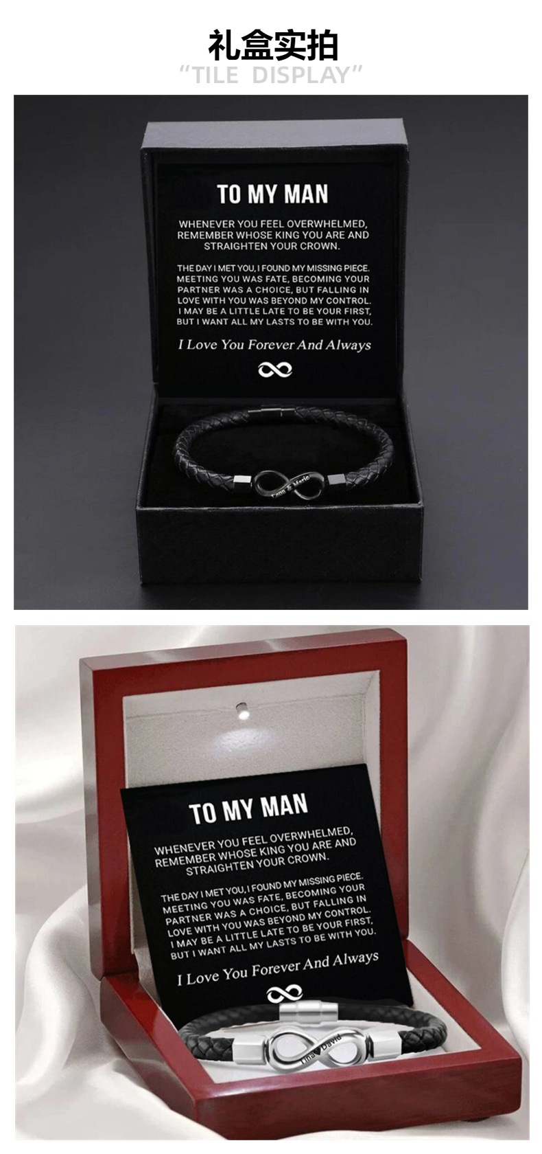 刻字8字不鏽鋼皮手鐲To my Man 男士手鐲磁吸釦圓繩繙蓋禮盒套裝