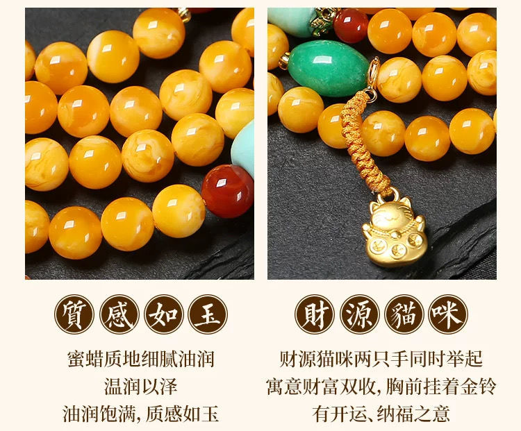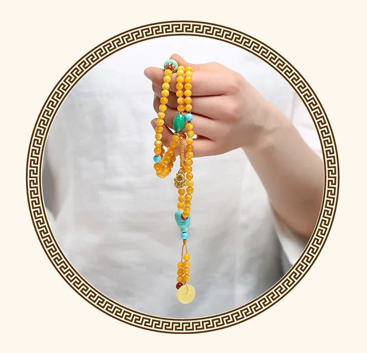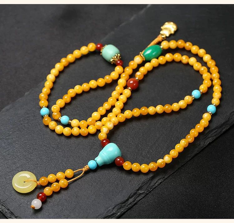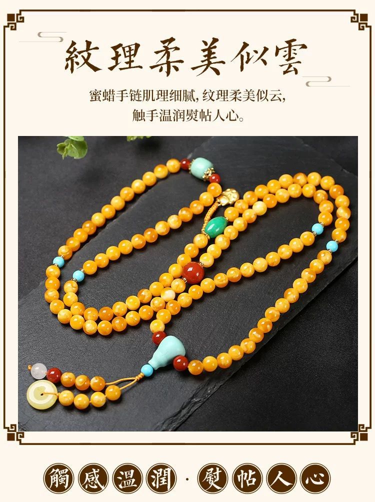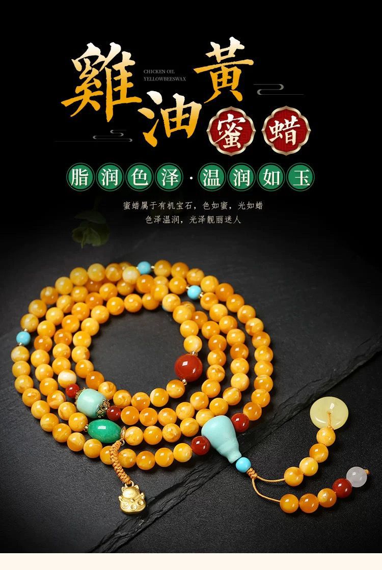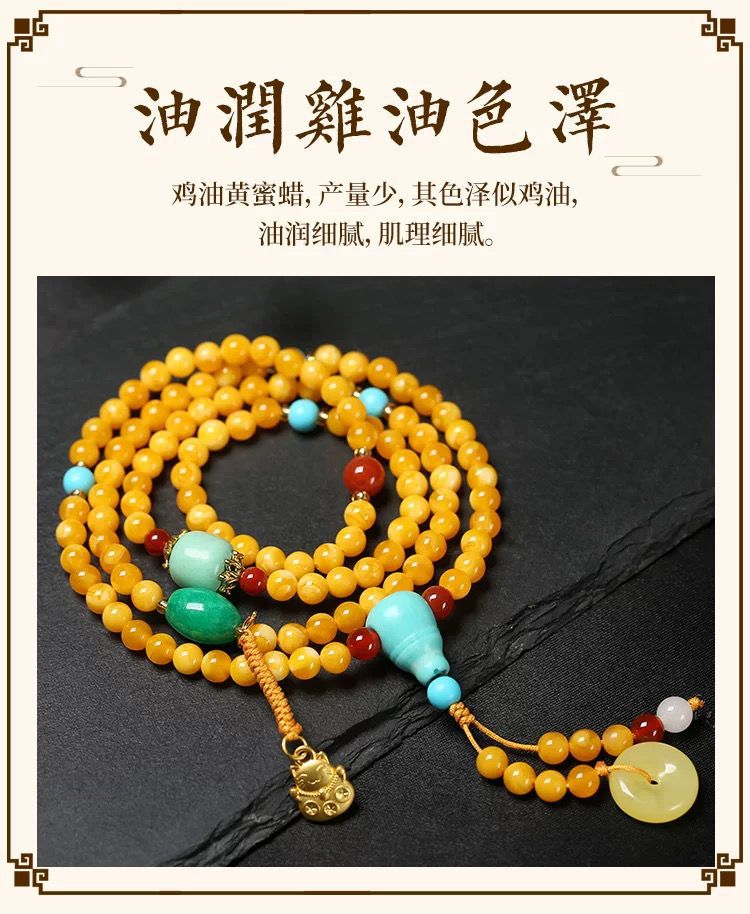 原創優化琥珀色蜜蠟雞油黃108顆手鏈 多圈項鍊原礦老蜜蠟手串彿珠