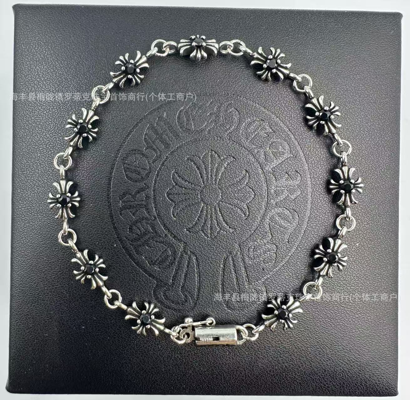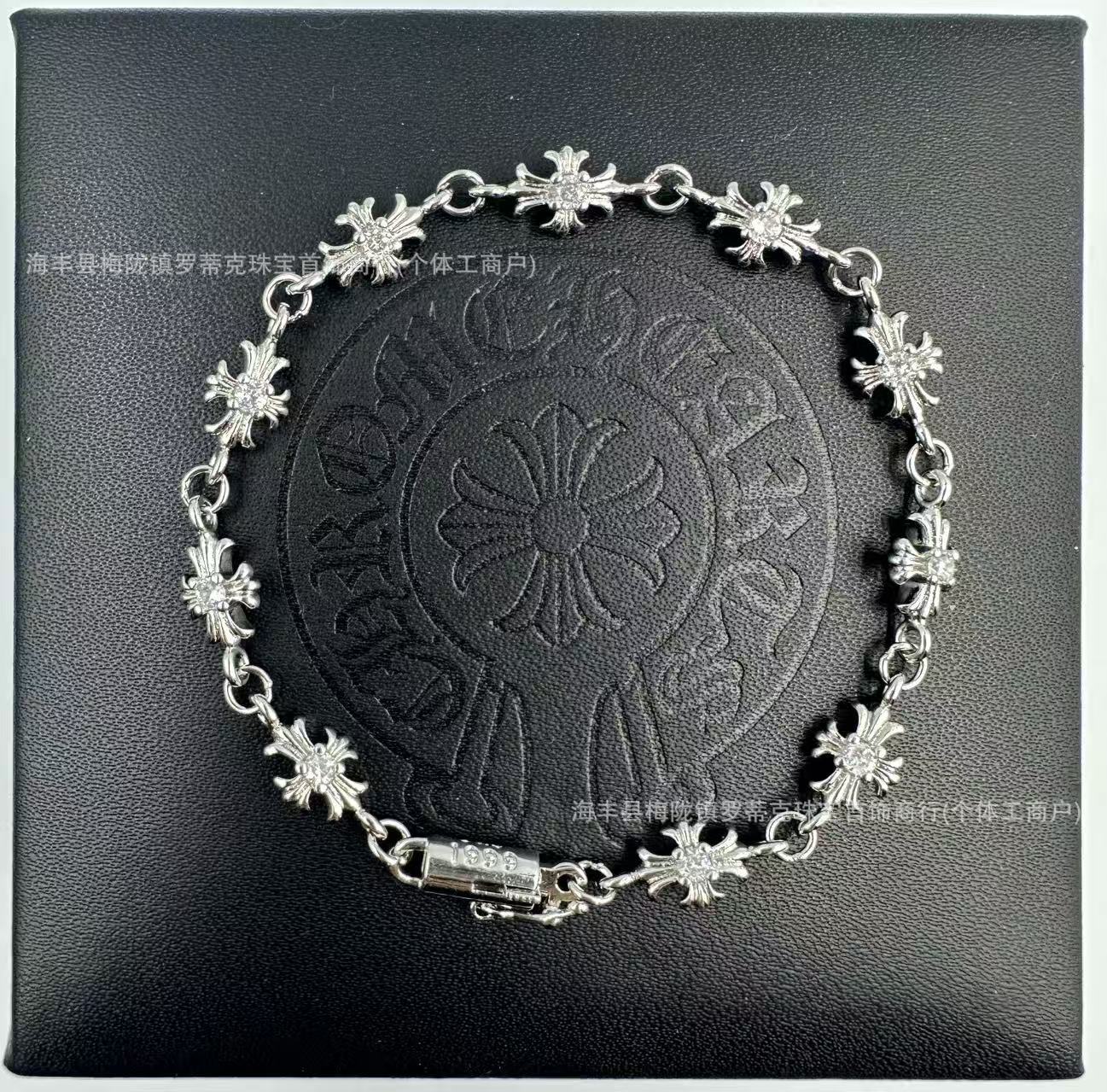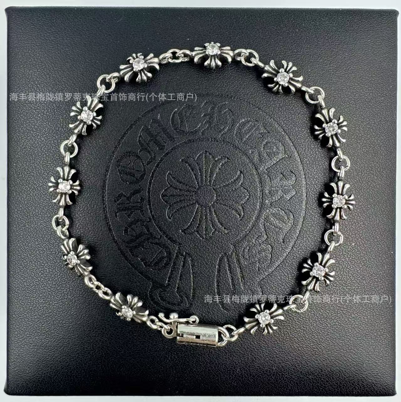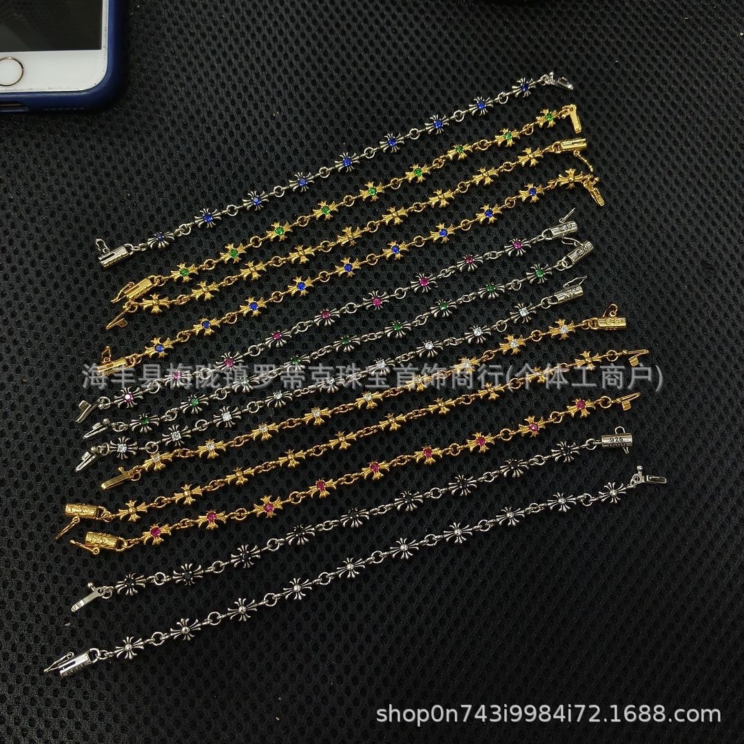 ch潮牌復古做舊克羅伈十字架花手鏈鑲鑽s925銀白鑽男女細手鏈飾品
