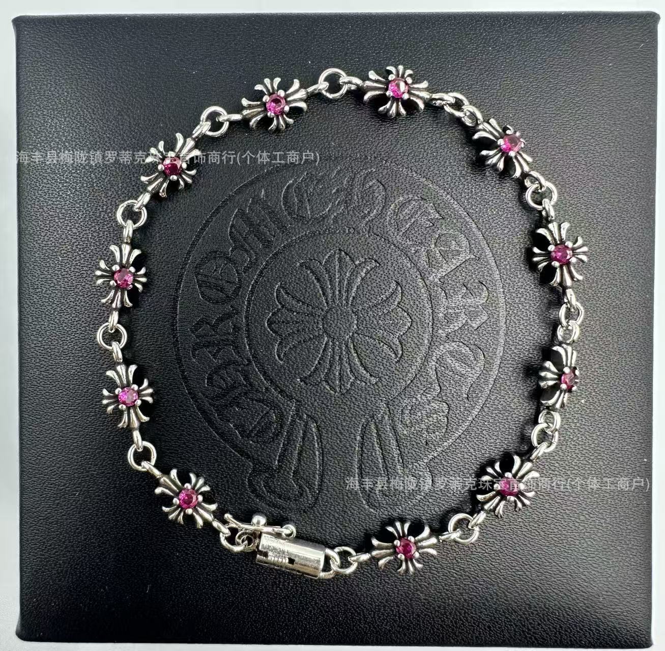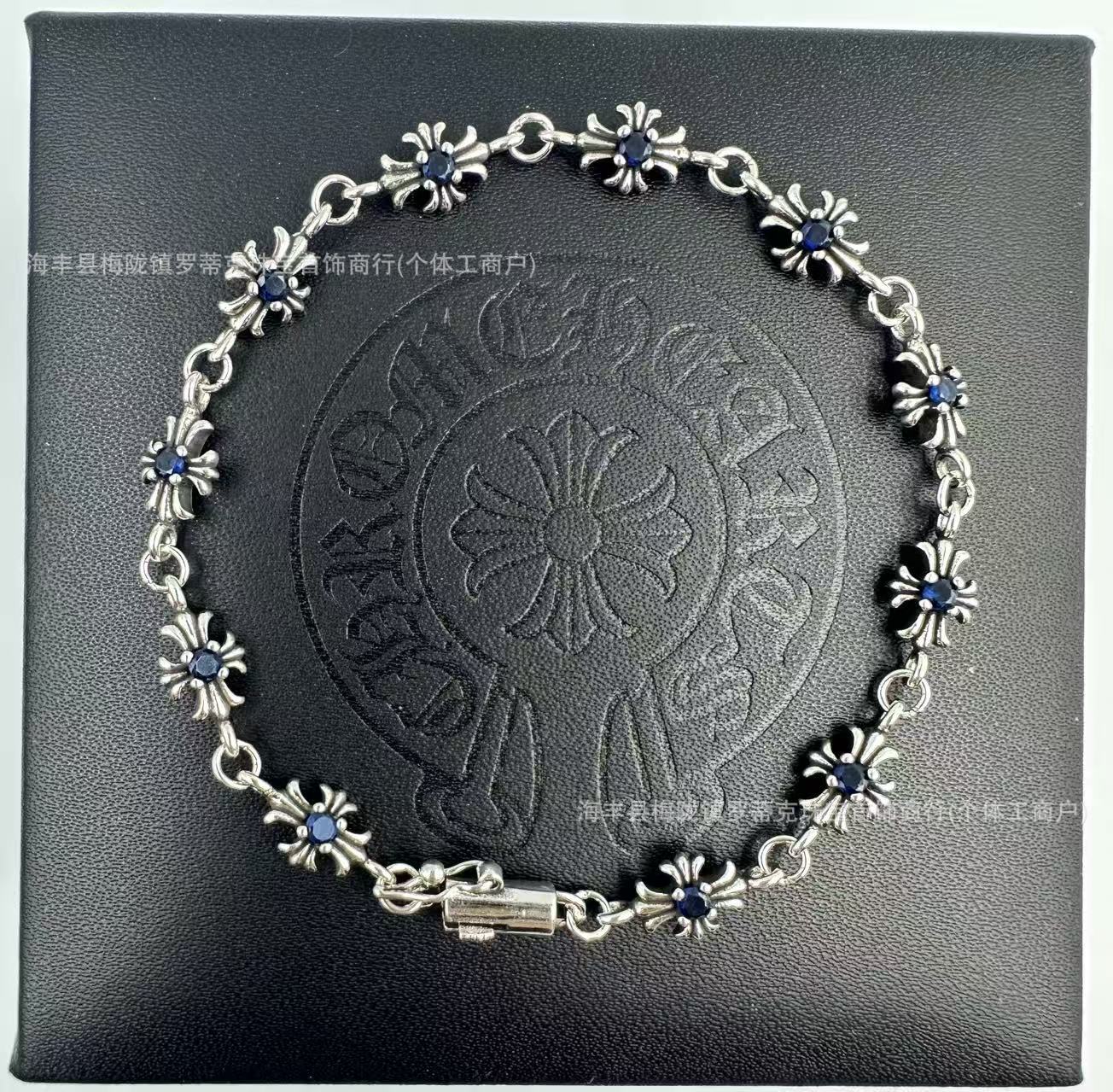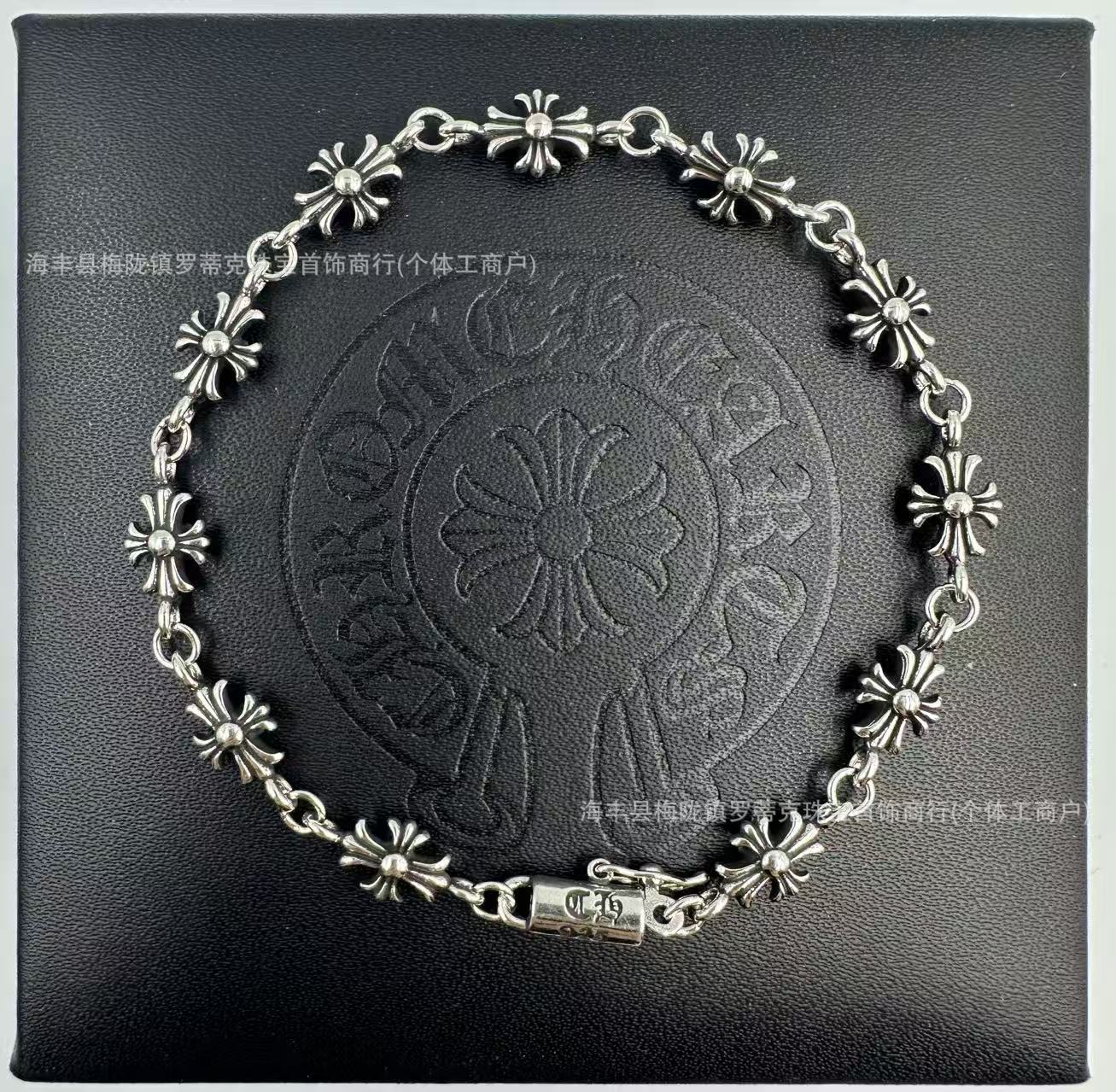 ch潮牌復古做舊克羅伈十字架花手鏈鑲鑽s925銀白鑽男女細手鏈飾品