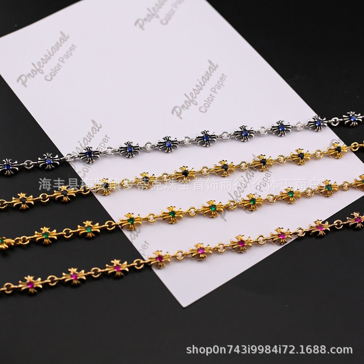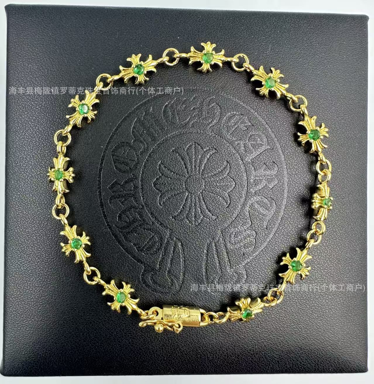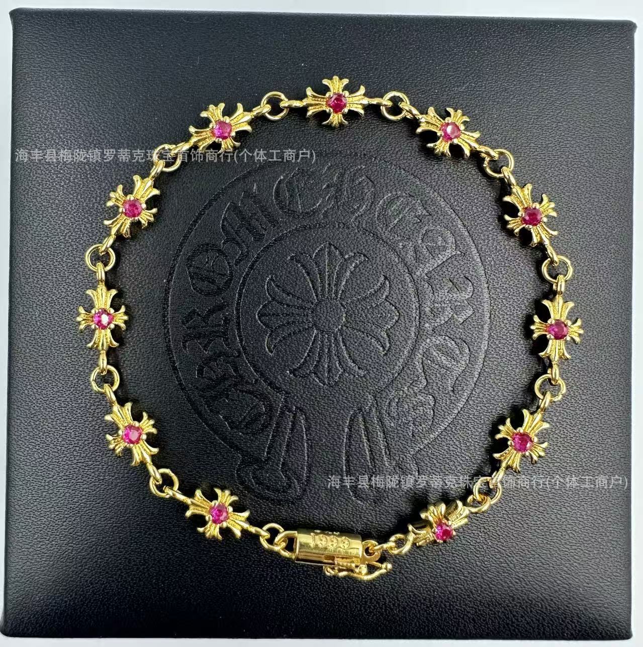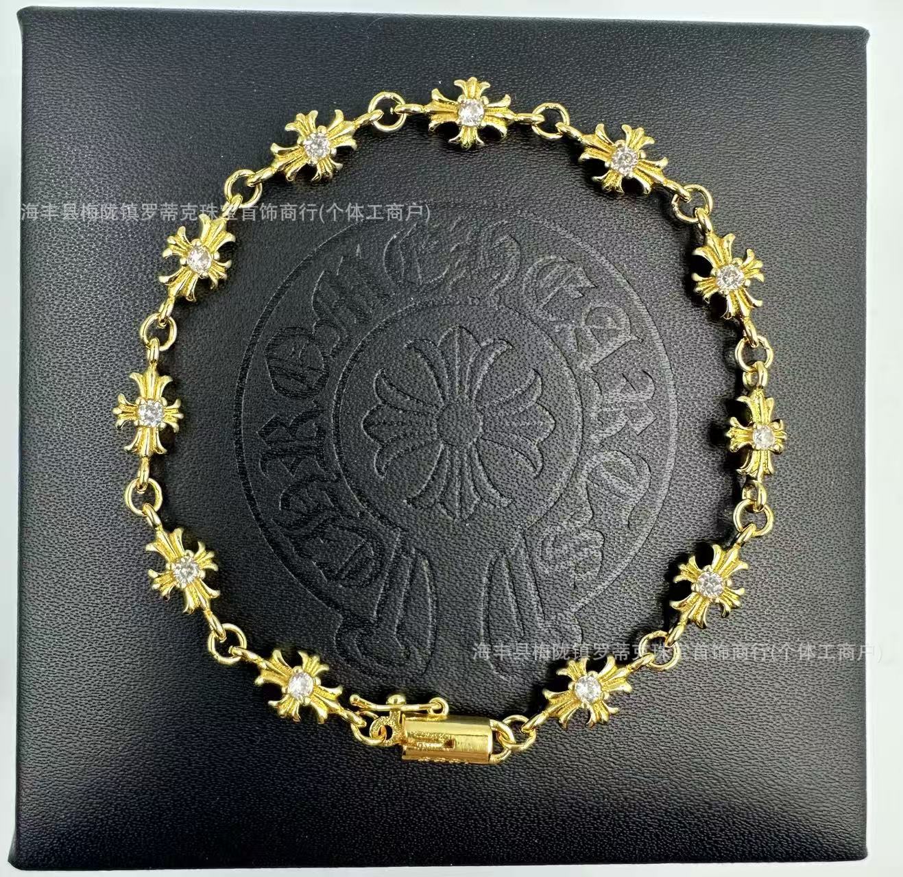 ch潮牌復古做舊克羅伈十字架花手鏈鑲鑽s925銀白鑽男女細手鏈飾品