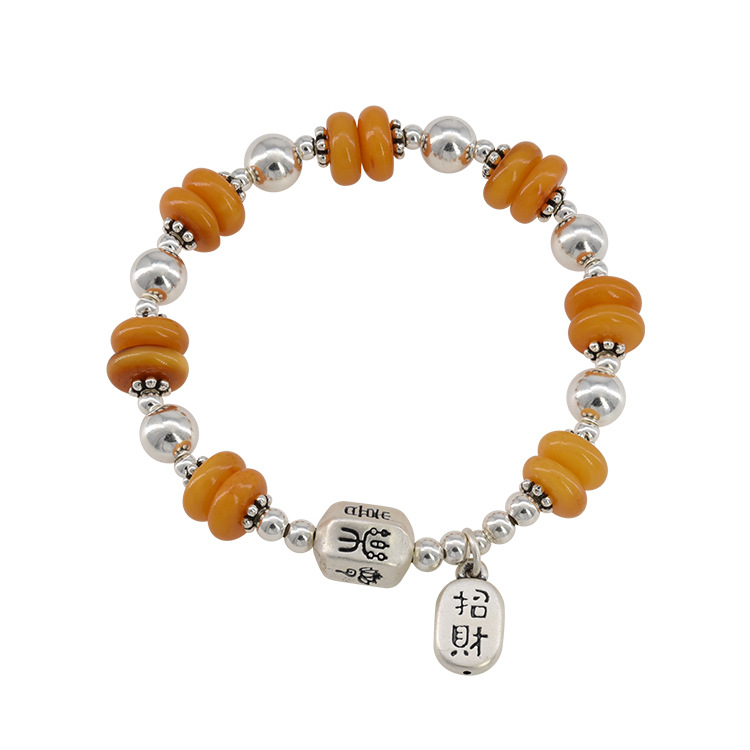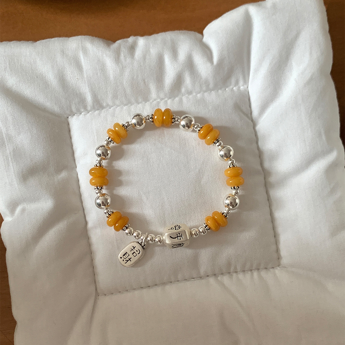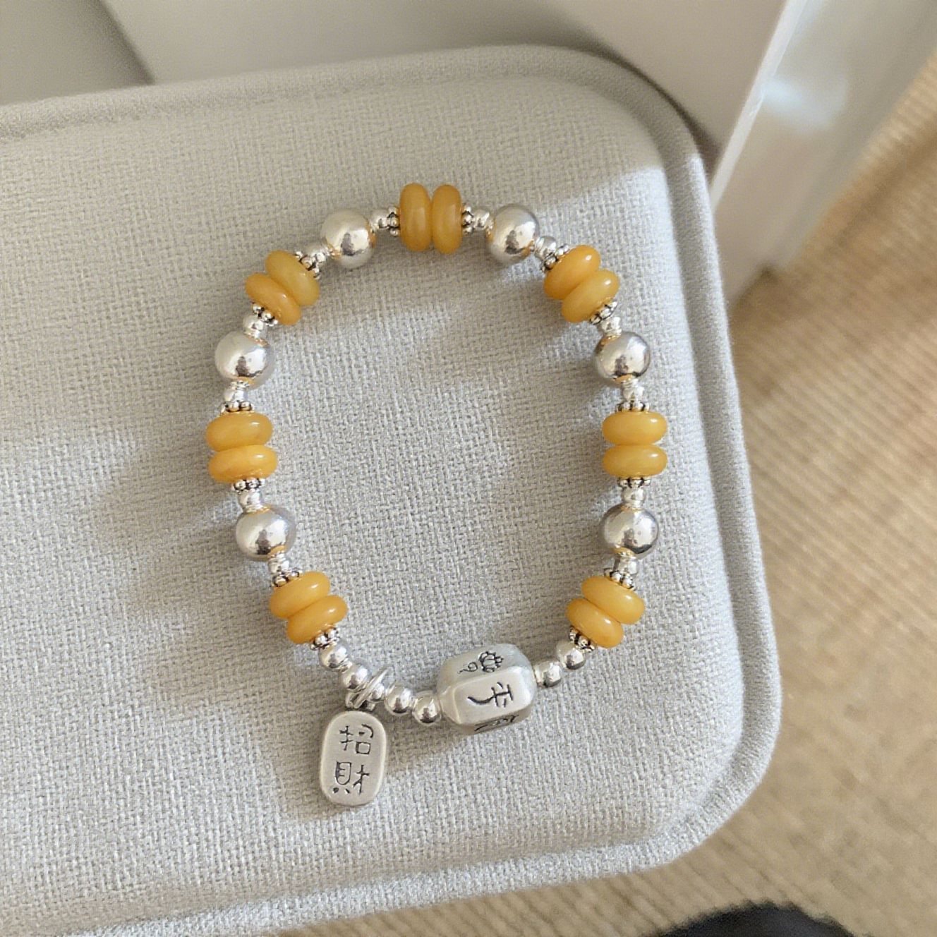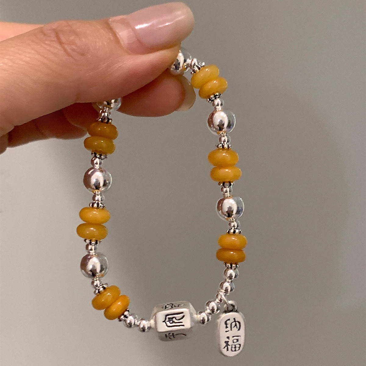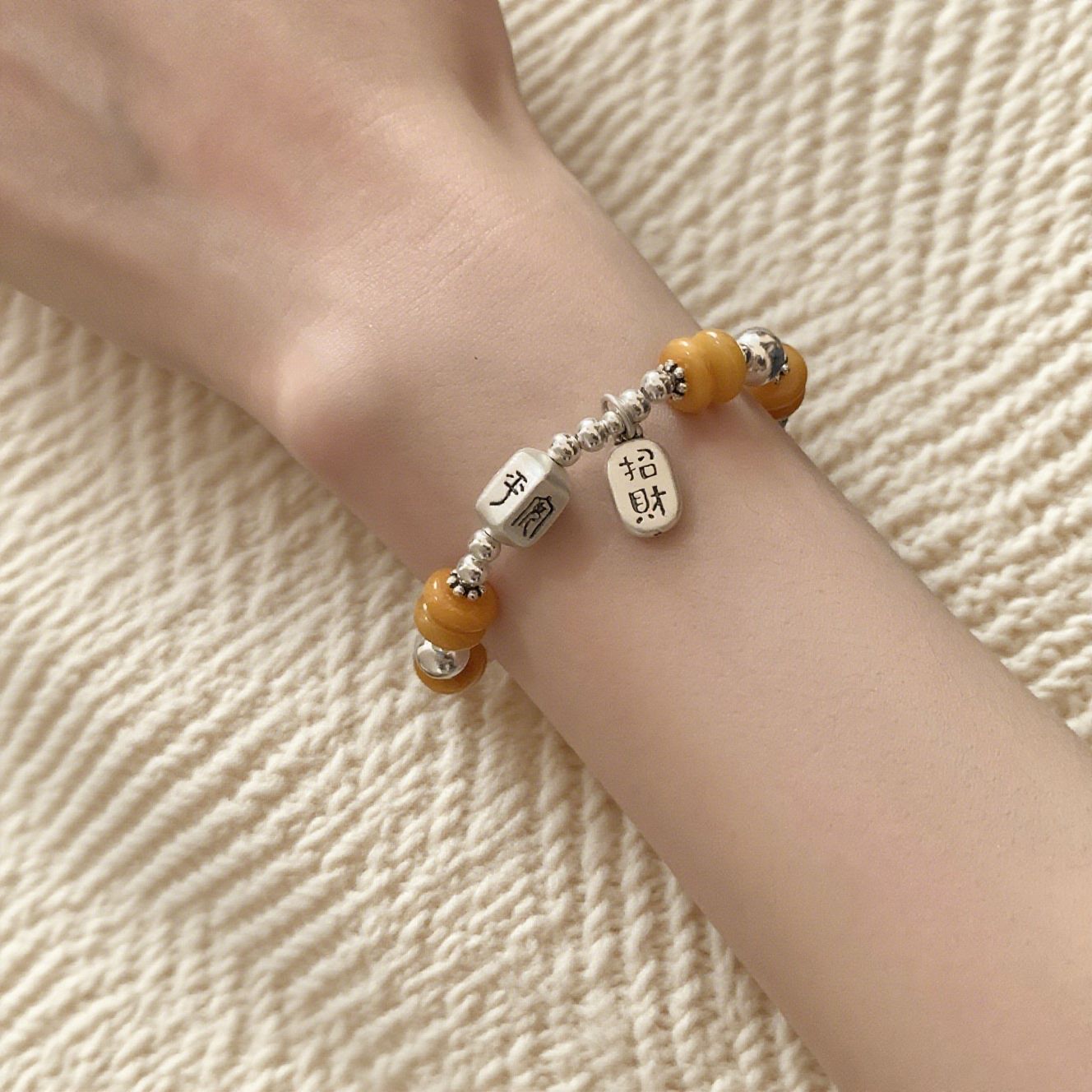 新中式蜜蠟招財手鏈女簡約國風設計復古簡約竹節知了銀珠手串