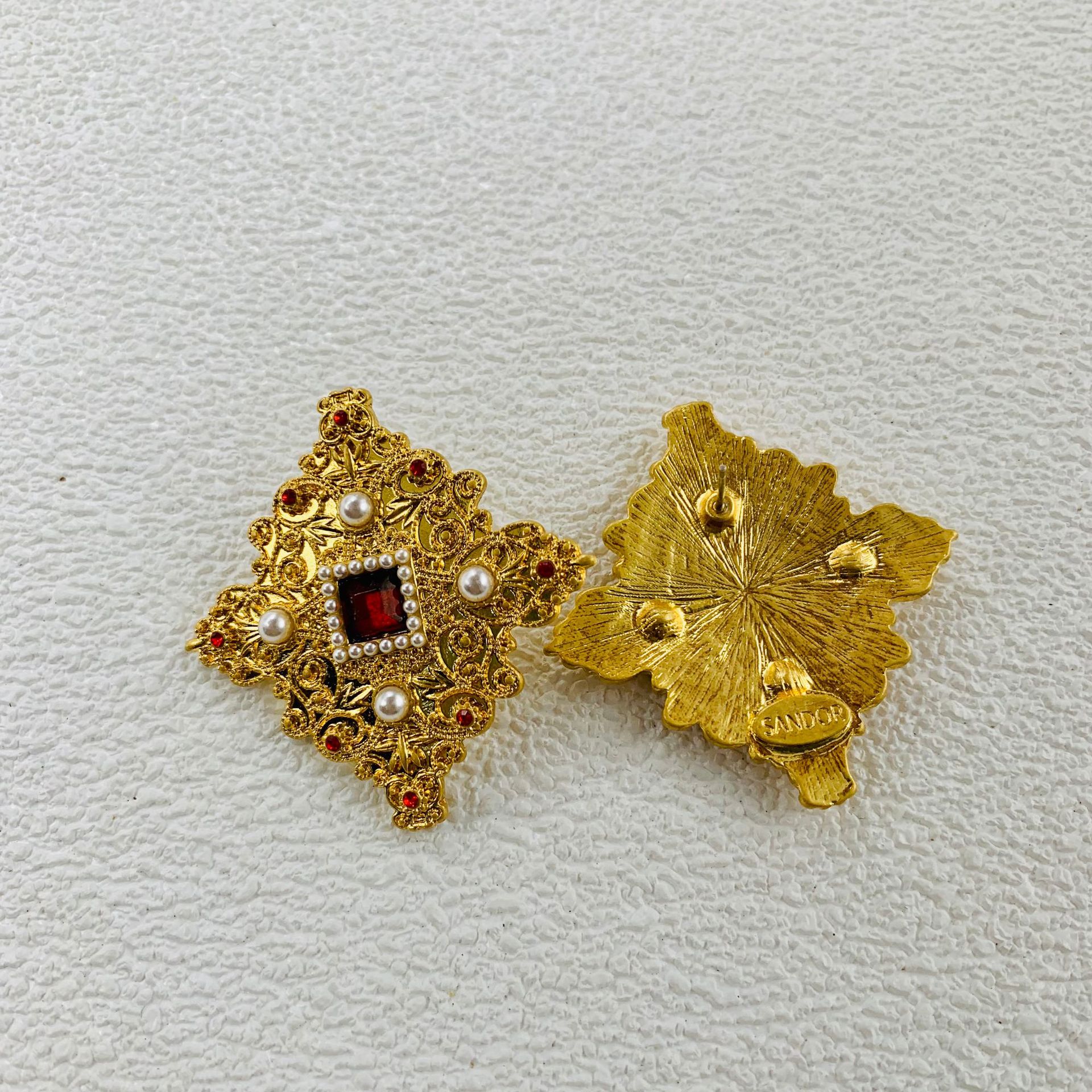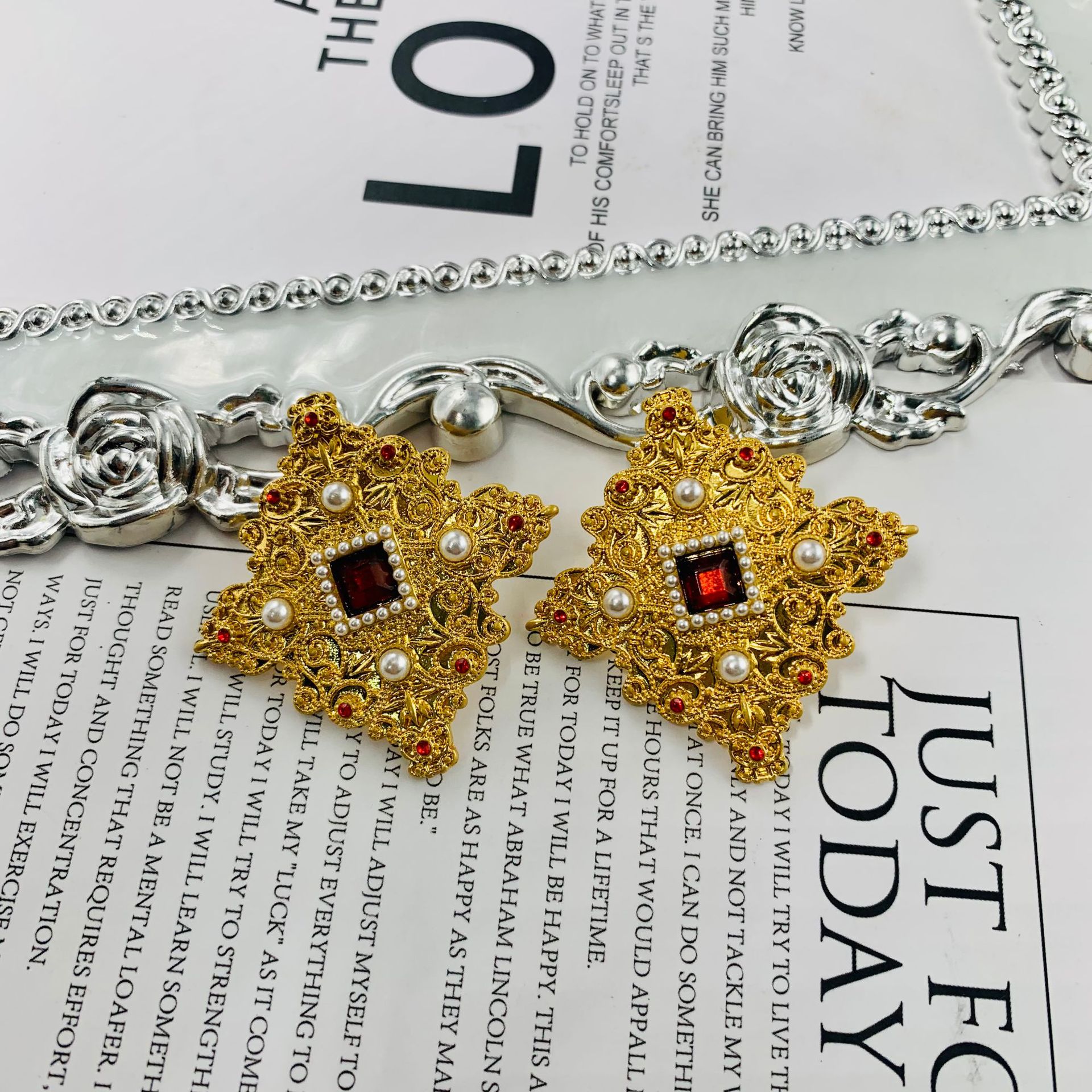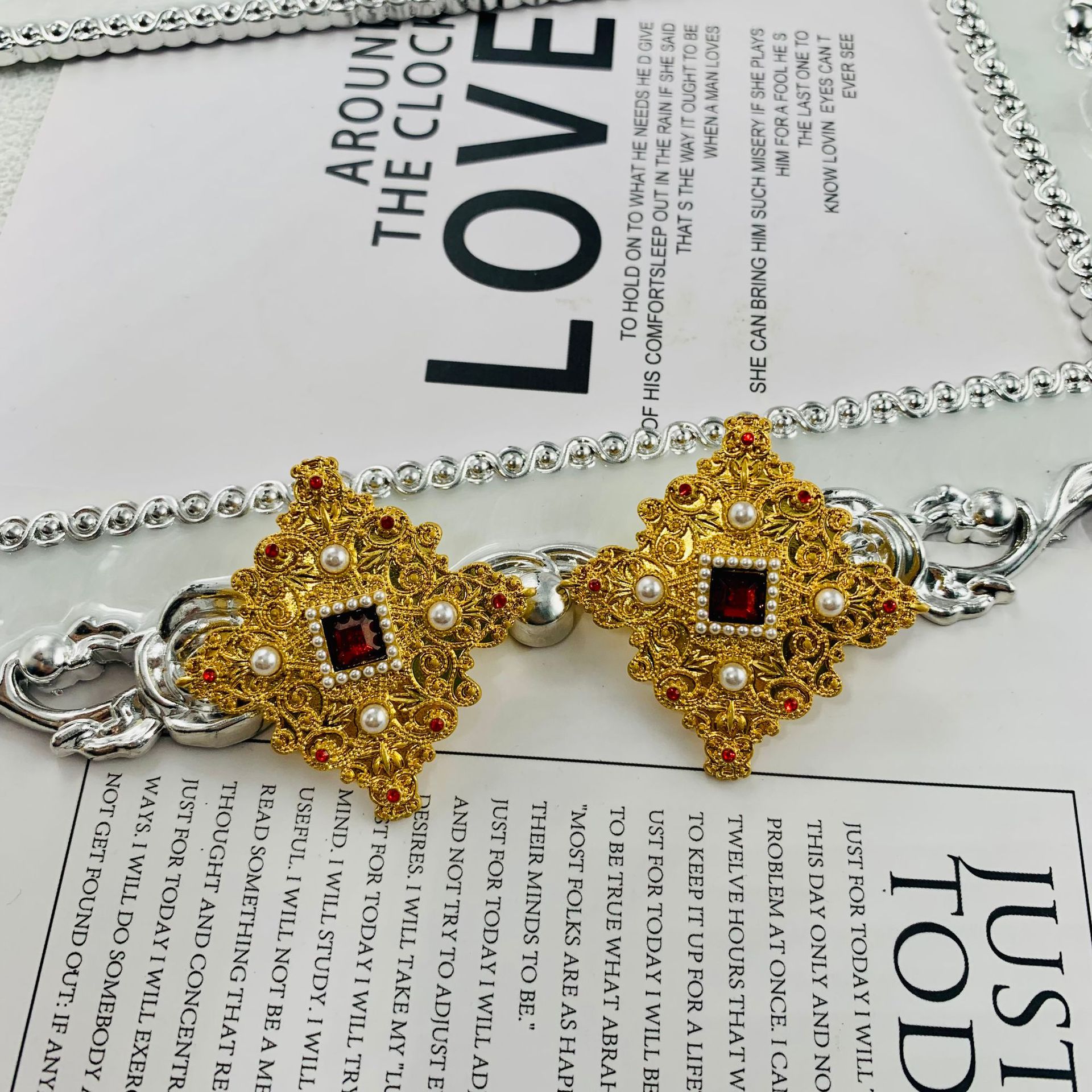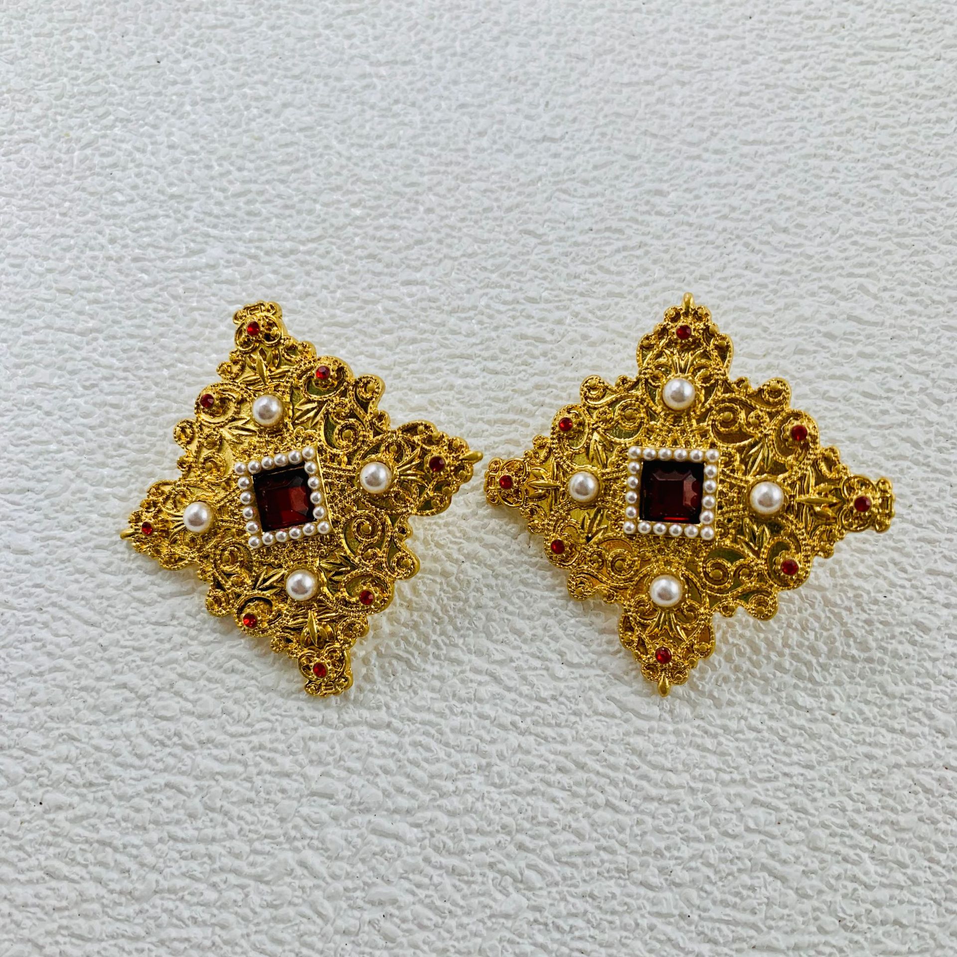 中古vintage 西洋復古方形宮廷風滿鑲925銀針電鍍真金打標耳釘