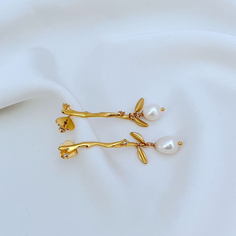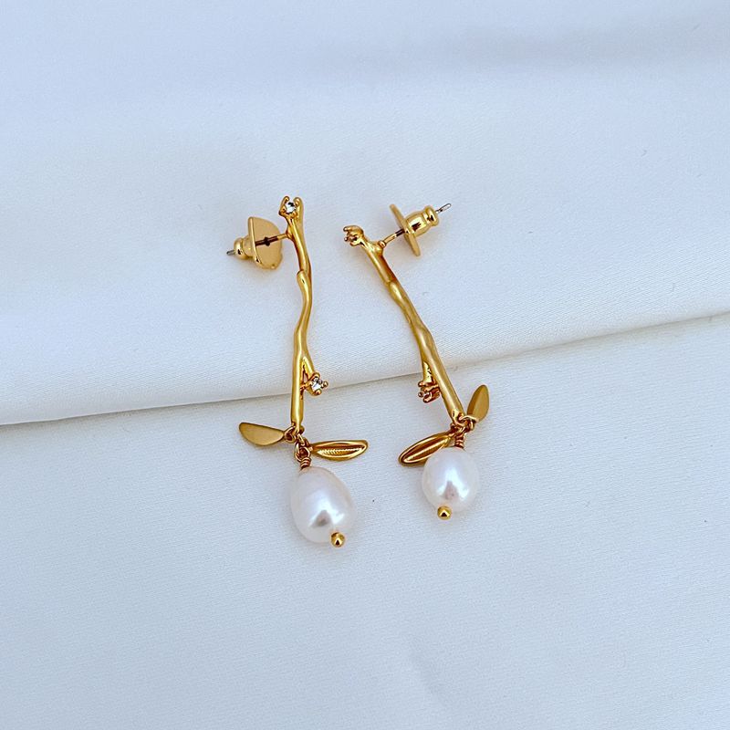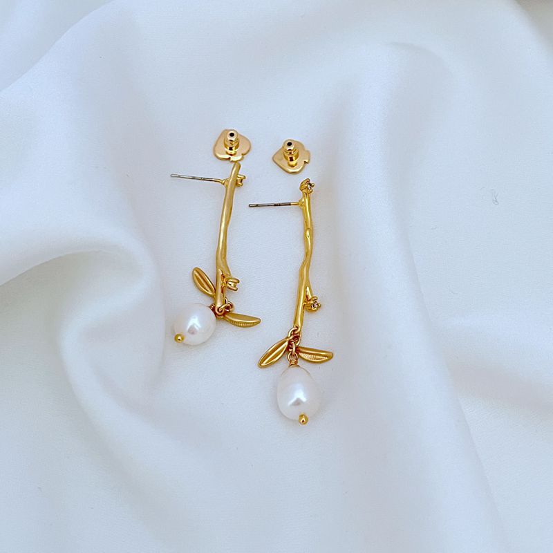 簡約鍍18K金啞光樹枝耳墜天然淡水珍珠耳釘KS925銀針歐美飾品