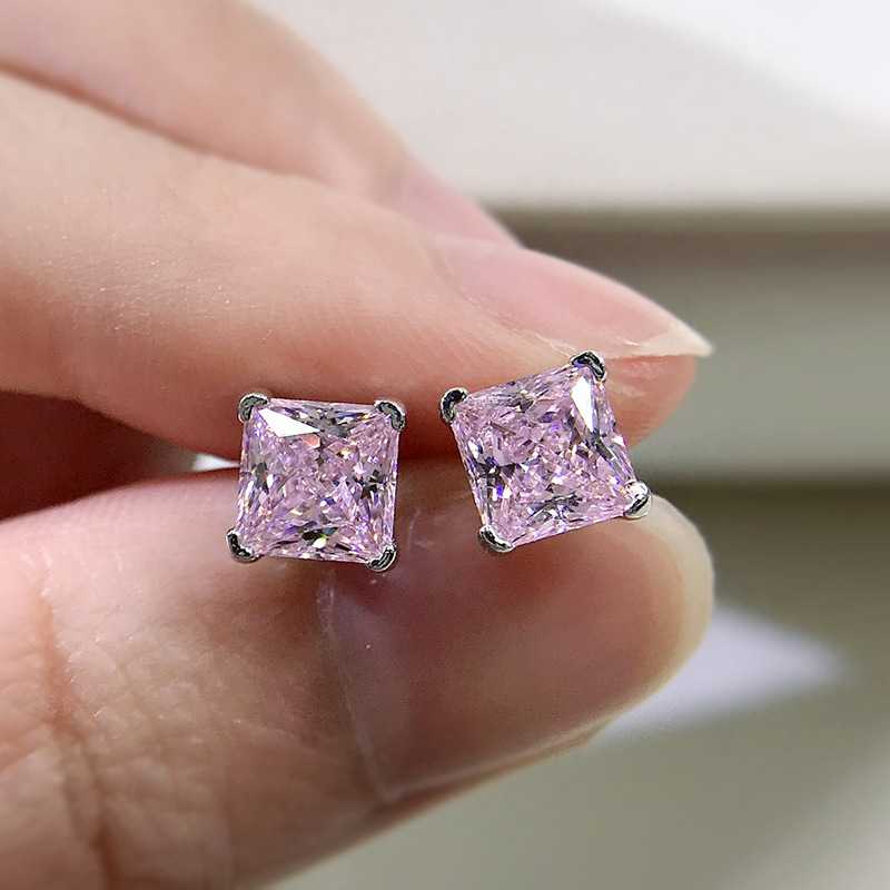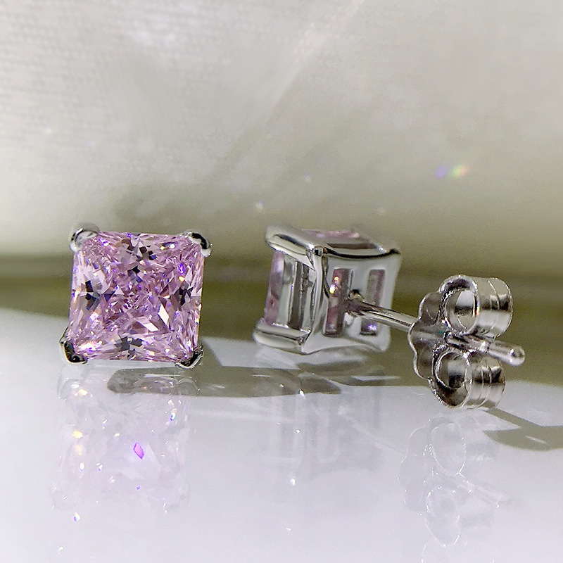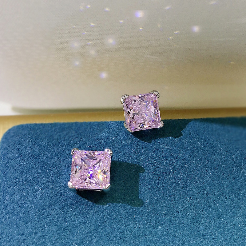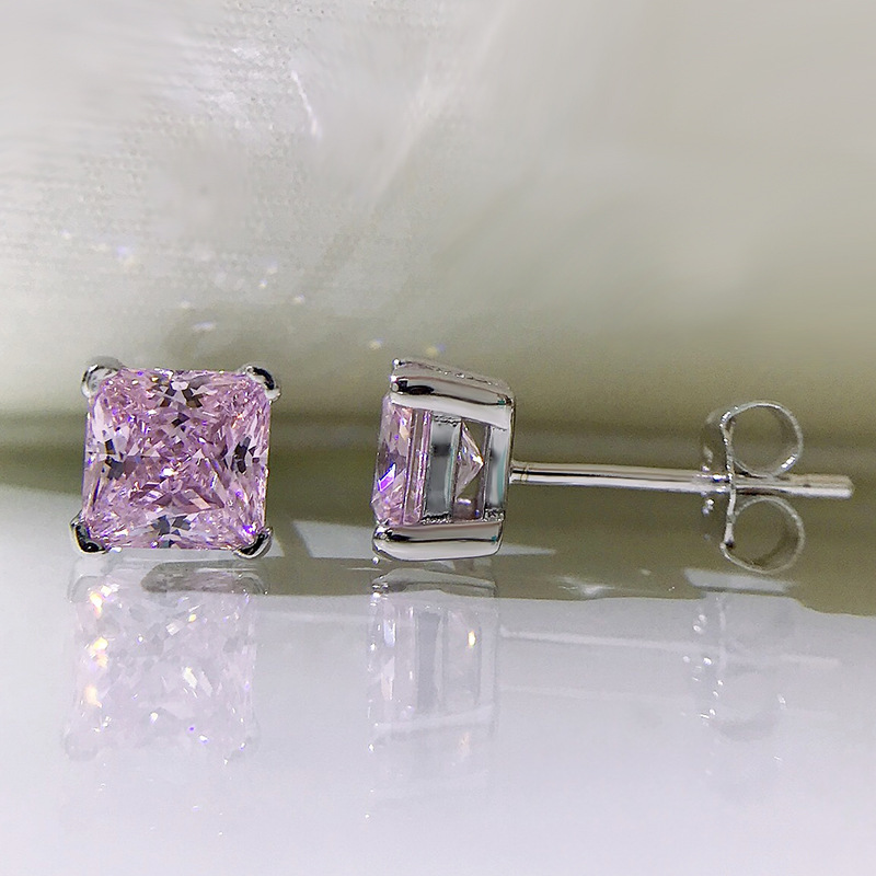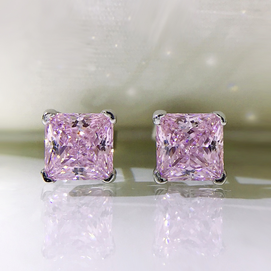 卓之凡新款高碳鑽925銀耳釘豔粉鑽簡約ins公主方6*6m冰花切耳飾女