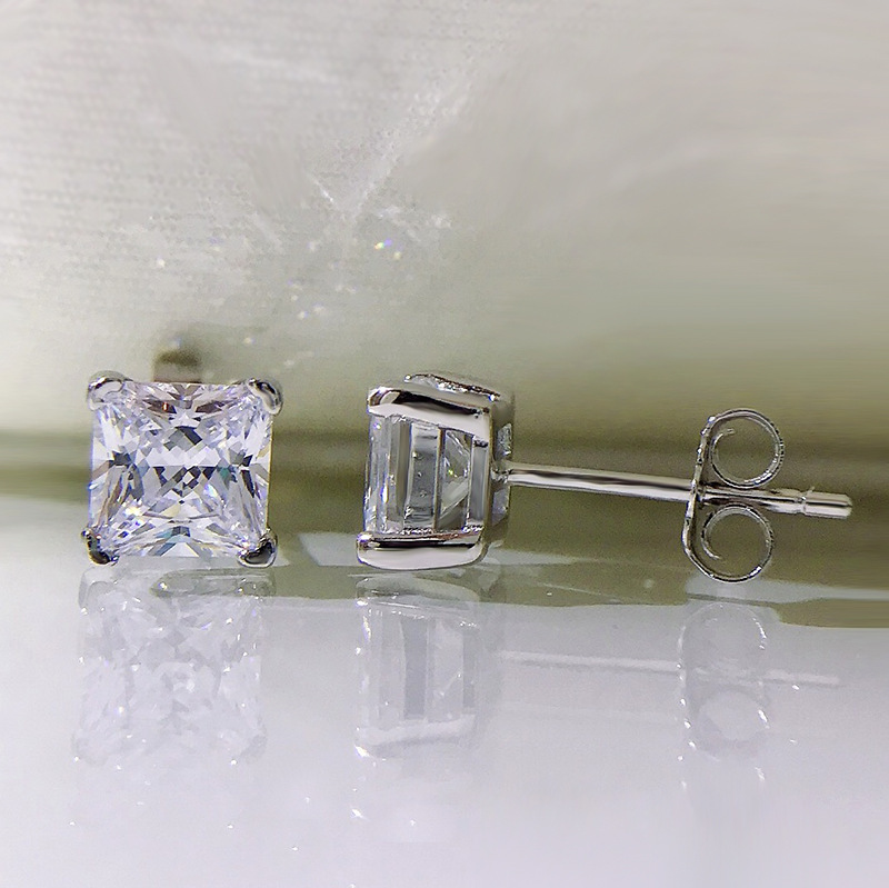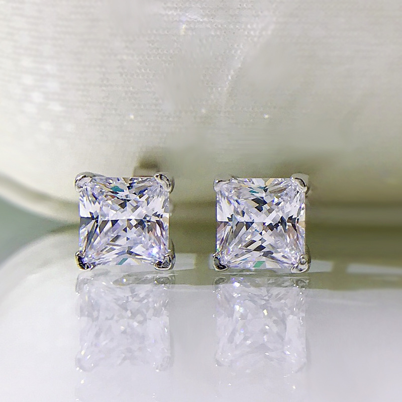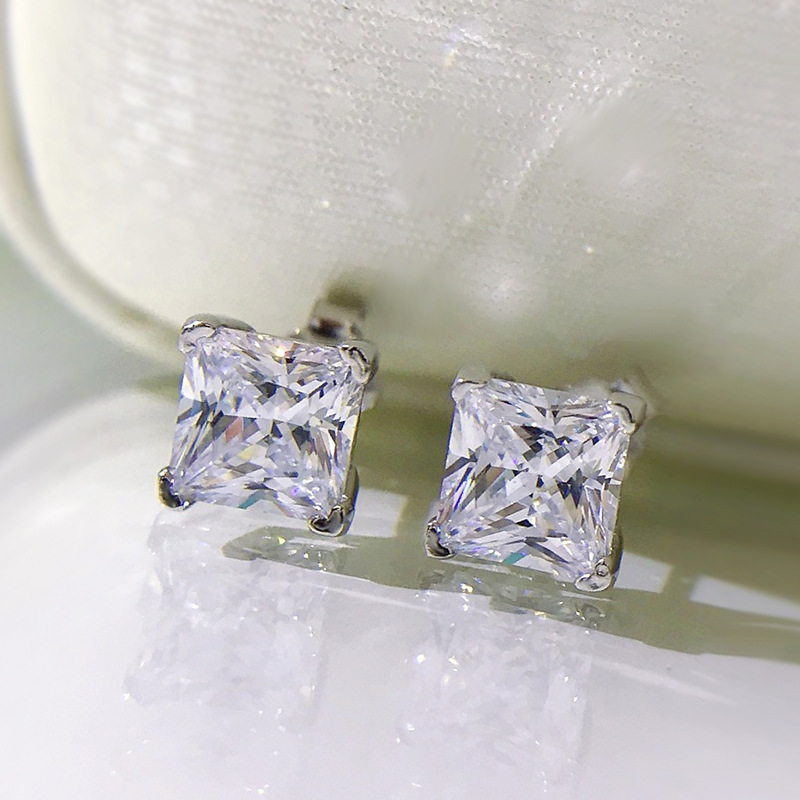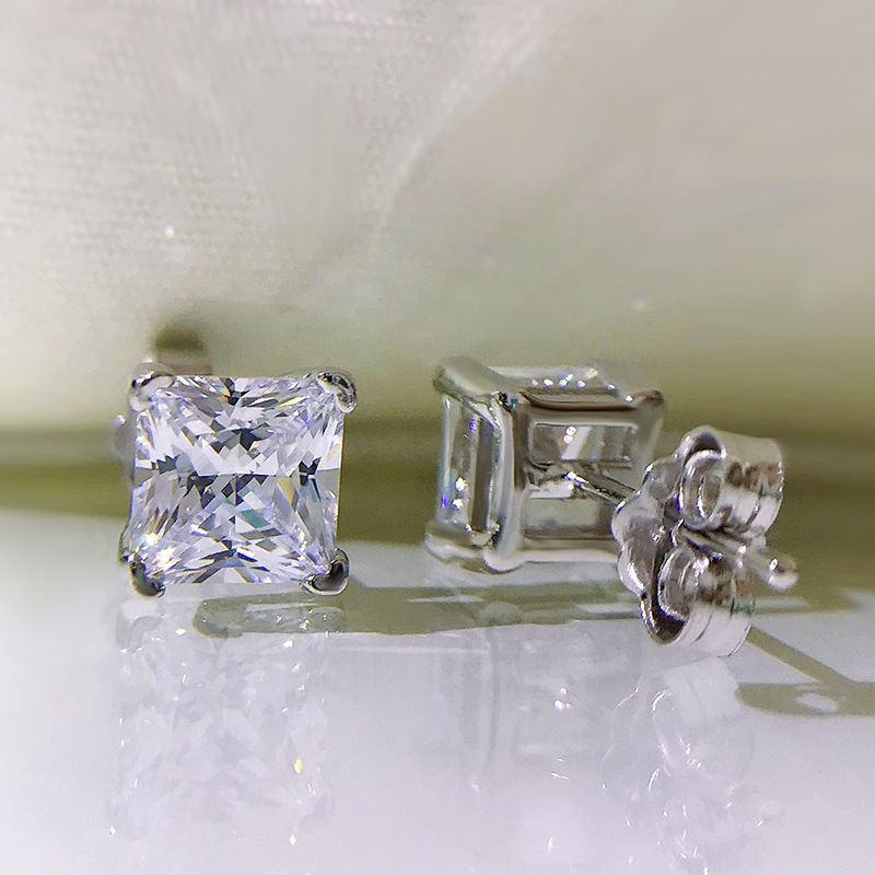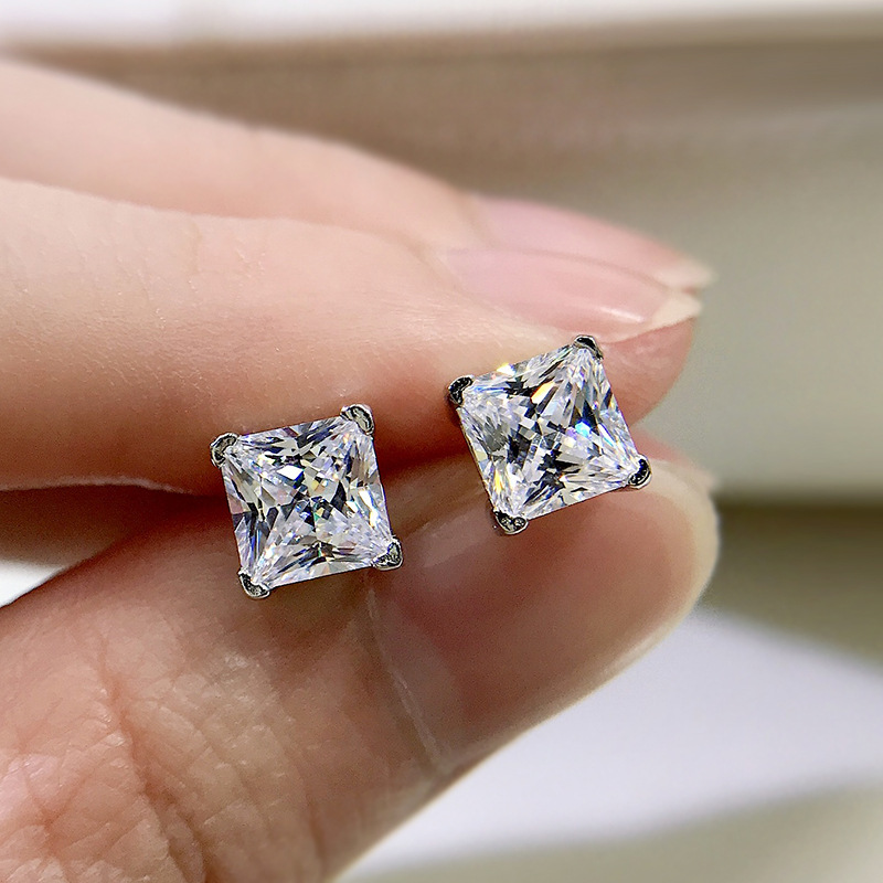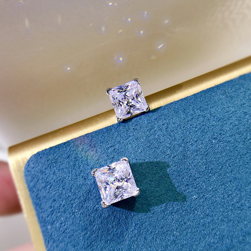 卓之凡新款高碳鑽925銀耳釘豔粉鑽簡約ins公主方6*6m冰花切耳飾女